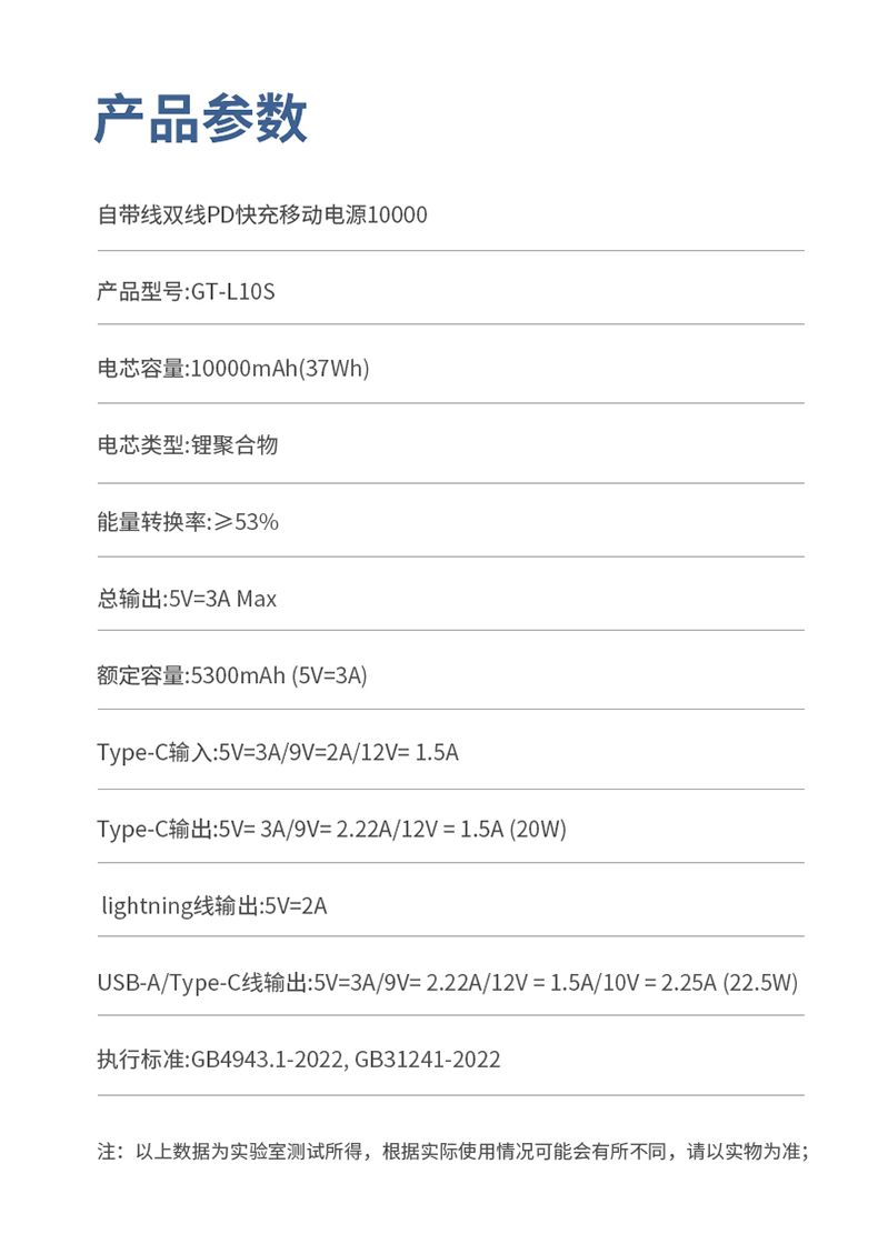 USB-A/Type-C线输出:5V-3A/9V-2.22A/12V-5A/10V-2.25A (22.5W)