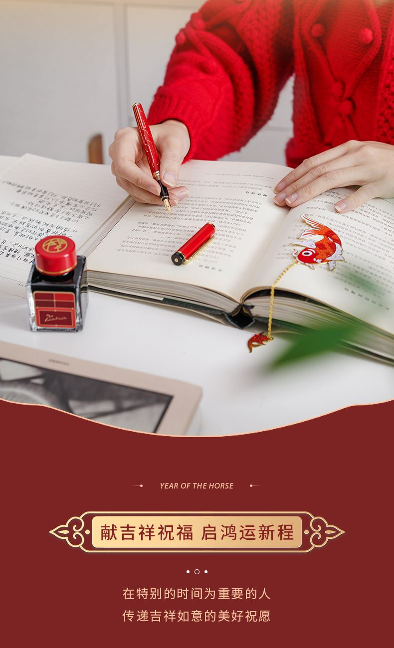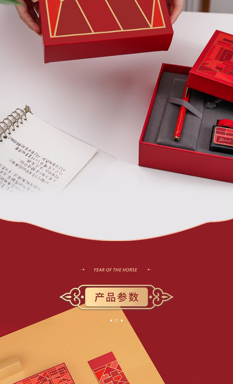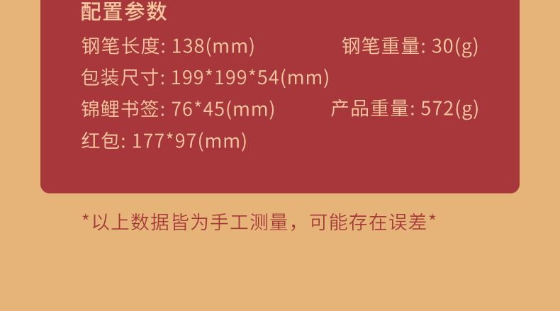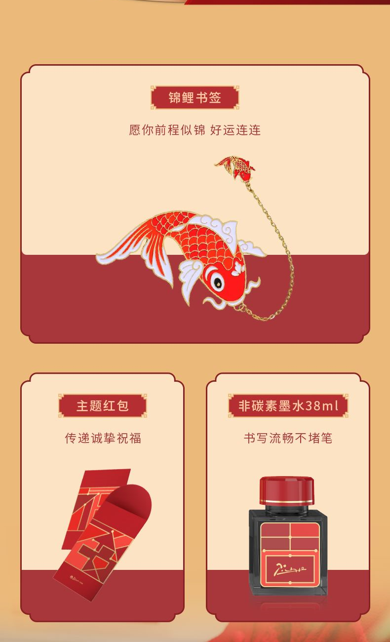 【包装配置】钢笔*1 、墨水40ml*1、锦鲤书签*1、红包*2、 包装盒*1、外彩盒*1、合格证*1、 说明书*1、礼品袋*1 开运中国红,祈愿红红火火 祥龙传鸿运,传递美好祝福 设计灵感源于星座文化 以星之点线绘制吉祥汉字 立体色块镶嵌,黄金比例呈现 展现丰富层次感与视觉冲击力 打造尊贵礼赠的不凡质感 星座灵感的点与线 排列组合于中国红笔身 寓意吉祥顺遂,福至万里。