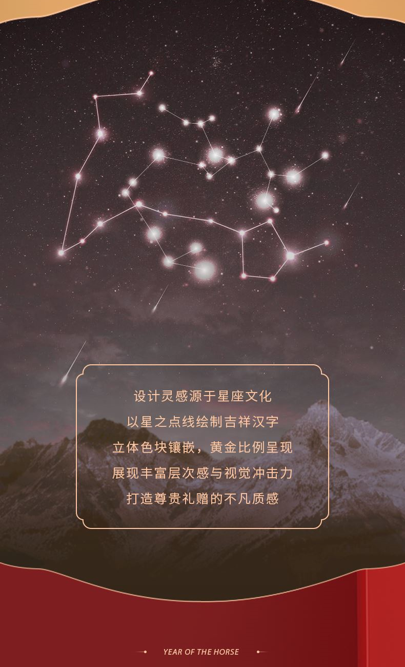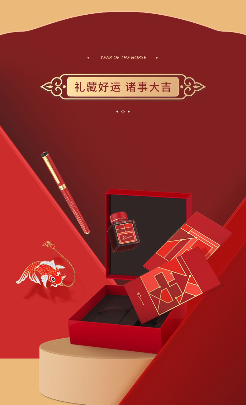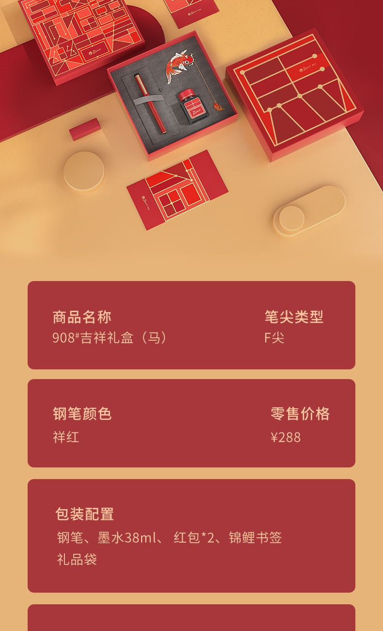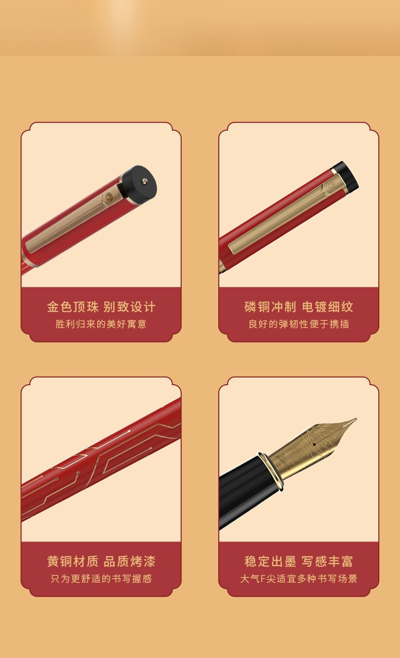 【包装配置】钢笔*1 、墨水40ml*1、锦鲤书签*1、红包*2、 包装盒*1、外彩盒*1、合格证*1、 说明书*1、礼品袋*1 开运中国红,祈愿红红火火 祥龙传鸿运,传递美好祝福 设计灵感源于星座文化 以星之点线绘制吉祥汉字 立体色块镶嵌,黄金比例呈现 展现丰富层次感与视觉冲击力 打造尊贵礼赠的不凡质感 星座灵感的点与线 排列组合于中国红笔身 寓意吉祥顺遂,福至万里。