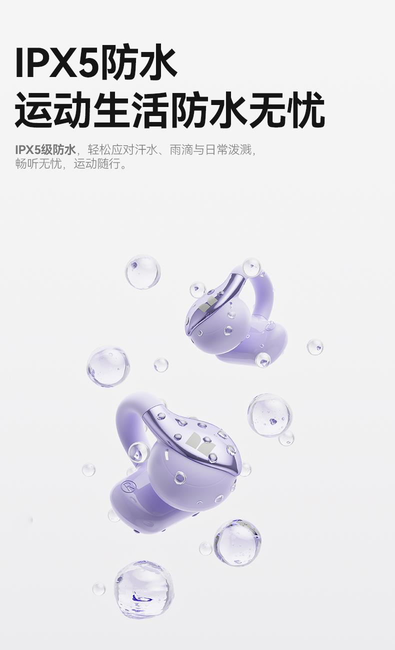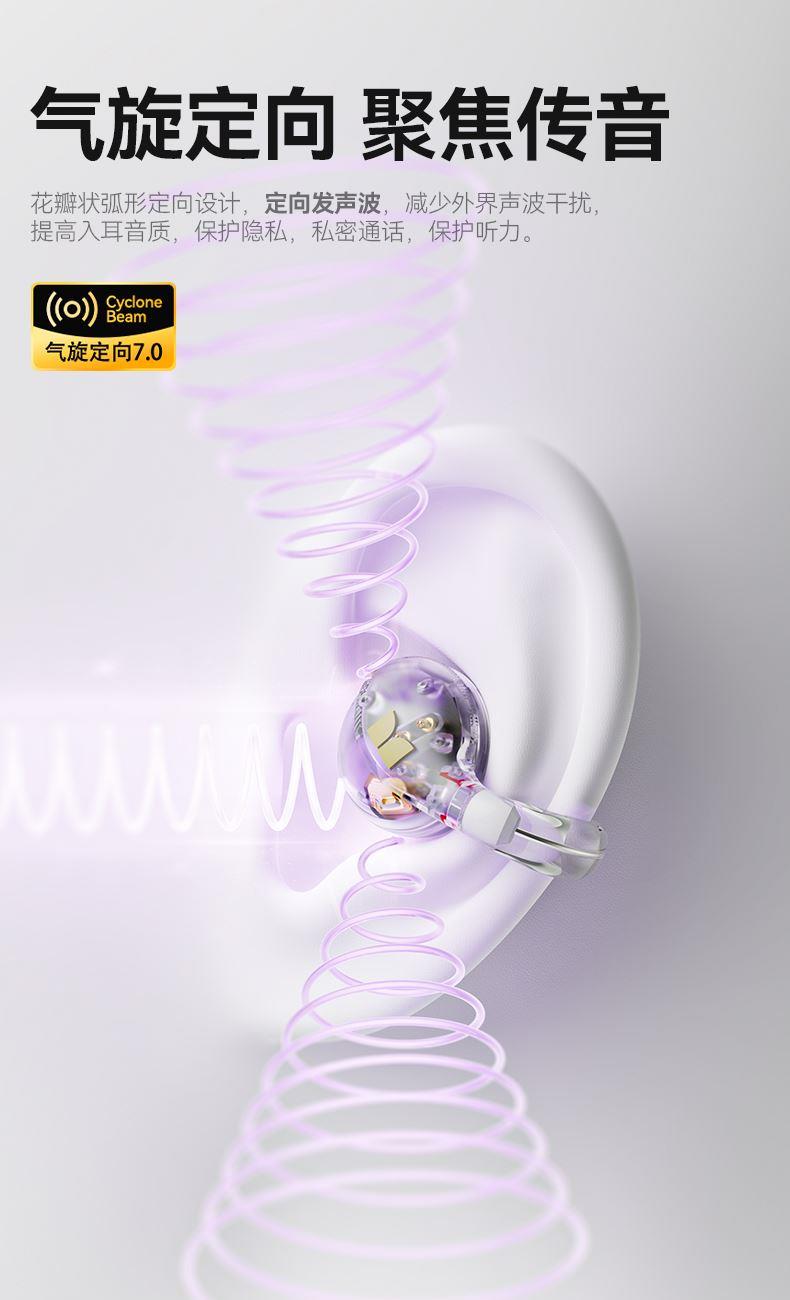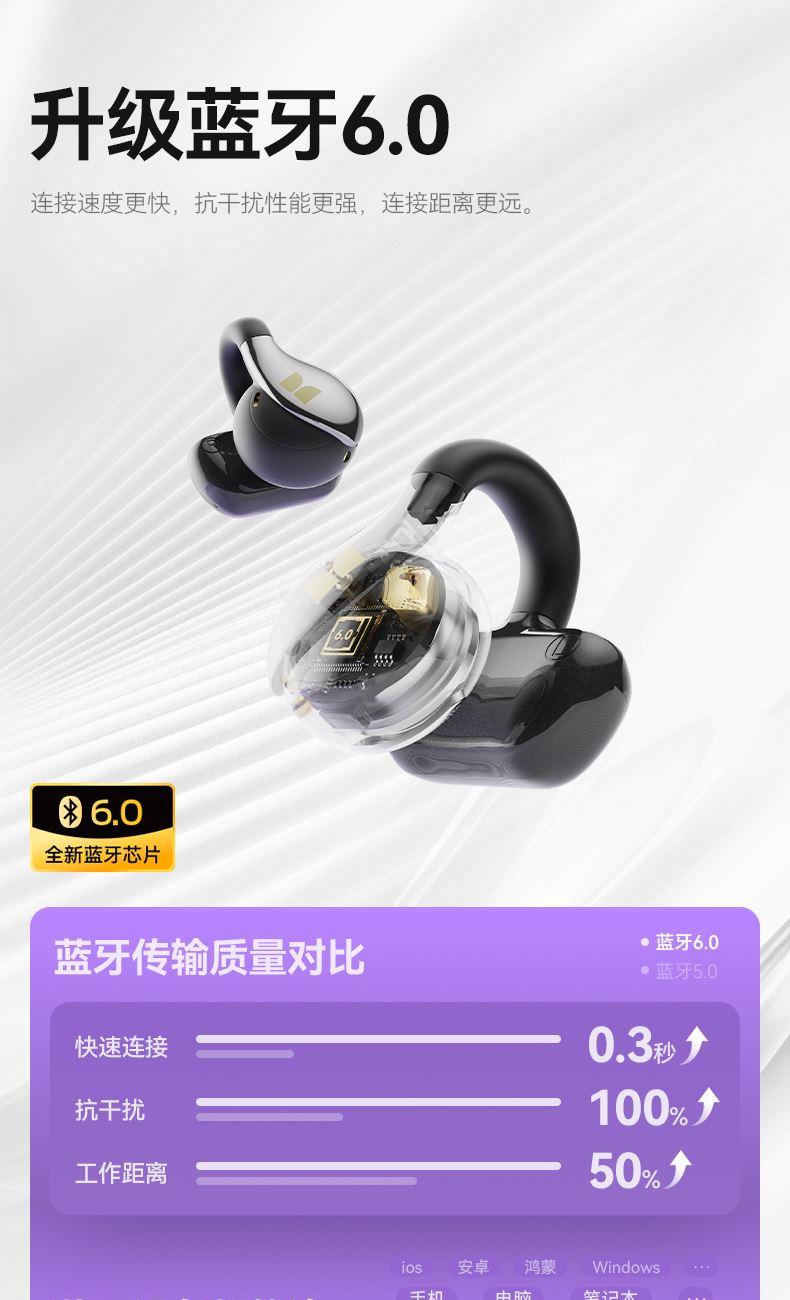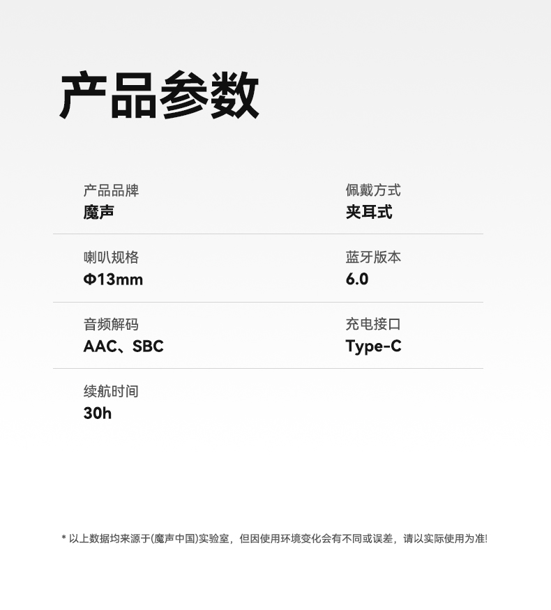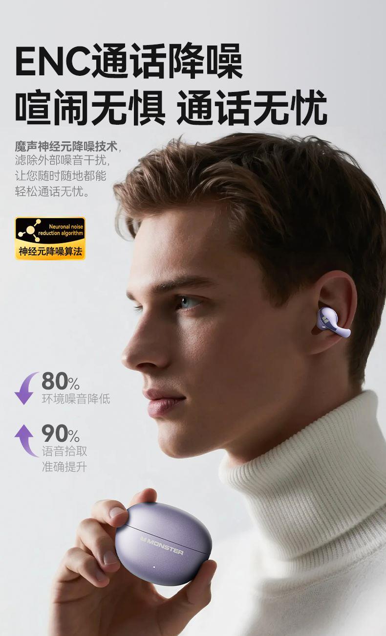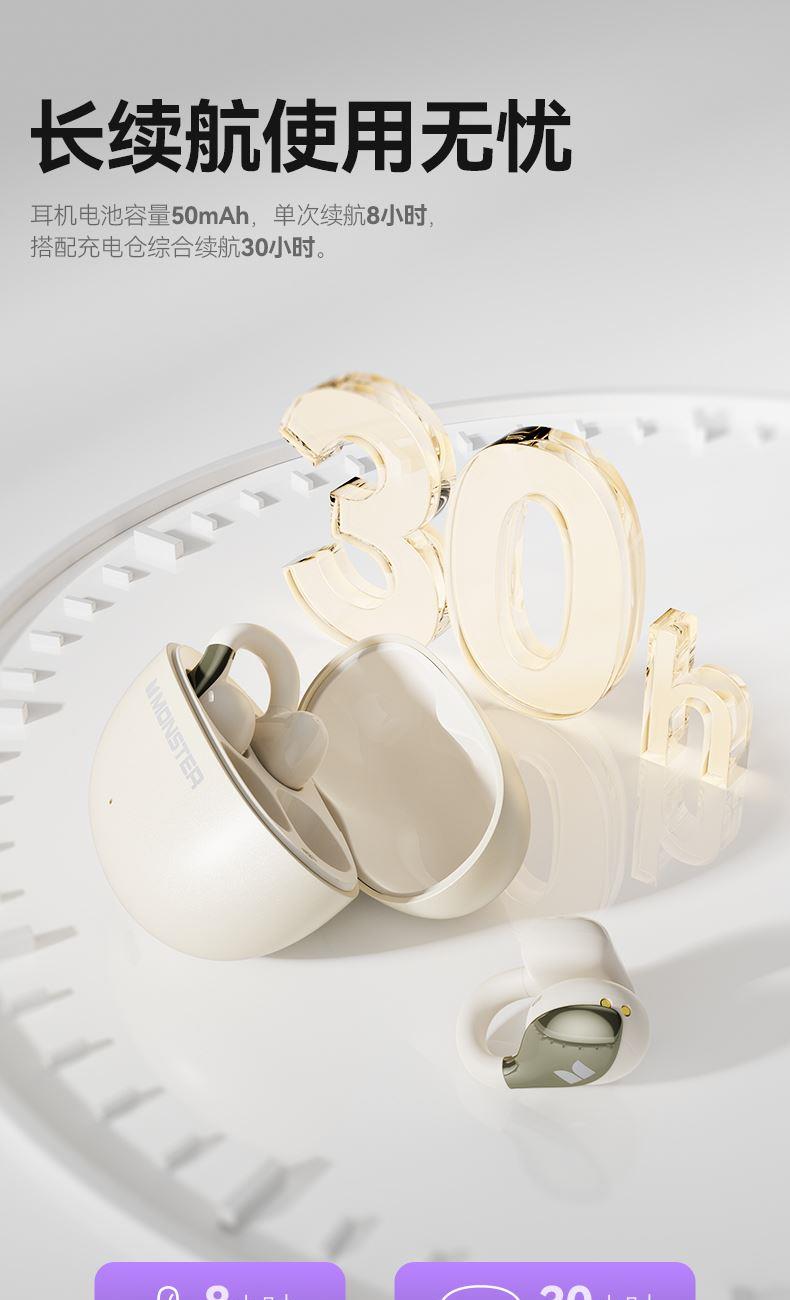 技术参数: 芯片方案:AB5656C3 蓝牙版本:6.0 喇叭规格: Ф13mm(PET+PU双层复合膜) 音频解码:AAC、SBC 播放时长:约7小时(50%音量) 通话时长:约6小时(50%音量) 电池规格:耳机50mAh,充电仓300mAh 充电时长:耳机约1.5小时,充电仓约2小时 充电次数:仓给耳机充电约2次 充电接口:Type-C(5V/1A) 防水等级:耳机IPX5,充电仓不防水 魔声在45年的耕耘中获得了全球的认可,获全球大奖无数,以及很多音乐、体育和名人的支持。 • 开放式耳夹设计,独立防漏音的气旋定向设计,舒适不入耳,聆听更安全 • 独立防漏音的气旋定向设计,大幅提升通话私密畅听 • 稳固配带不挑耳,结合不入耳的佩戴方式,更通透不压迫,如羽毛般超轻无感; • 13mm,双层复合膜片,超大单元,秒回音乐现场; • ENC语音通话,拾取语音内容、降低环境噪音,呈现更为清晰的通话效果。 • 国际6.0蓝牙通信技术,稳定连接音画同步超低延迟; • 耳机单次连续使用7小时左右,配合便携储能仓的续航高达21小时左右; • 一键唤醒手机语音助理,触摸按键,识别指令,操控随心掌握; • 耳机IPX5防水防汗运动无惧
