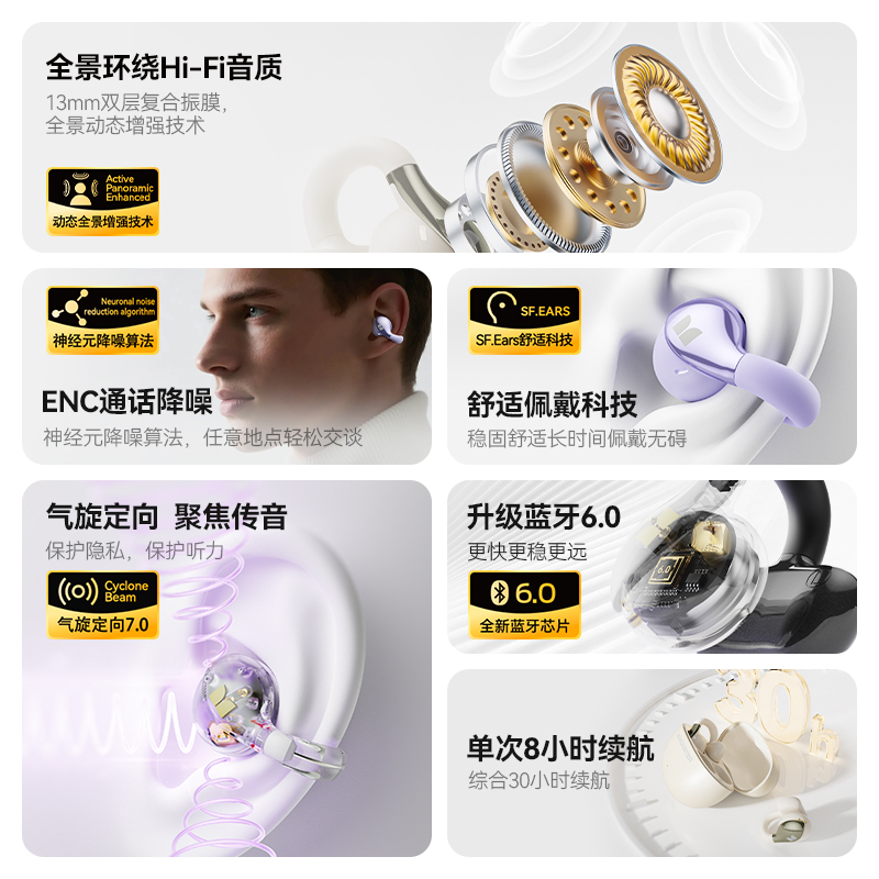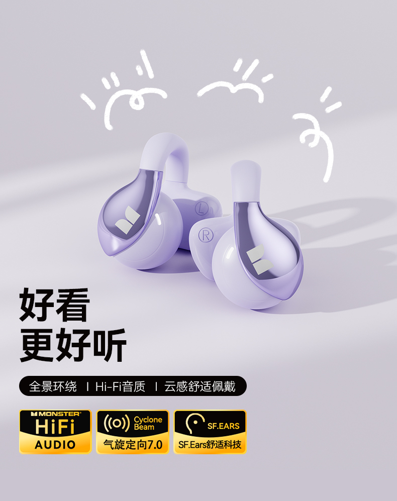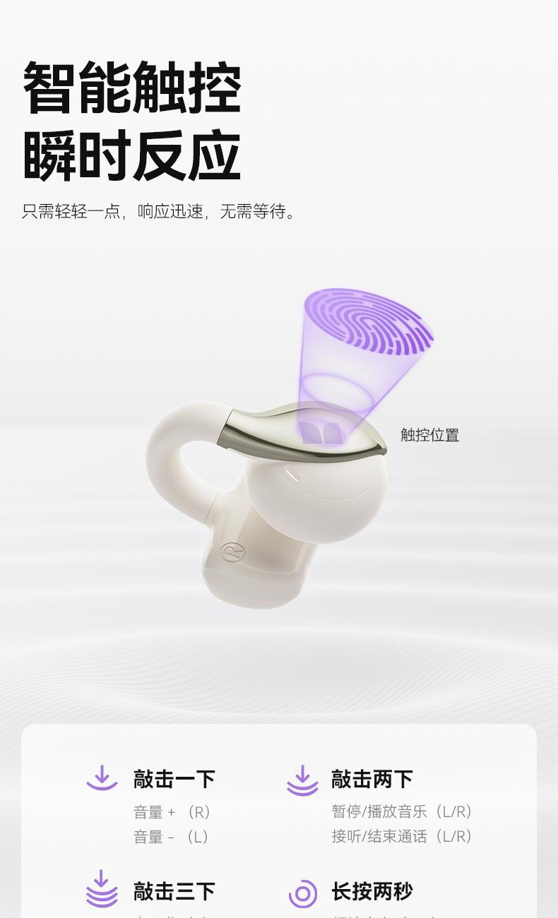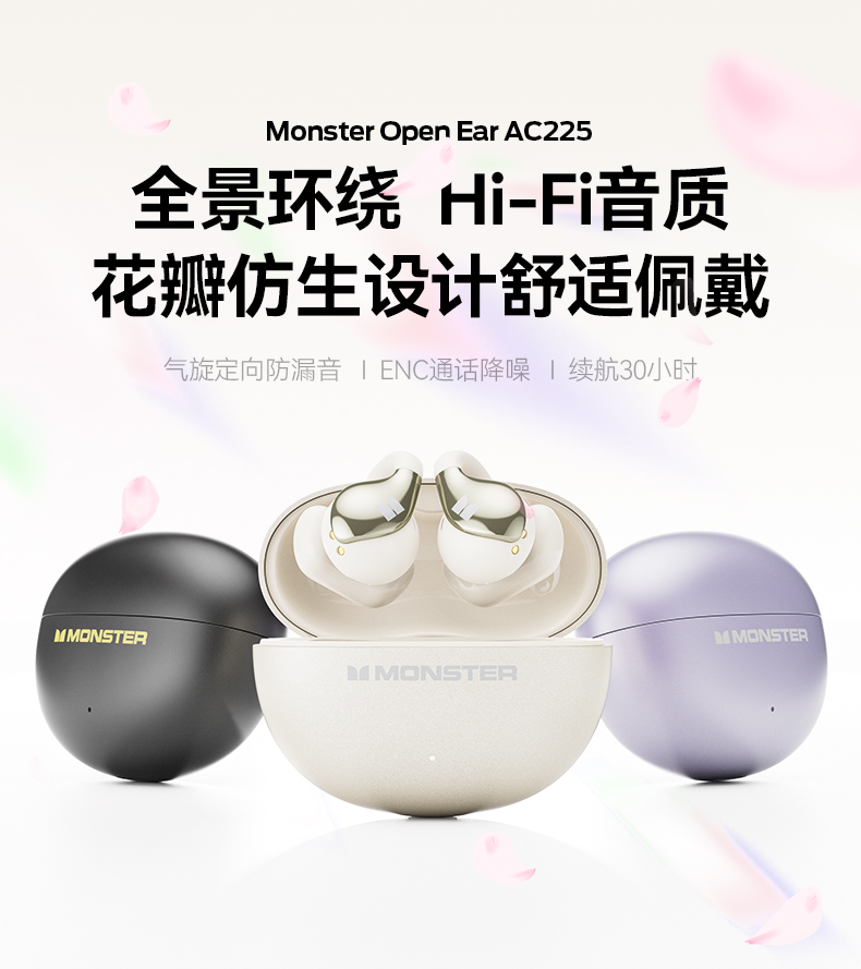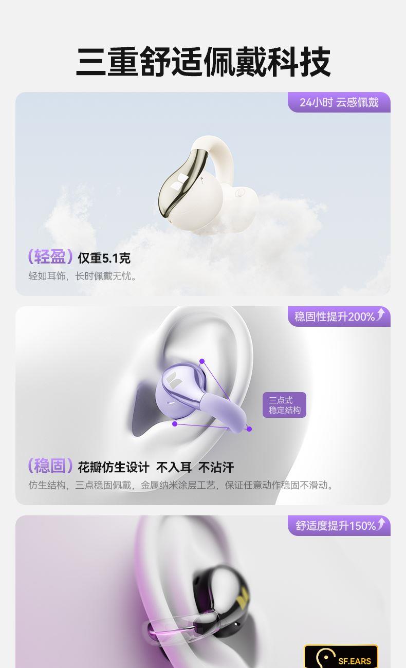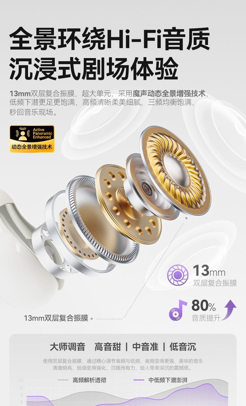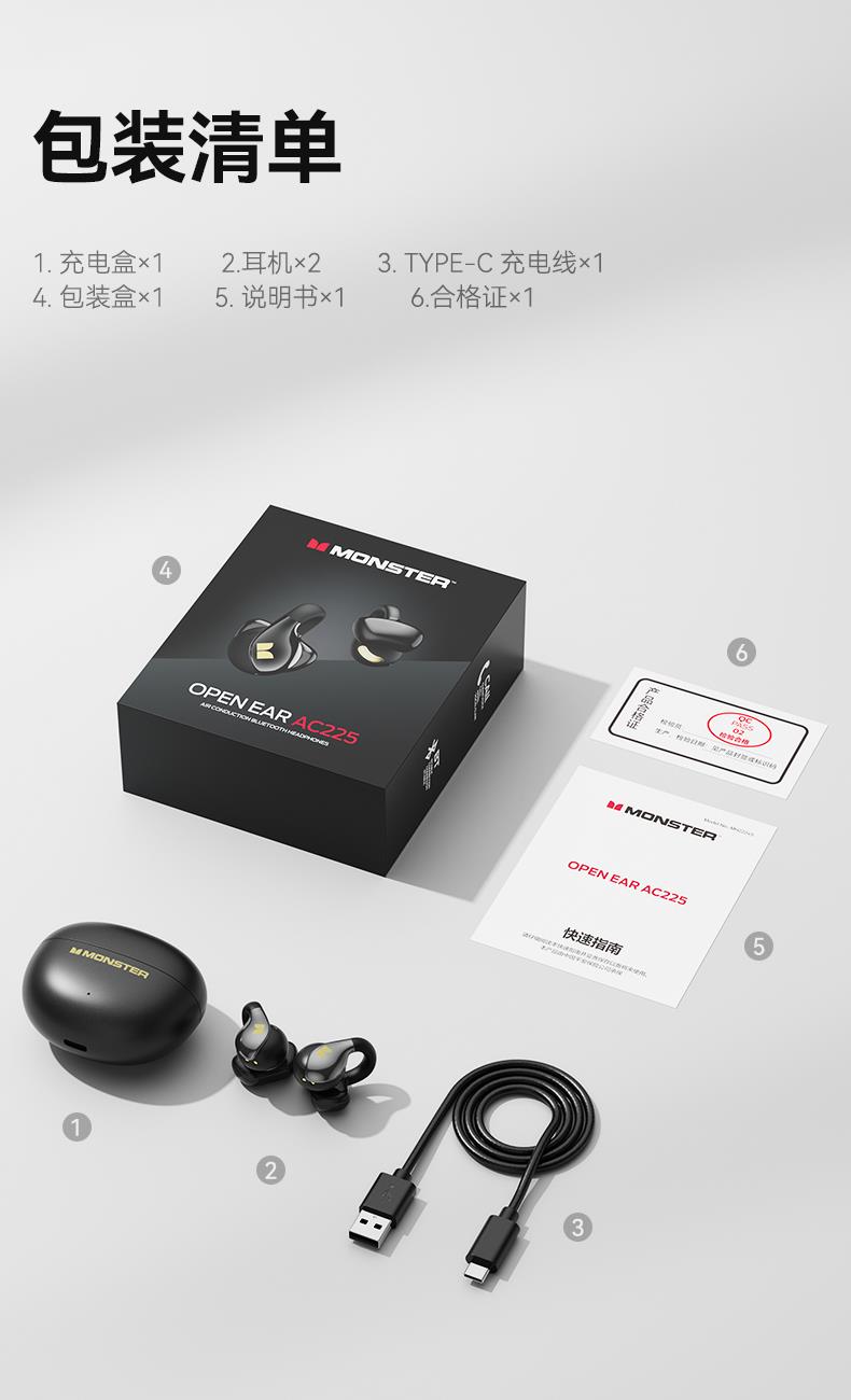 技术参数: 芯片方案:AB5656C3 蓝牙版本:6.0 喇叭规格: Ф13mm(PET+PU双层复合膜) 音频解码:AAC、SBC 播放时长:约7小时(50%音量) 通话时长:约6小时(50%音量) 电池规格:耳机50mAh,充电仓300mAh 充电时长:耳机约1.5小时,充电仓约2小时 充电次数:仓给耳机充电约2次 充电接口:Type-C(5V/1A) 防水等级:耳机IPX5,充电仓不防水 魔声在45年的耕耘中获得了全球的认可,获全球大奖无数,以及很多音乐、体育和名人的支持。 • 开放式耳夹设计,独立防漏音的气旋定向设计,舒适不入耳,聆听更安全 • 独立防漏音的气旋定向设计,大幅提升通话私密畅听 • 稳固配带不挑耳,结合不入耳的佩戴方式,更通透不压迫,如羽毛般超轻无感; • 13mm,双层复合膜片,超大单元,秒回音乐现场; • ENC语音通话,拾取语音内容、降低环境噪音,呈现更为清晰的通话效果。 • 国际6.0蓝牙通信技术,稳定连接音画同步超低延迟; • 耳机单次连续使用7小时左右,配合便携储能仓的续航高达21小时左右; • 一键唤醒手机语音助理,触摸按键,识别指令,操控随心掌握; • 耳机IPX5防水防汗运动无惧