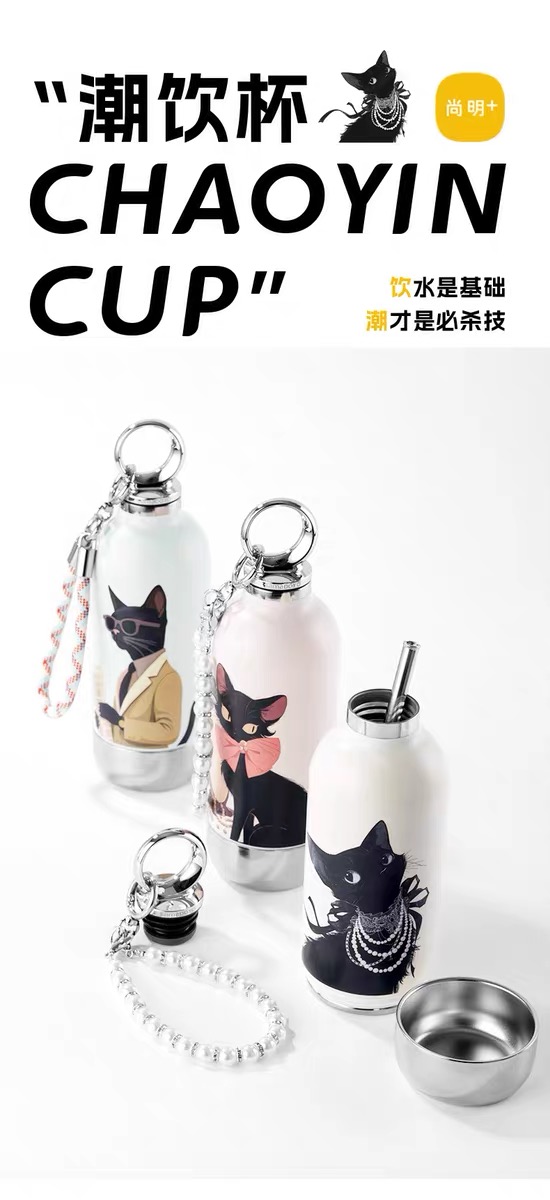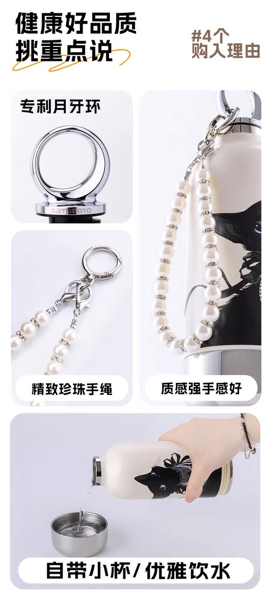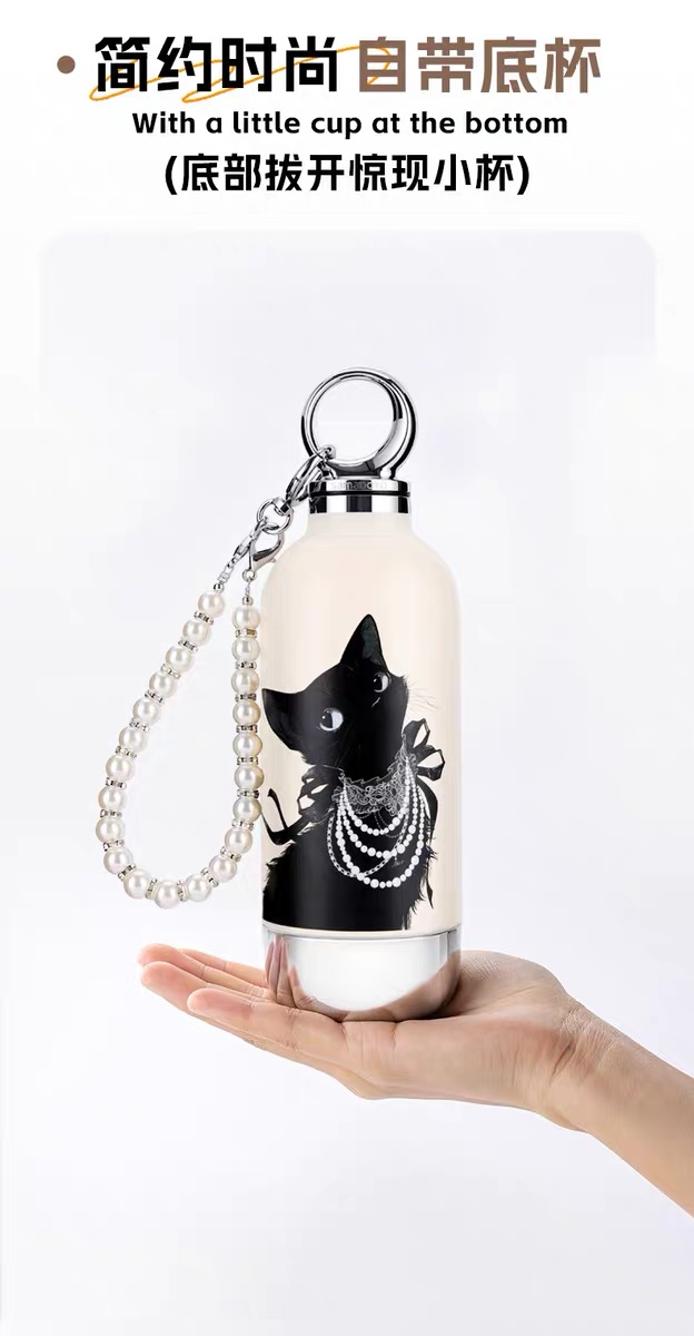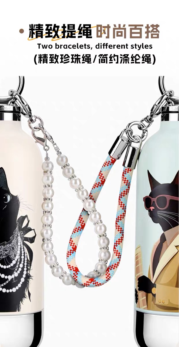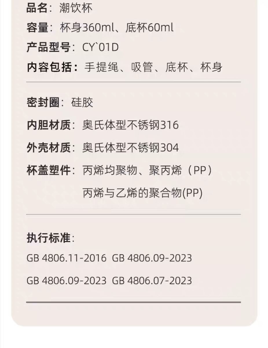 CY01潮饮杯 杯身360mL,底杯60mL 六层锁温,长效保温,保冷也保热 三色可选 自带底杯 弹出吸管 专.利月牙圆环杯盖 316不锈钢电解内胆 时尚手绳