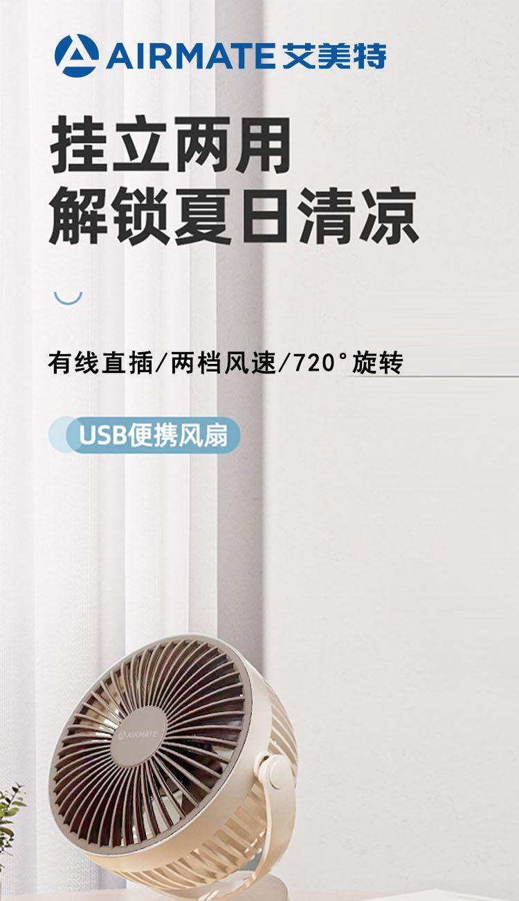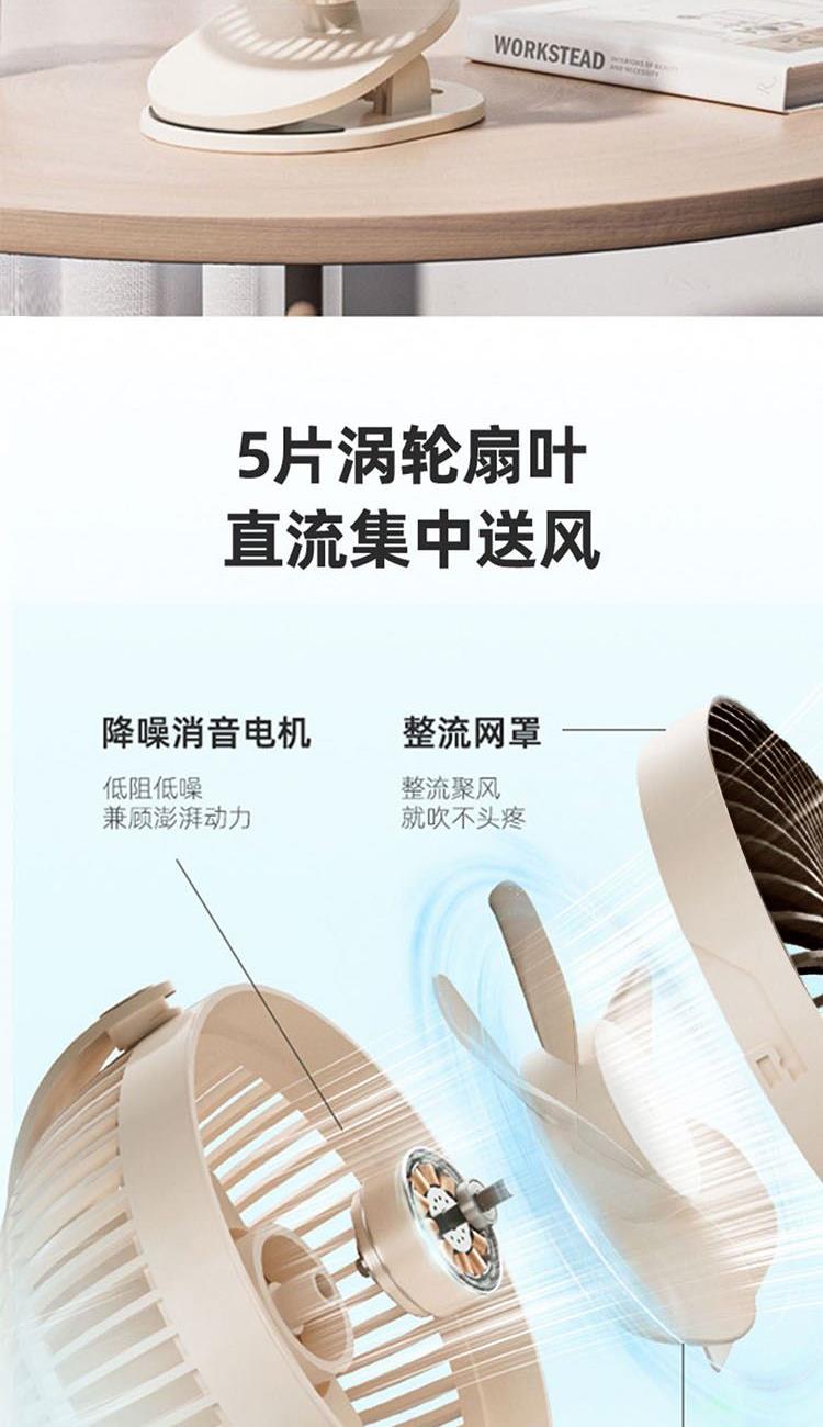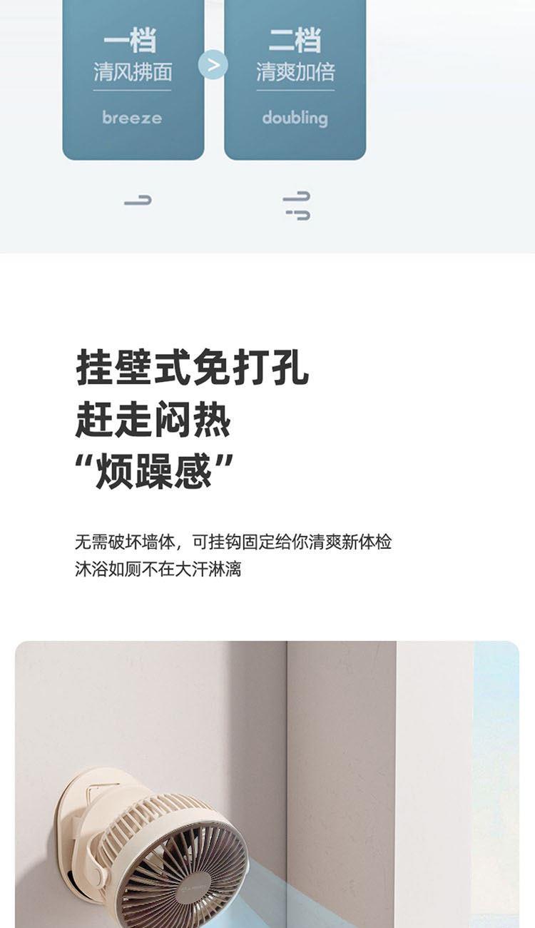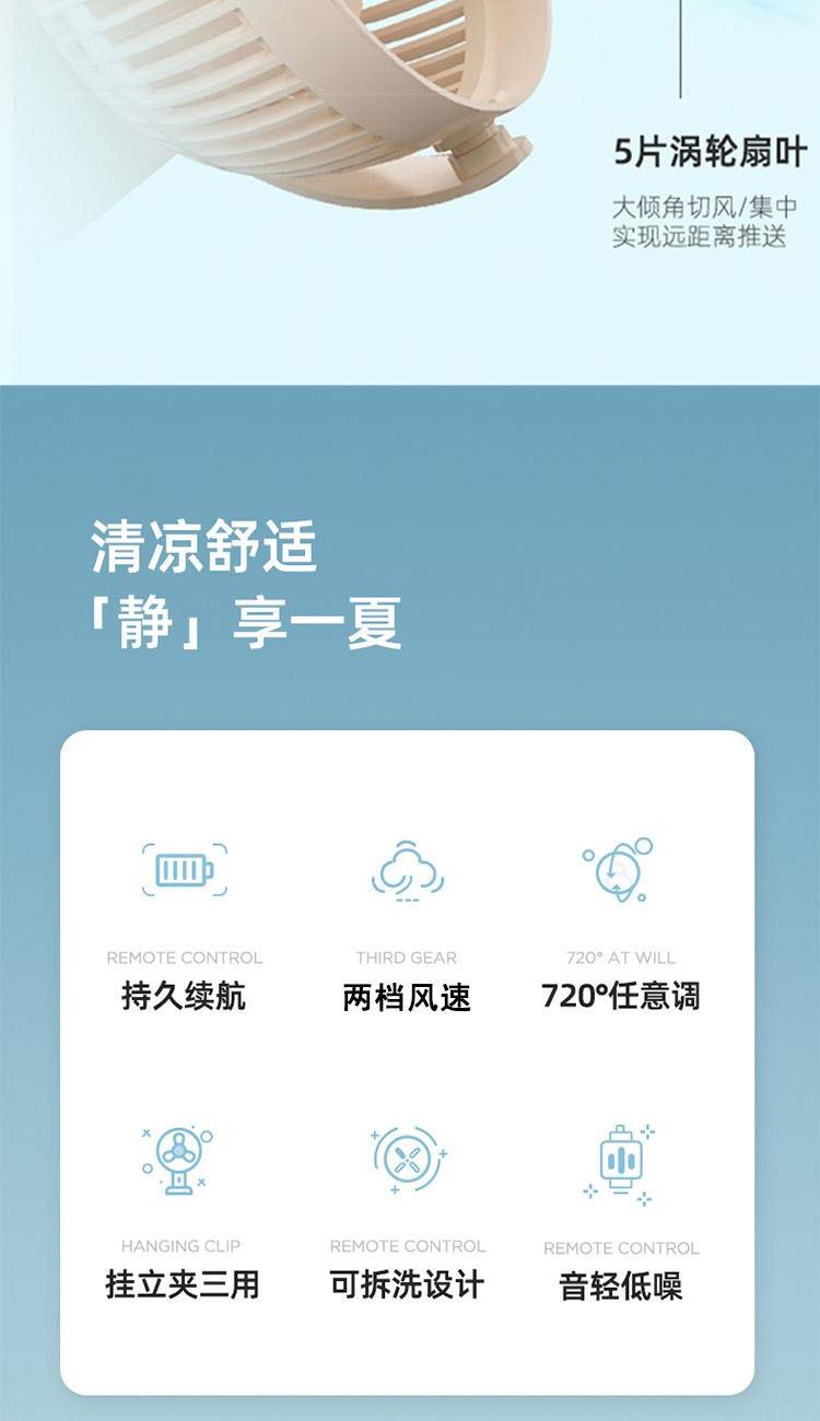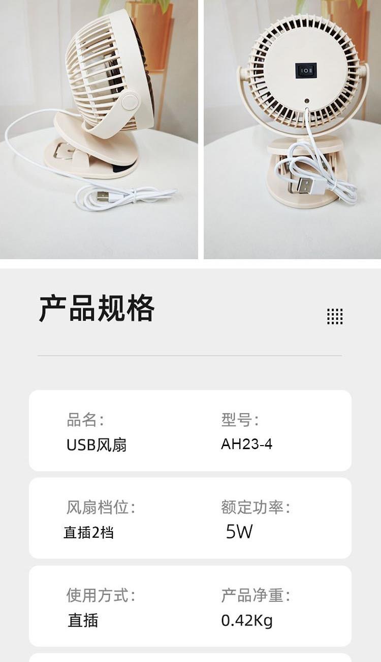 风扇档位:直插2档 额定功率:5W 产品净量:0.42kg 电源线长:直插约120cm(含机内部 产品尺寸:130*95*185mm 1、挂立两用解锁夏日清凉 2、两档风速/720°旋转 3、5片涡轮扇叶直流集中送风