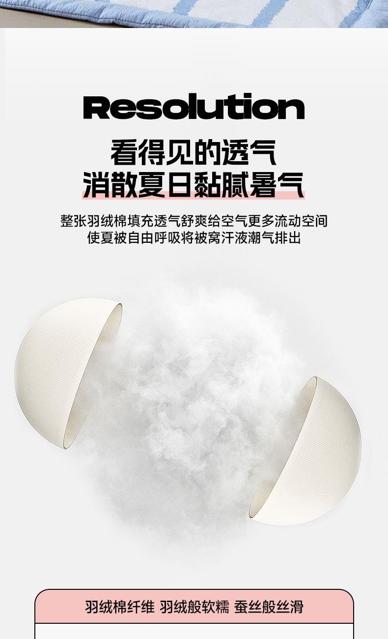规格:200*230cm 面料:泡泡纱 填充:羽丝棉 克重:1400g 执行标准:GB/T22796-2021 安全类别:GB18401-2010 B类 1.甄选优质泡泡纱面料,纤维柔软蓬松,手感柔软,拉力强度高,织物贴身舒适; 2.填充物选用优质A类整张羽丝棉纤维手感犹如羽绒般,轻盈蓬松,柔软舒适 3.采用单边暗合缝制,定点绗缝工艺,日式简约设计风格,简约时尚,让您感受科技生态睡眠!