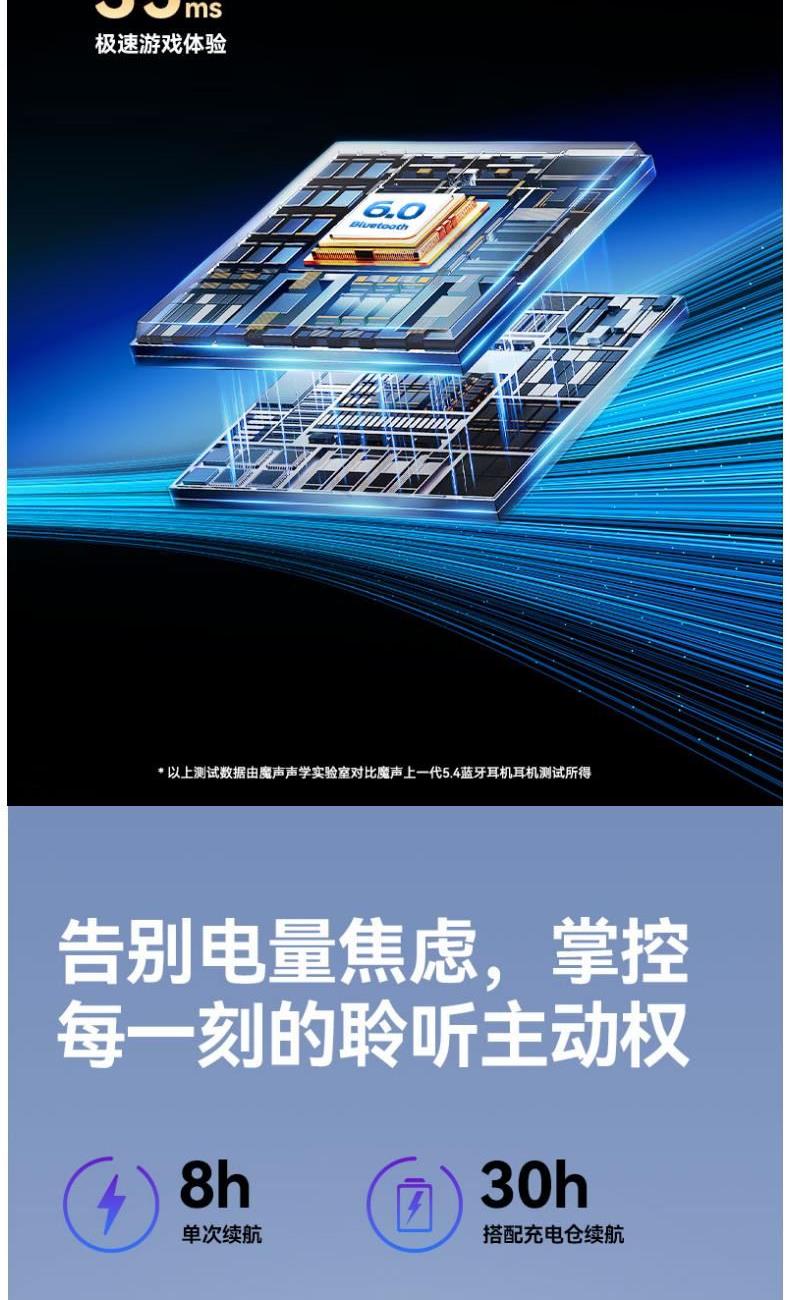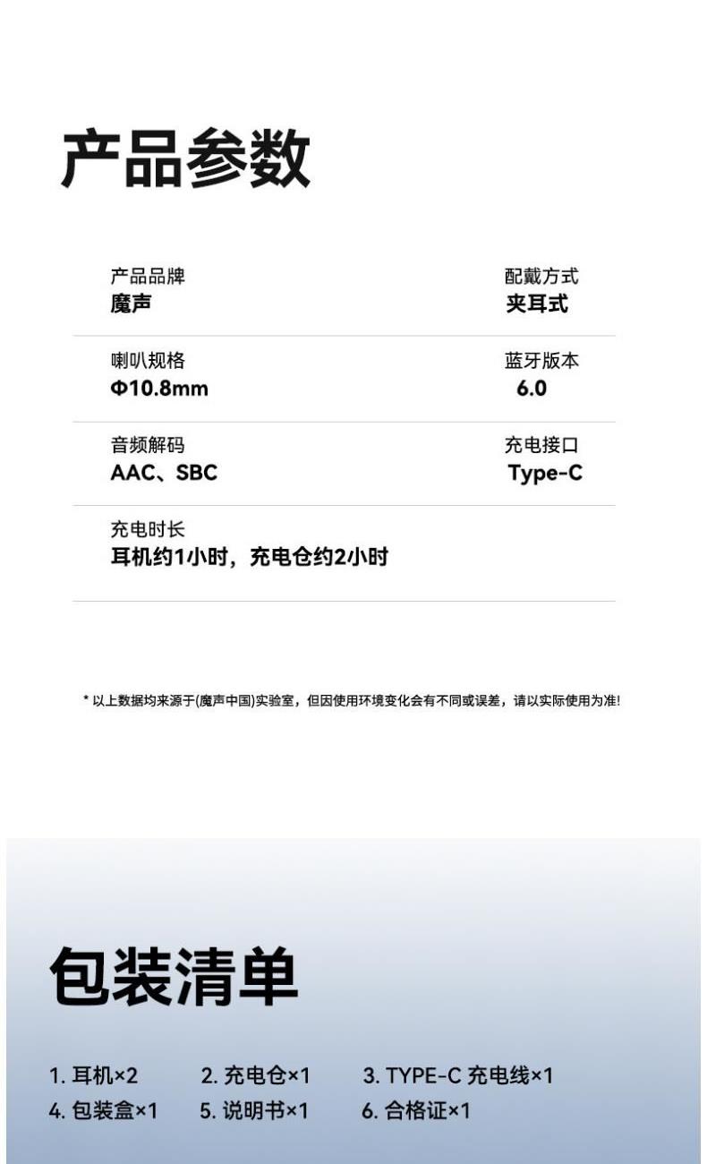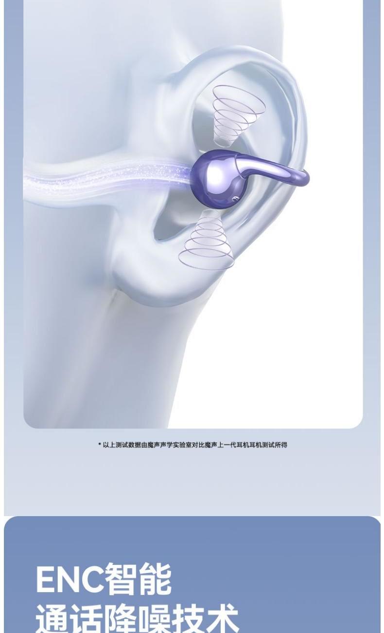 芯片方案:杰理AC7003D4 蓝牙版本:6.0 喇叭规格: Ф10.8mm 音频解码:AAC、SBC 播放时长:约6小时(50%音量) 通话时长:约5小时(50%音量) 电池规格:耳机40mAh,充电仓350mAh 充电时长:耳机约1小时,充电仓约2小时 充电次数:仓给耳机充电约3次 充电接口:Type-C(5V/1A) 防水等级:耳机IPX5,充电仓不防水 • 蓝牙6.0,高能内“芯”时刻畅享,传输快,功耗低 • 8h单次续航,30h充电舱续航,告别电量焦虑 • ENC智能通话降噪技术,4.4g天生轻盈 零感佩戴 • IPX5级防水,防水新境界 • 暮光紫,幽雾黑,冰泉蓝,多配色可选