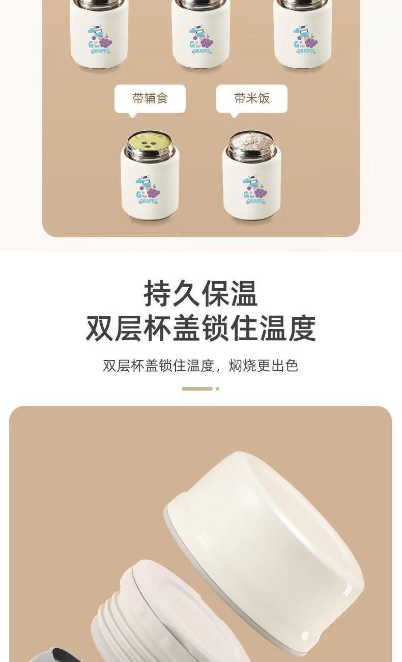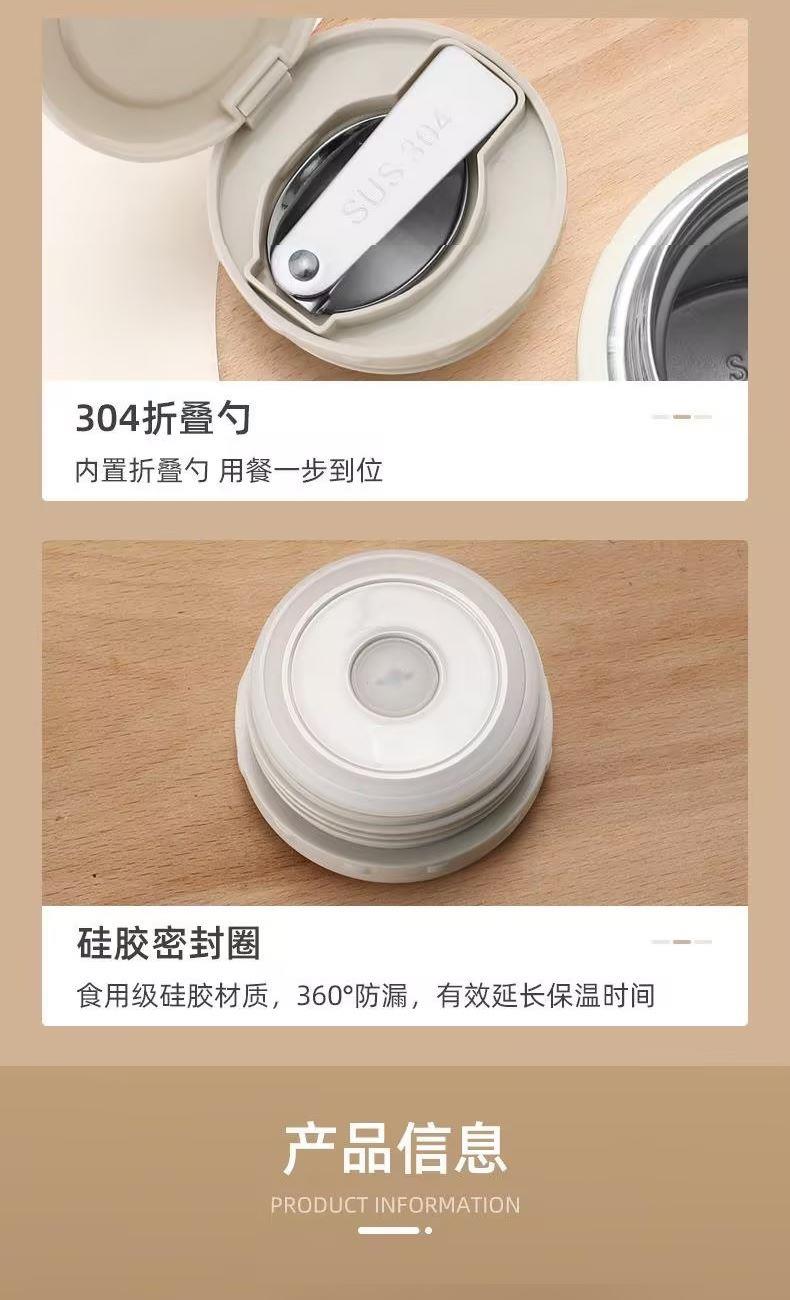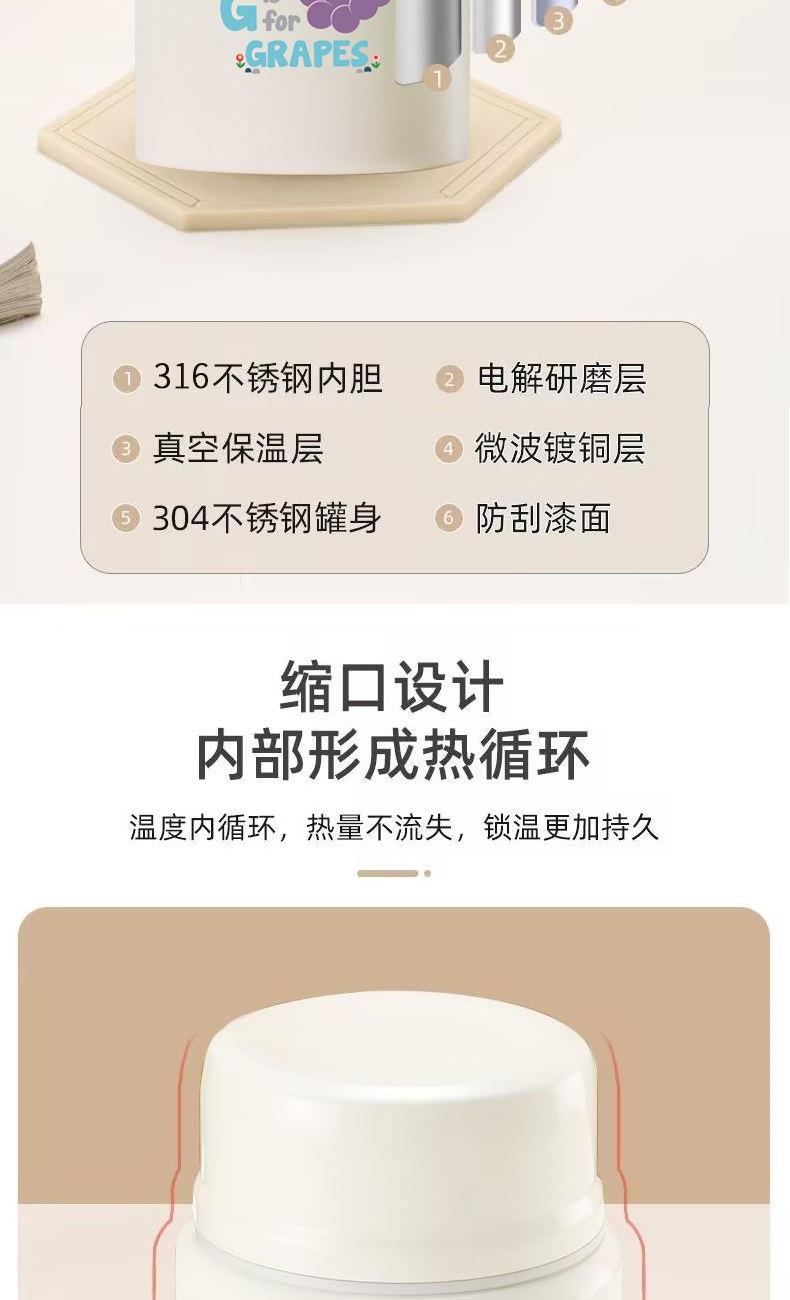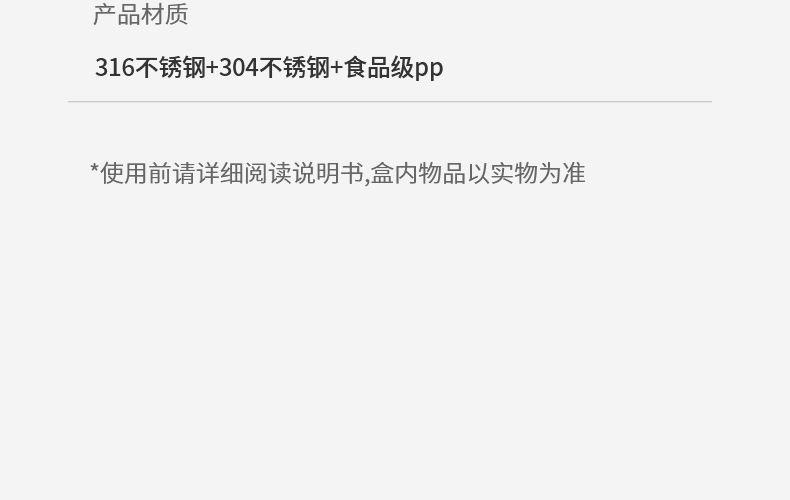 容 量 :500ml 材 质 :316不锈钢+304不锈 钢+食品级pp 颜 色 :元气白 包 装 尺 寸:110*110*170mm 装 箱 数 :30/pcs 304不锈钢材质,饮水更放心 采用食品级pp+食品级硅胶,干净卫生 多用使用场景,室内户外郊游使用