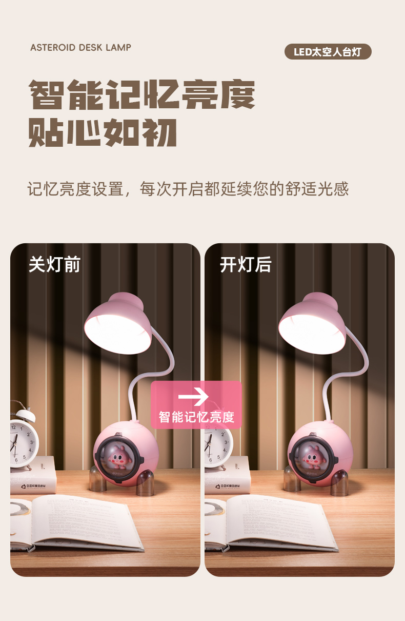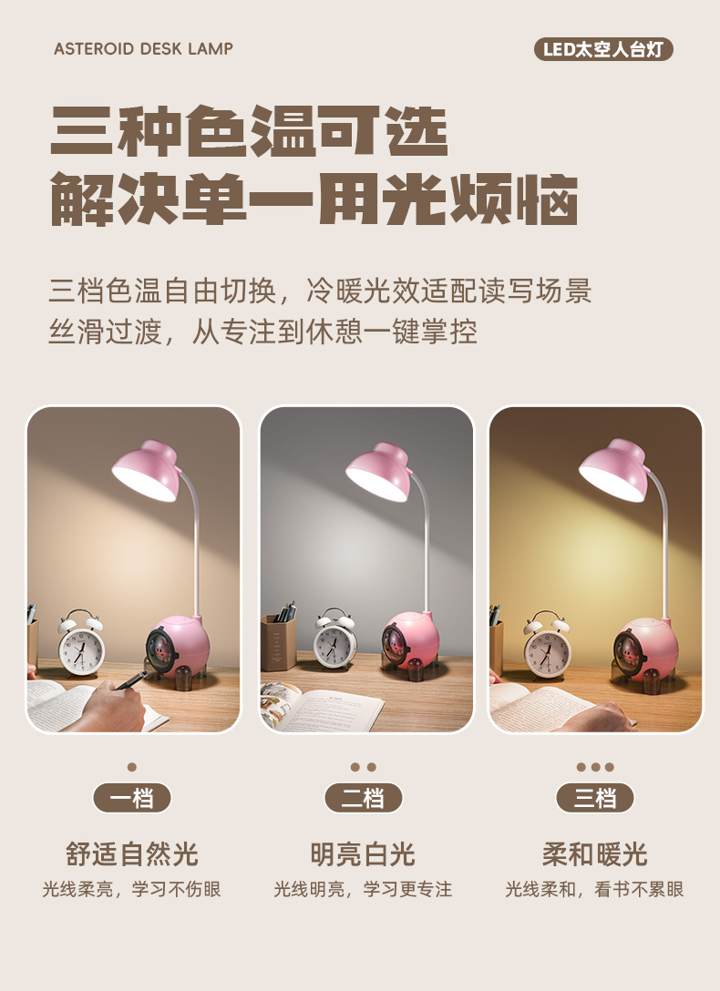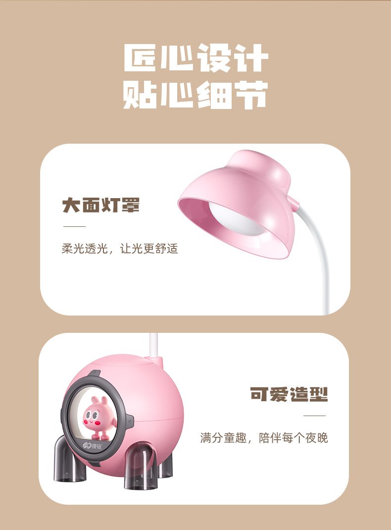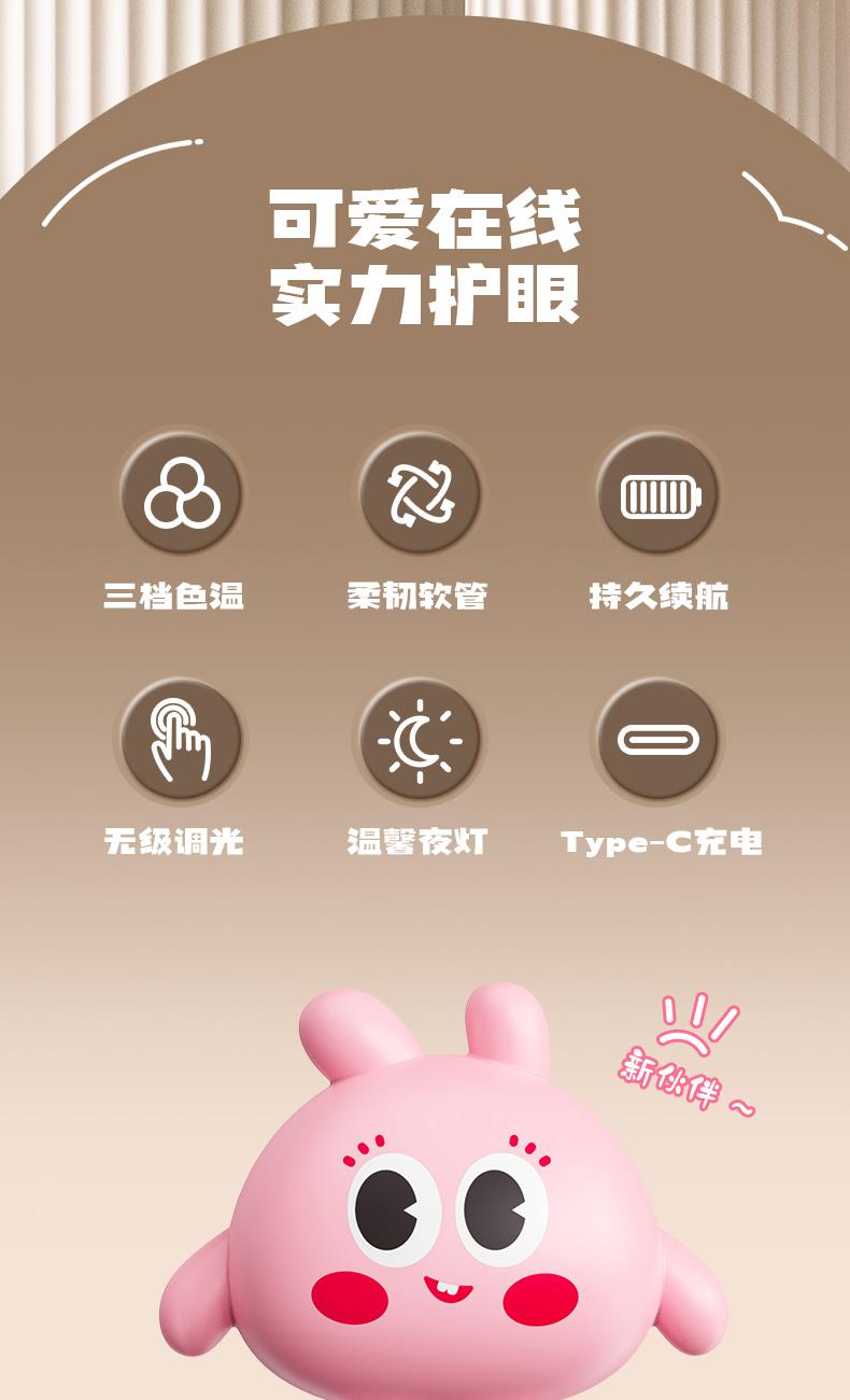 三档色温,冷暖光效适配读写场景; ·充足照明,大灯罩均匀发光; ·持久续航,稳定陪伴; ·无可视频闪,减少用眼伤害; ·无级调光,随心调节亮度; ·柔韧软管,360°随心调节 ·Type-C充电,随充随用; ·智能记忆亮度,贴心如初; ·柔光小夜灯,氛围感+10000; ·国标VO阻燃,防火更有保障;