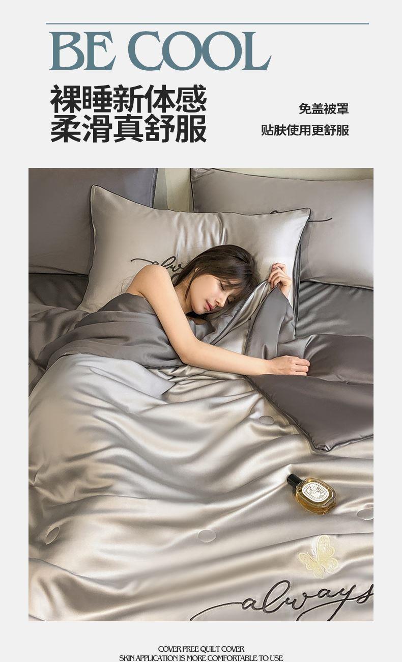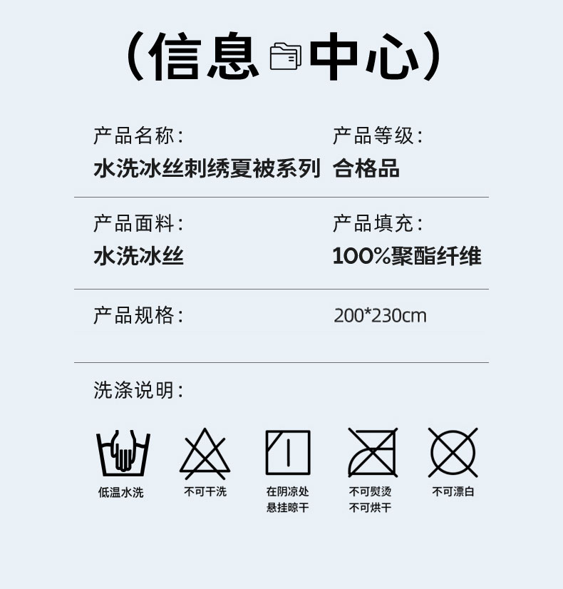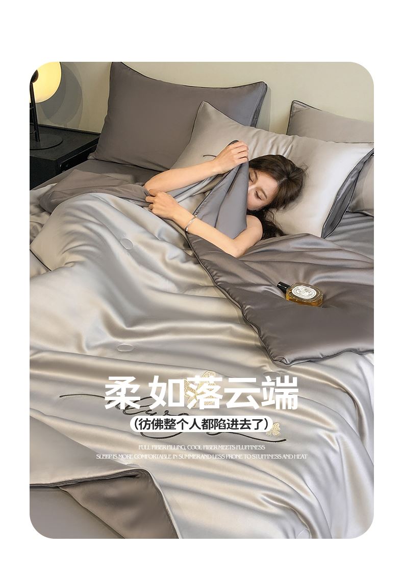 面料:水洗真丝(聚酯纤维) 填充:聚酯纤维(整张棉) 规格:200cm*230cm 水洗真丝丝面料,凉滑触感,曼妙柔滑媲美真丝质地,肌肤沉浸式奢柔呵护。