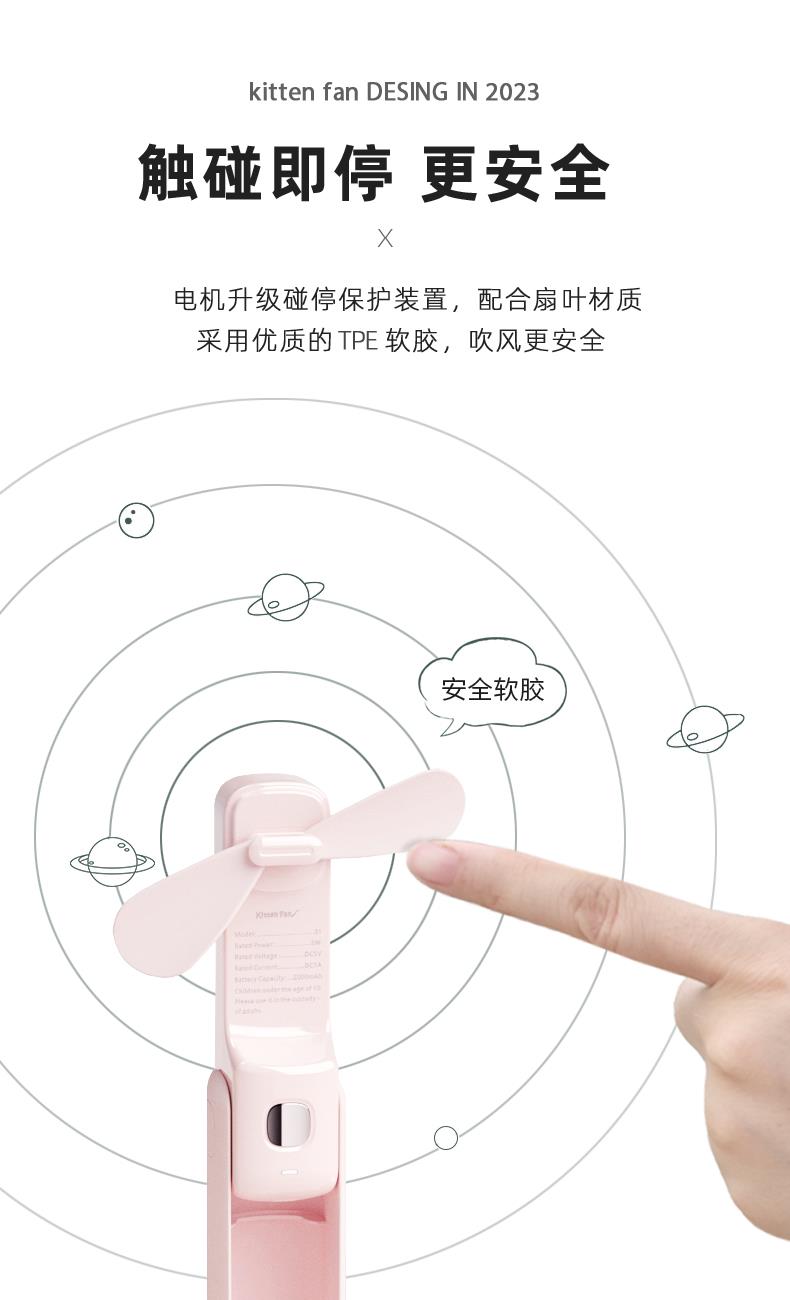 *折叠小巧、风扇+手电筒 *三档风力、2000mAh *TPE软胶扇叶、更安全 *支持小批量定制LOGO