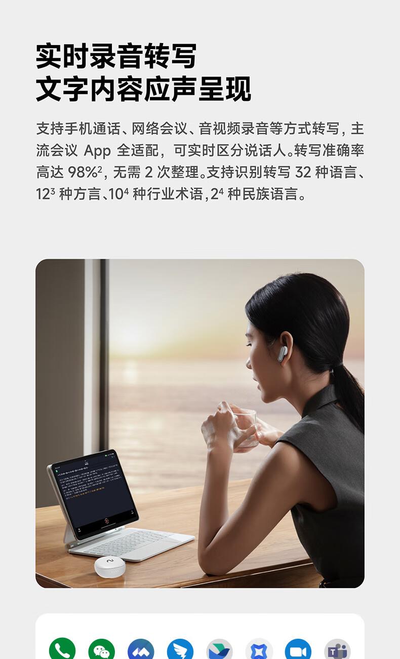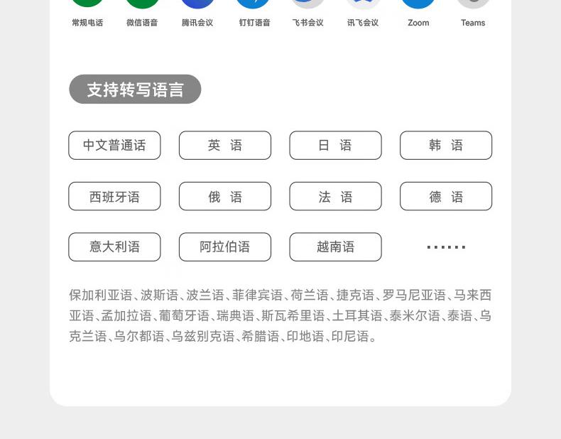 4、实时录音转写:支持手机通话、网络会议、音视频录音等方式转写,主流会议 App 全适配,可实时区分说话人。转写率高达 98%,无需 2 次整理。支持识别转写 32 种语言、123 种方言、104 种行业术语,24 种民族语言。