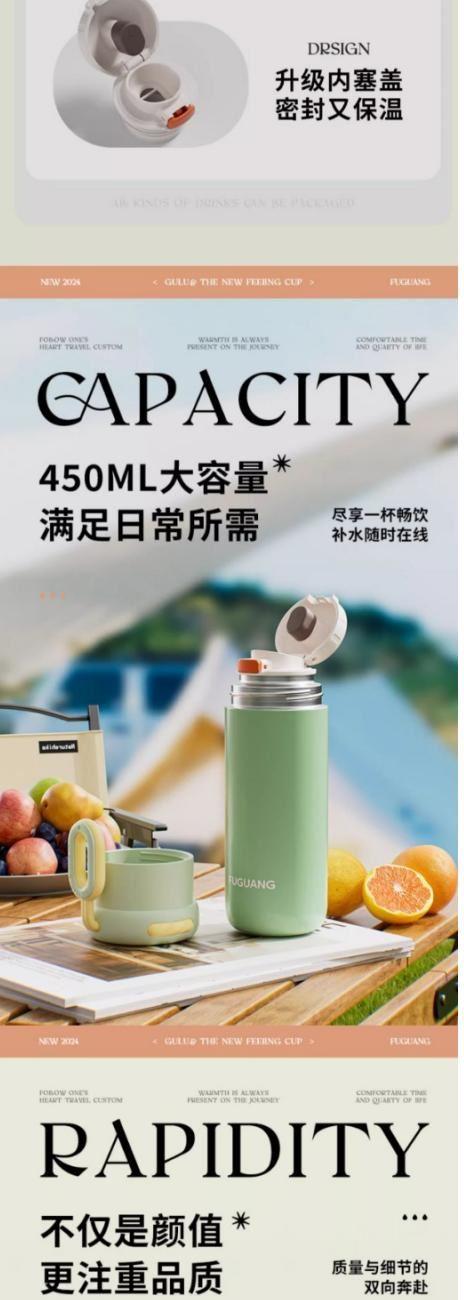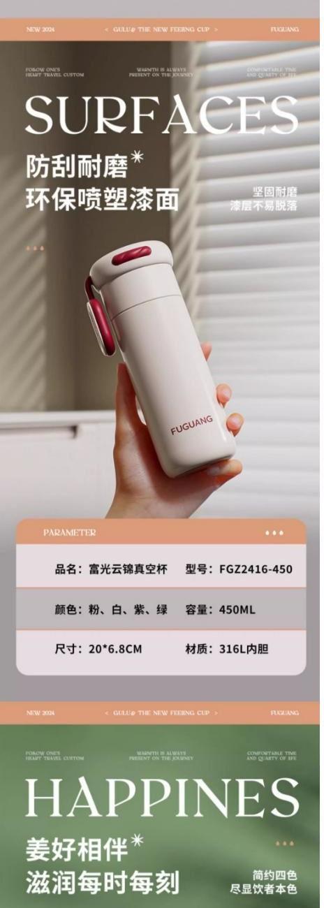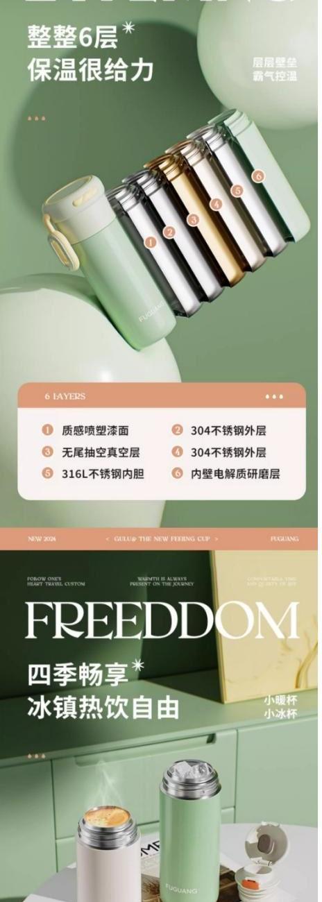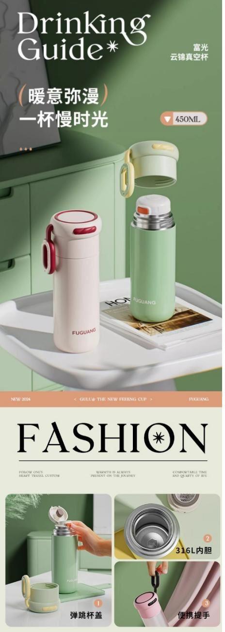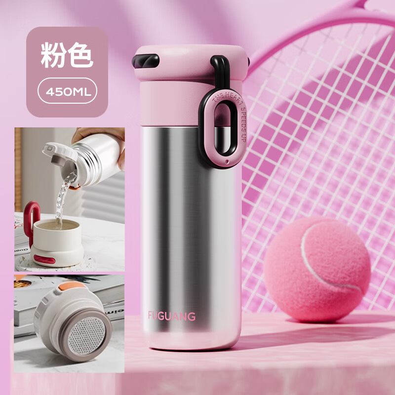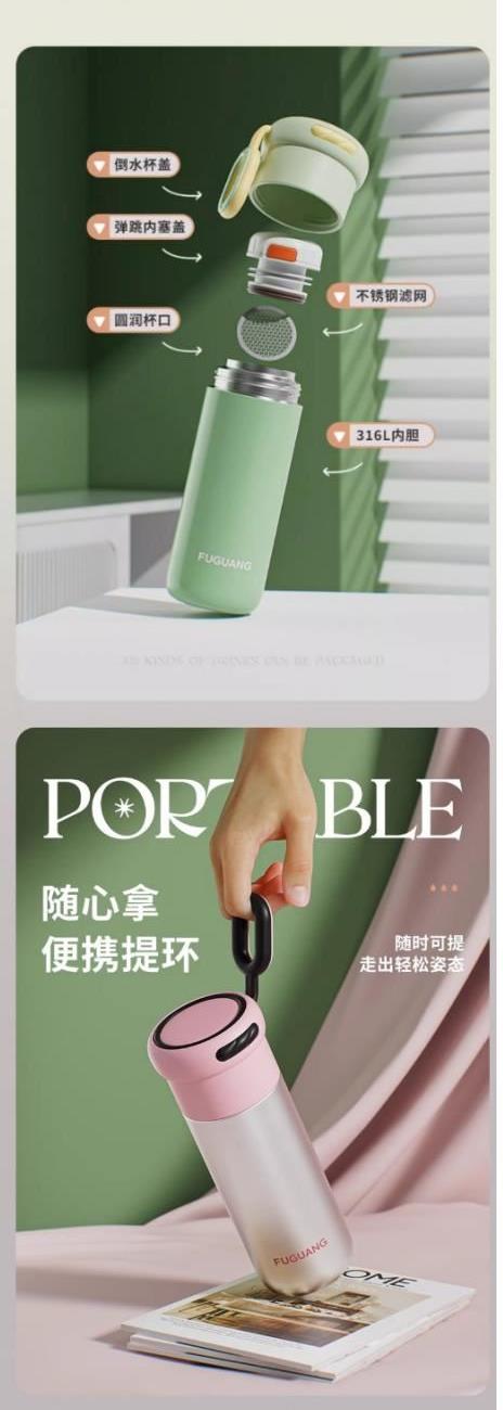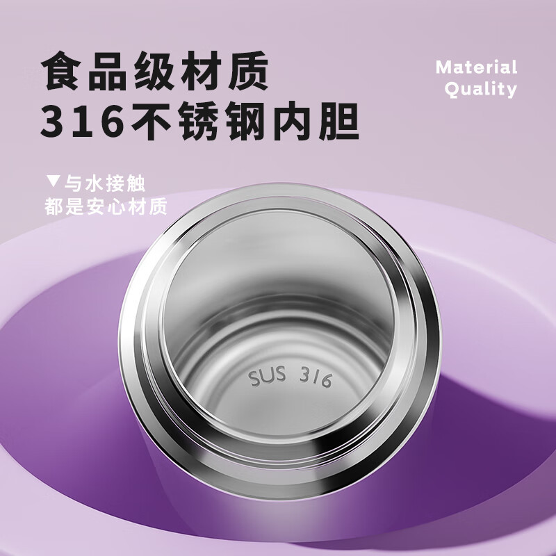 颜色:白色 粉色 紫色 绿色 容量:450ml 尺寸:68*200mm 材质:316奥氏体不锈钢内胆,无尾真空超长保温。 超轻杯身设计,独特加宽硅胶提环设计,随身携带更方便。 一杯双饮,杯盖独特分享盖设计,休闲运动两不误。 包装:单瓦盒