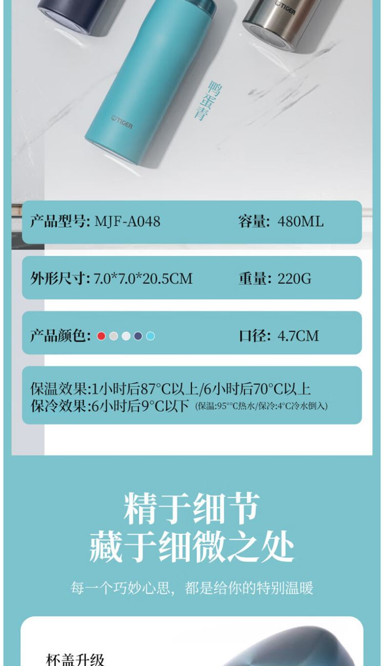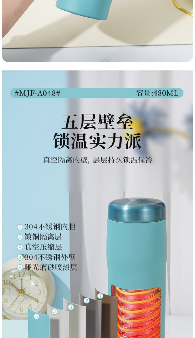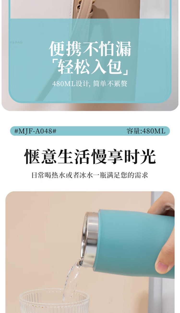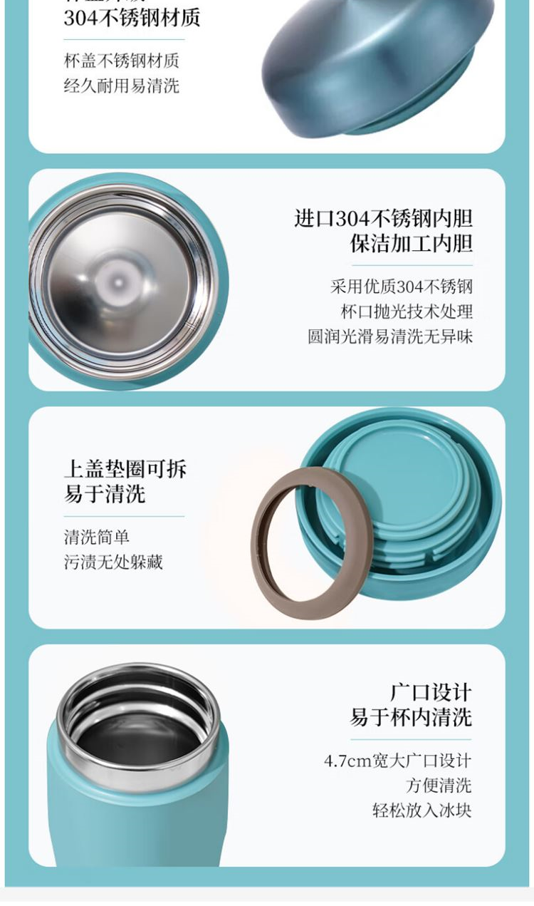 外形尺寸:7.0*7.0*20.5CM 容量:480ML 重量:220G 口径:4.7CM 保温效果:1小时后87°C以上/6小时后70°℃以上保冷效果:6小时后9°C以下(保温:95°C热水/保冷:4°C冷水侧入) 杯盖升级 杯盖不锈钢材质 经久耐用易清洗 上盖垫圈可拆易于清洗 清洗简单污渍无处躲藏 进口304不锈钢内胆 保洁加工内胆 杯口抛光技术处理 圆润光滑易清洗无异味 广口设计易于杯内清洗 4.7cm宽大广口设计 轻松放入冰块