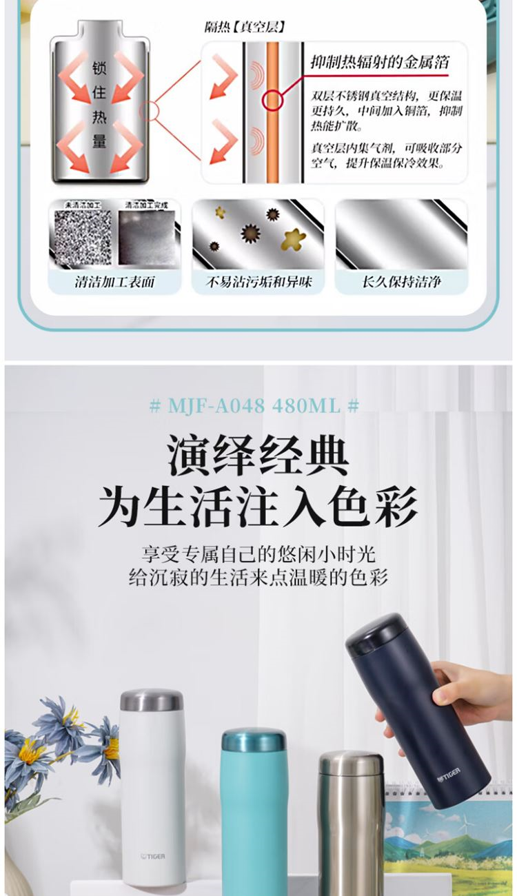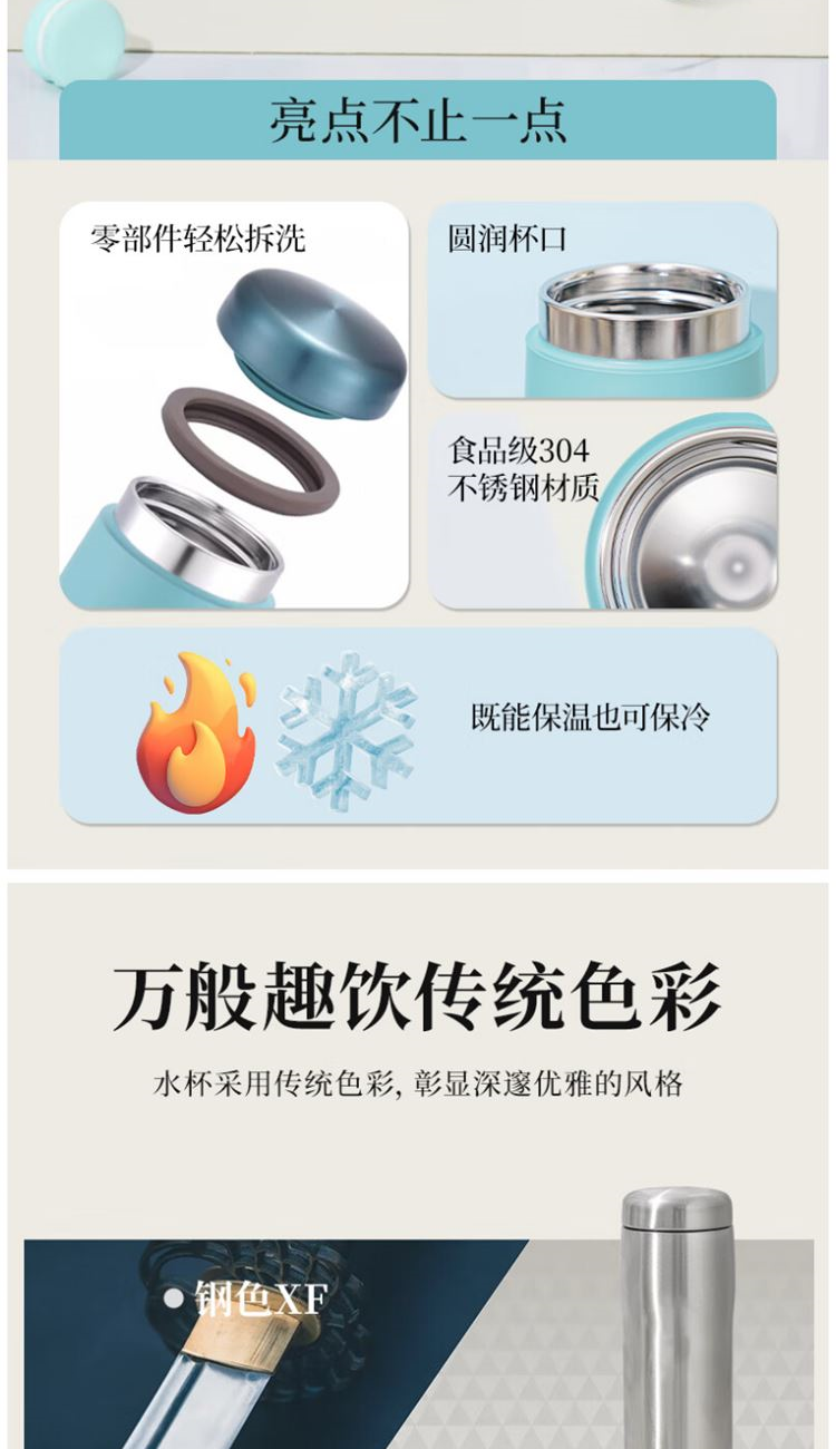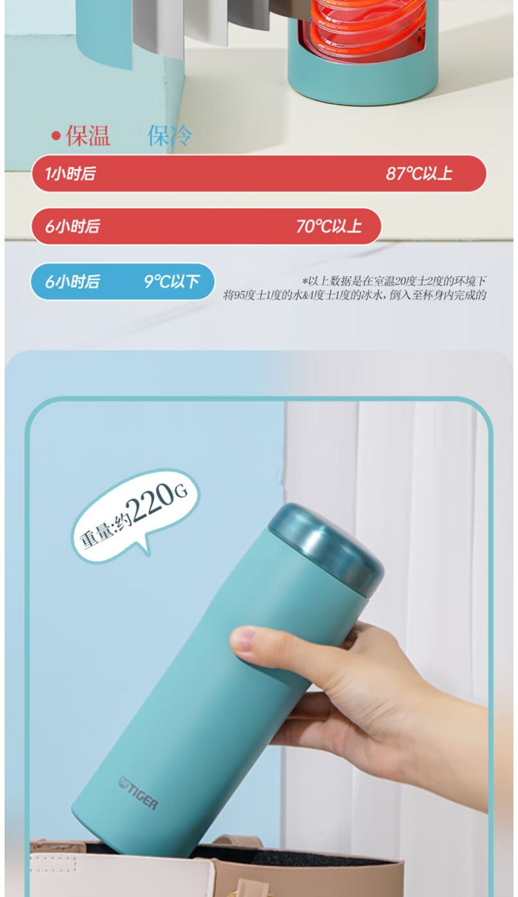 外形尺寸:7.0*7.0*20.5CM 容量:480ML 重量:220G 口径:4.7CM 保温效果:1小时后87°C以上/6小时后70°℃以上保冷效果:6小时后9°C以下(保温:95°C热水/保冷:4°C冷水侧入) 杯盖升级 杯盖不锈钢材质 经久耐用易清洗 上盖垫圈可拆易于清洗 清洗简单污渍无处躲藏 进口304不锈钢内胆 保洁加工内胆 杯口抛光技术处理 圆润光滑易清洗无异味 广口设计易于杯内清洗 4.7cm宽大广口设计 轻松放入冰块