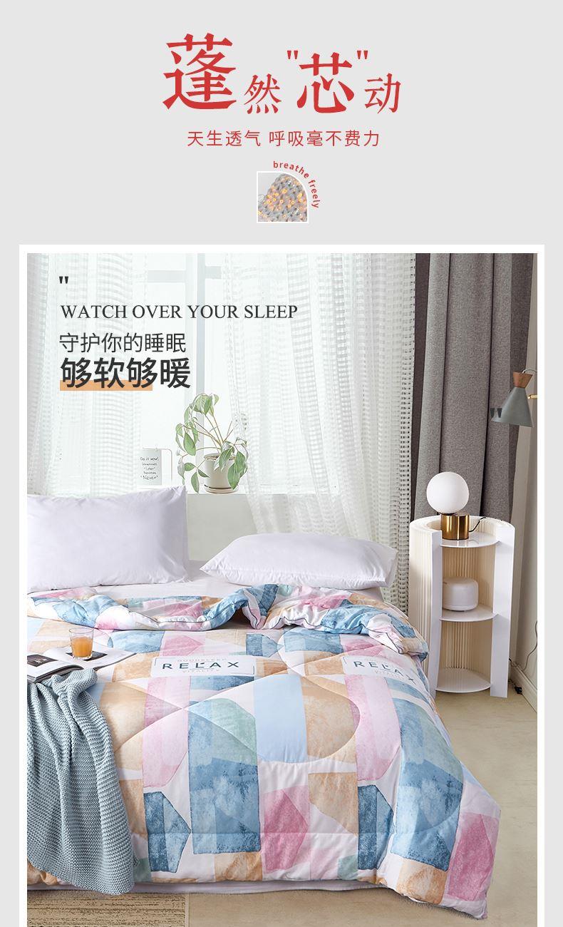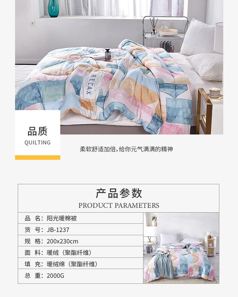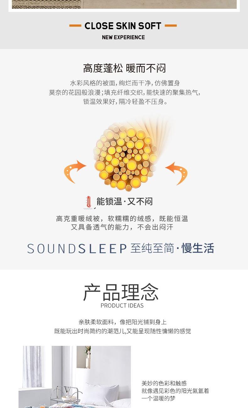 规 格 : 200×230cm 面 料 : 暖绒 填 充 : 暖绒棉 克 重 : 2000G 水彩风格的被面,絢烂而干净,仿佛置身莫奈的花园般浪漫,填充纤维交织,能快速的聚集热气,锁温效果好,隔冷轻盈,高克重暖绒被,软糯糯的绒感,既能恒温又具备透气的能力。