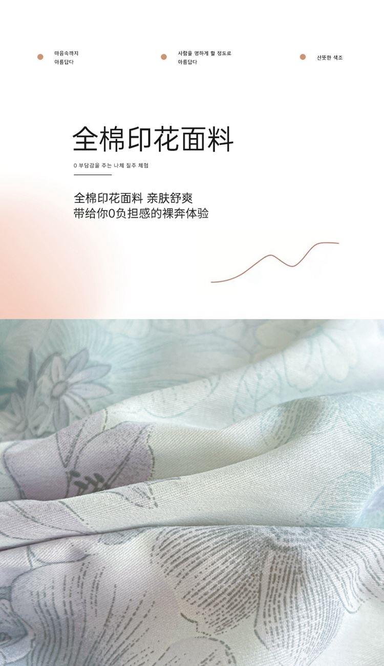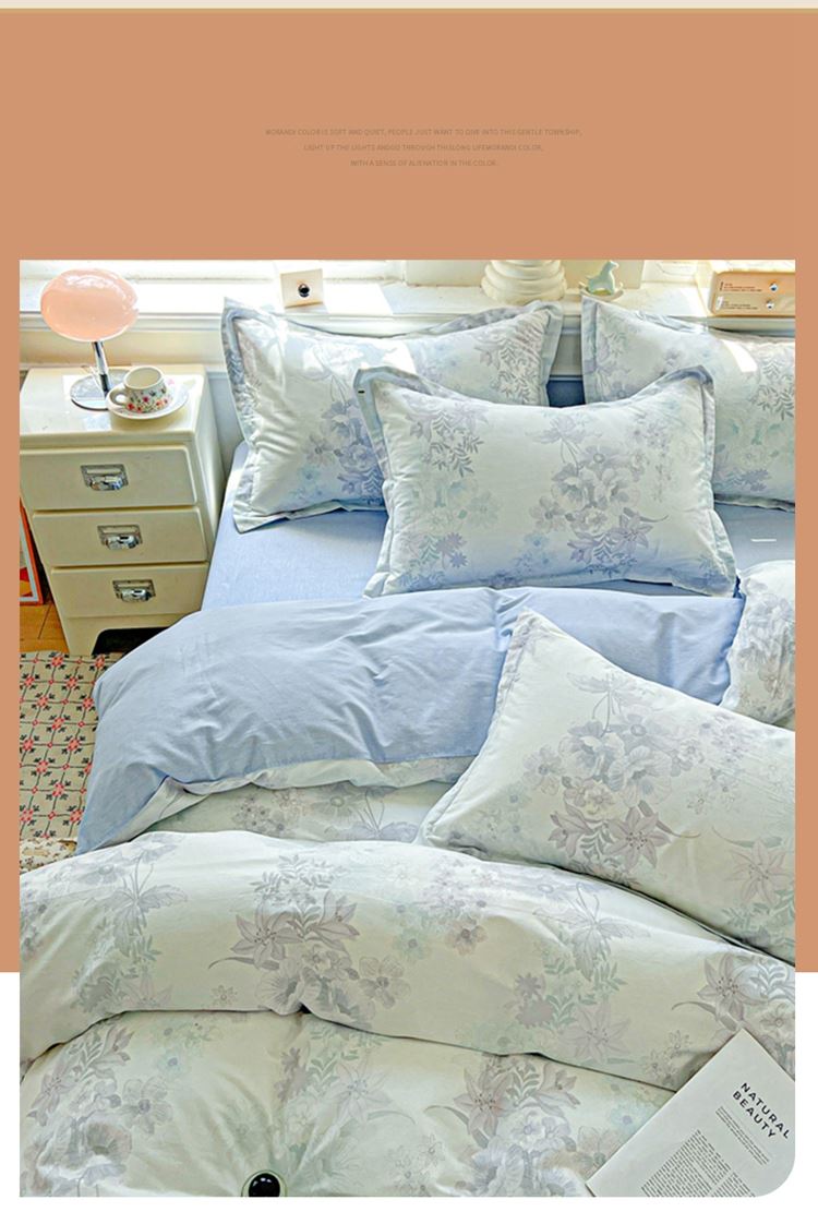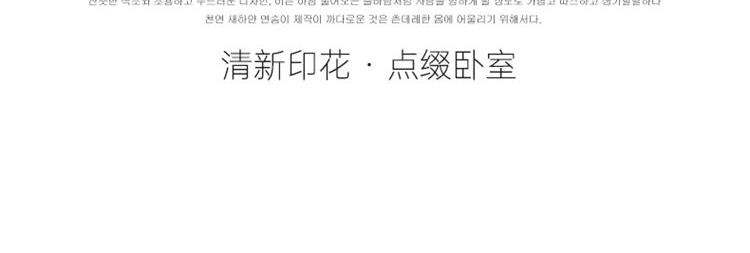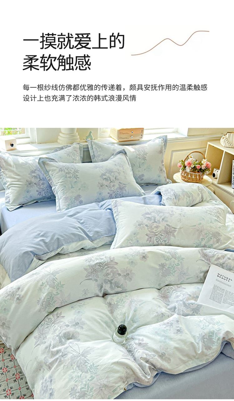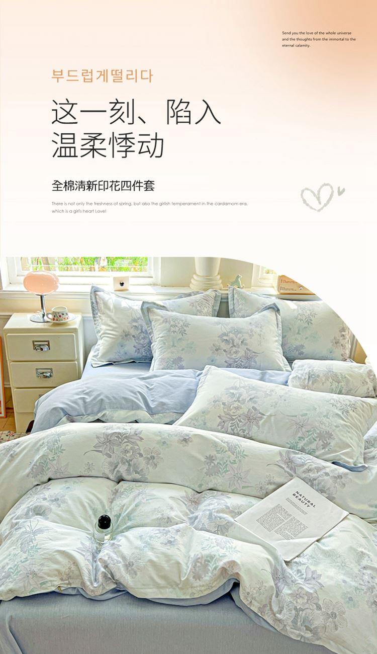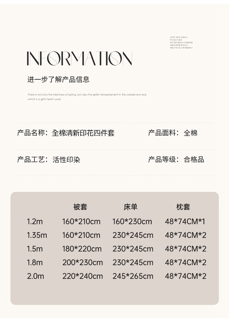 1:这一刻、陷入温柔悸动 全棉清新印花四件套 2:亲肤舒爽带给你0负担感的裸奔体验 3:甄选纤维柔长棉朵硕大的新疆棉花纤维挑剔是为了配得上骄傲的身体 尺寸:被套:200*230cm*1 床单:230*245cm*1 枕套:48*74cm*2 包装:彩盒