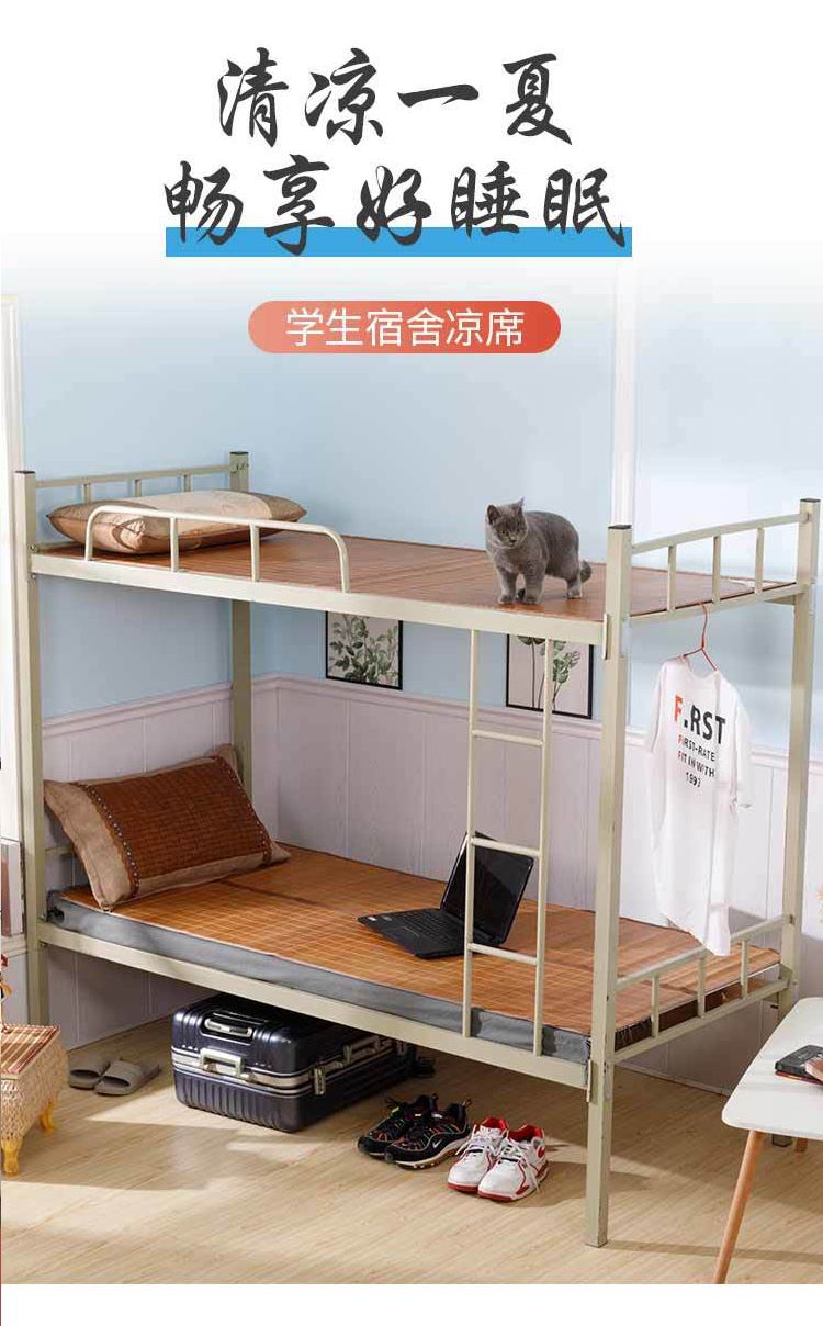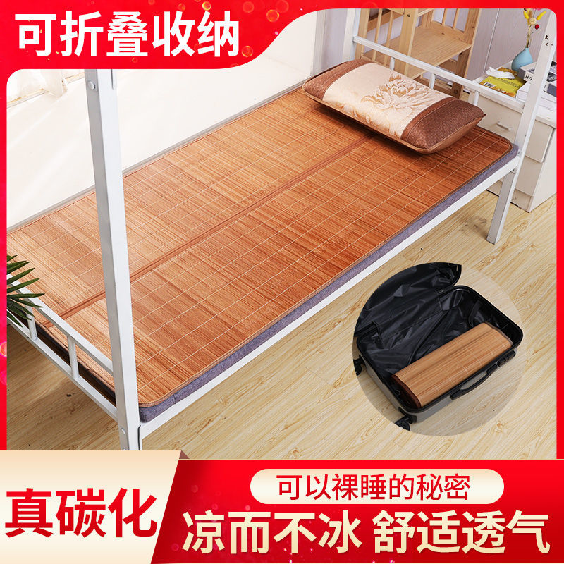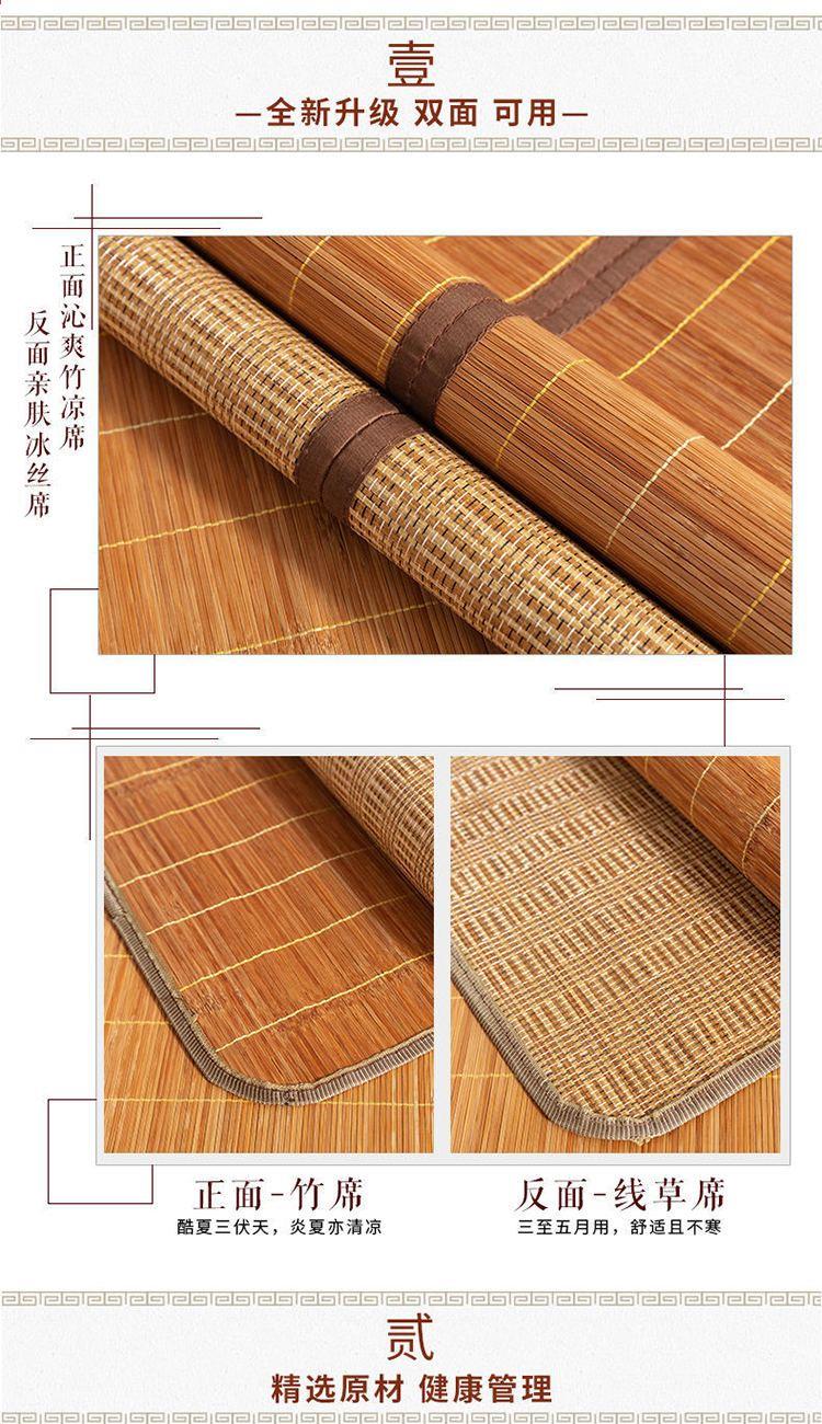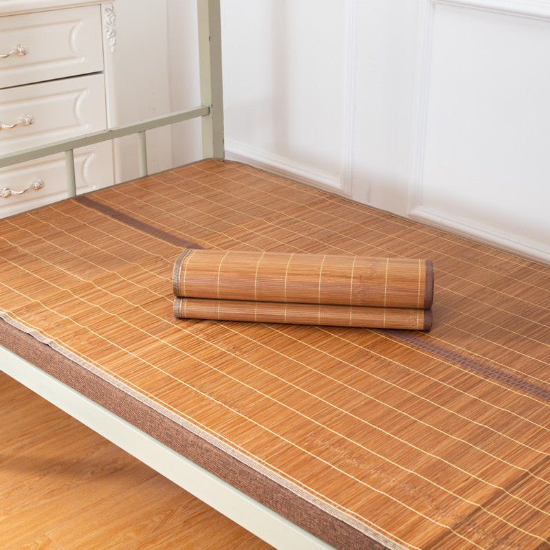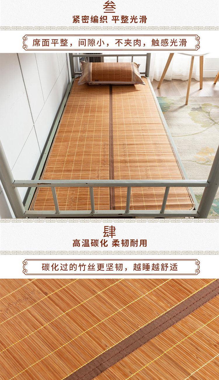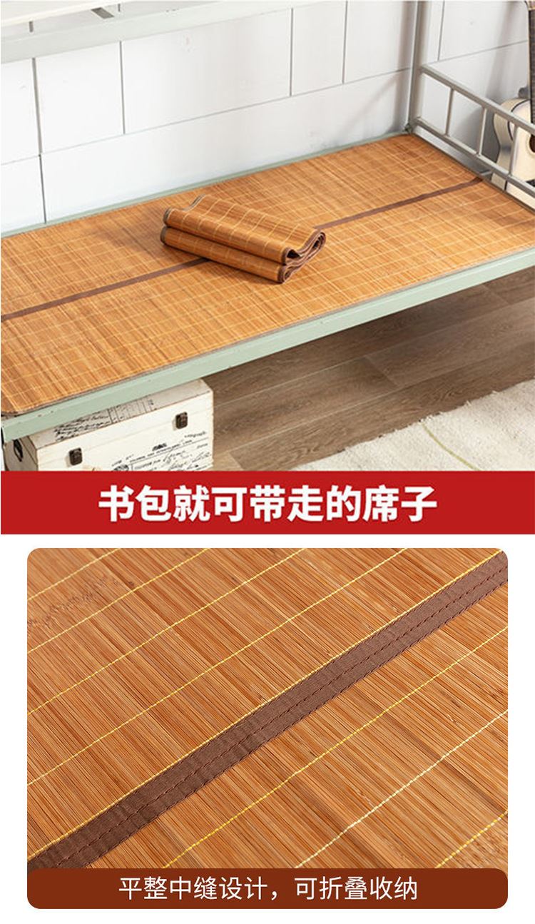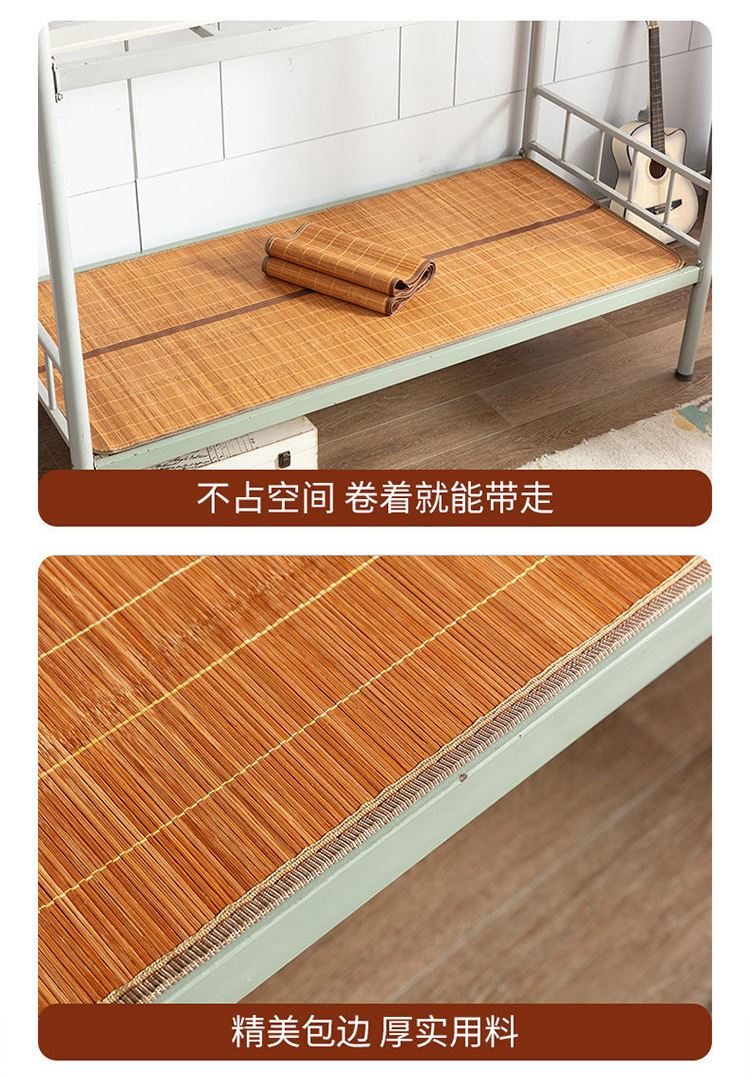 规 格:90*190cm 花 型:如图所示(不包含枕头) 材 质:竹丝 / 四周聚酯纤维包边 头层老竹,坚韧耐用,更清凉。专为宿舍床铺设计,折叠后可直接放入行李箱,初次使用须拿毛巾擦洗干净,不可水洗暴晒,不用时,擦净后 晾干,按照中间折叠线将竹席面朝外合拢后对折再卷起,置于干燥通风处。