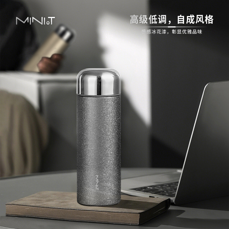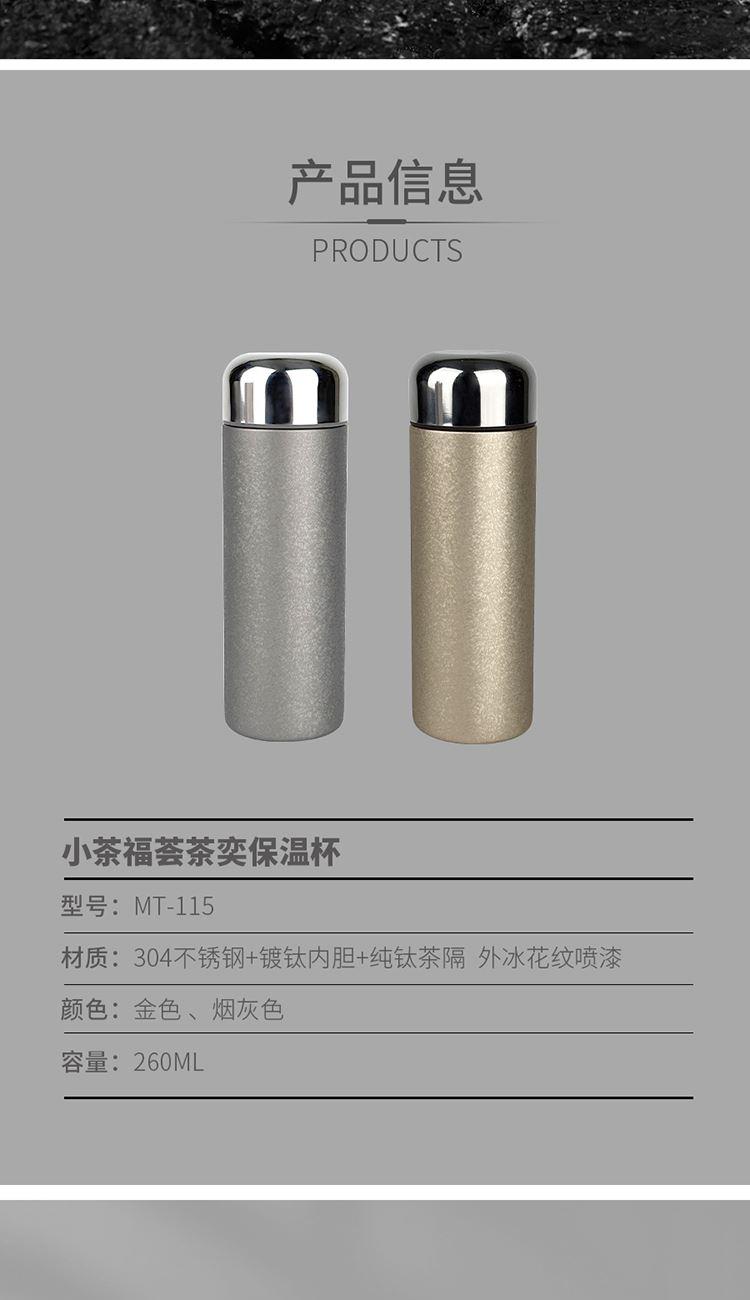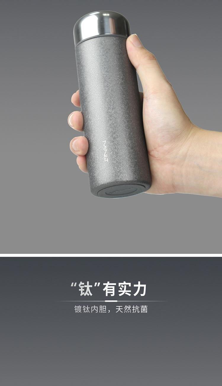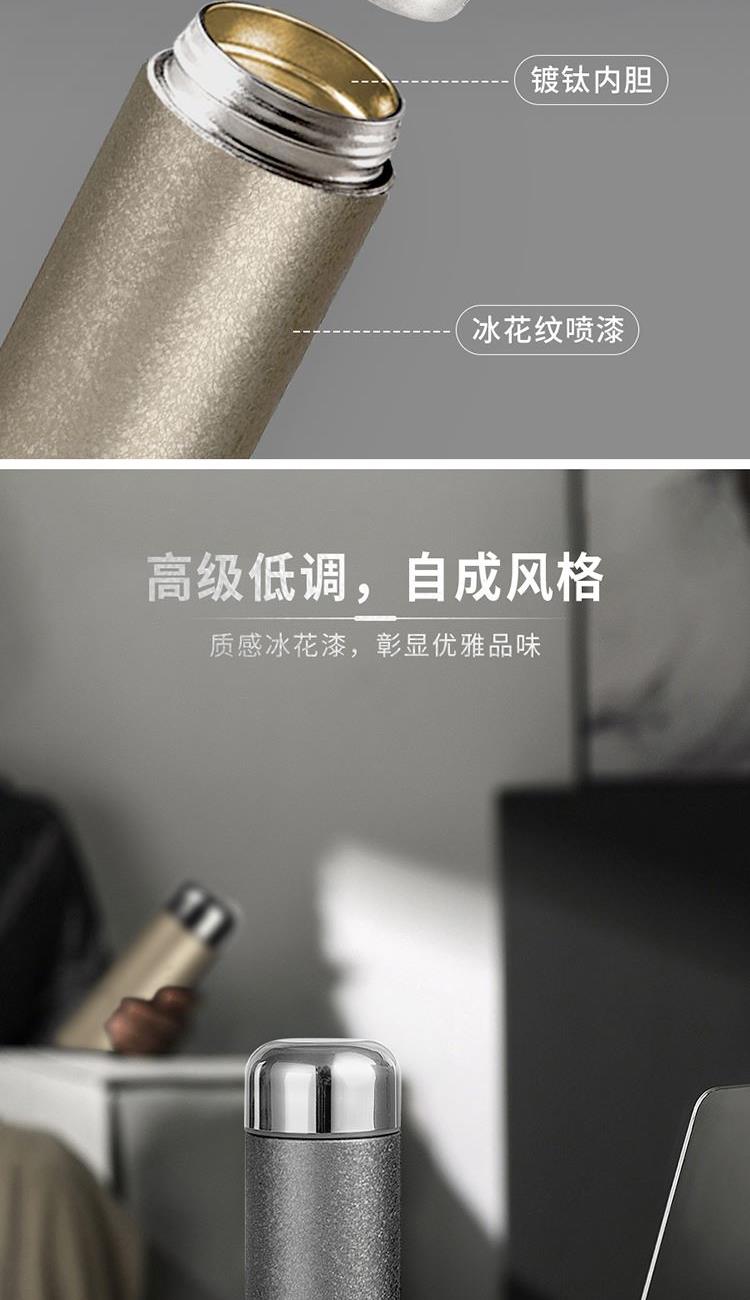 材质:304不锈钢+镀钛内胆+纯钛茶隔 外冰花纹喷漆 规格:260ML 包装:彩盒 卖点:镀钛内胆:守护饮品纯净锁鲜,每一口都安心。 纯钛茶隔:无惧茶渍侵蚀,历久弥新,茶香醇厚不散。 质感冰花漆:流转城市光影,掌中艺术品,优雅自成焦点。 260ml 容量:轻盈随行,一手掌握,从容融入繁忙节奏。
