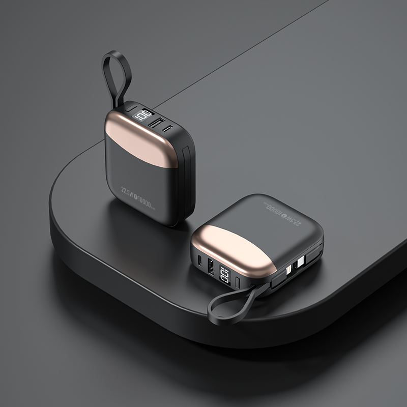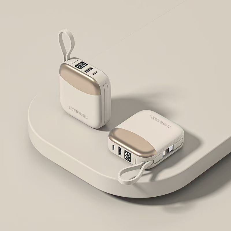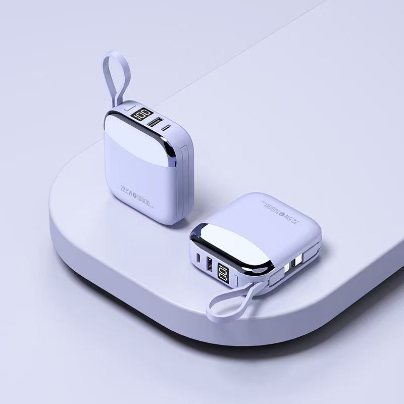 奥苏米3C认证小贝22.5W超级快充自带线 移动电源R56J 型 号: R56J 电池 :聚合物*1pcs 电池类型 :聚合物动力电芯 容量:10000mAh 材质 :ABS+PC 尺寸 :69.7*24.8*76.9mm 颜色 :常备米色 /蓝色/ 紫色/ 黑色/ 功能特点 简约设计风格,时尚大气; 22.5W超级快充,迅速充电; 10000mAh锂电池,澎湃动力; 自带苹果和Type-C充电线; 一输入三输出,支持苹果15手机 智能数显查看电量