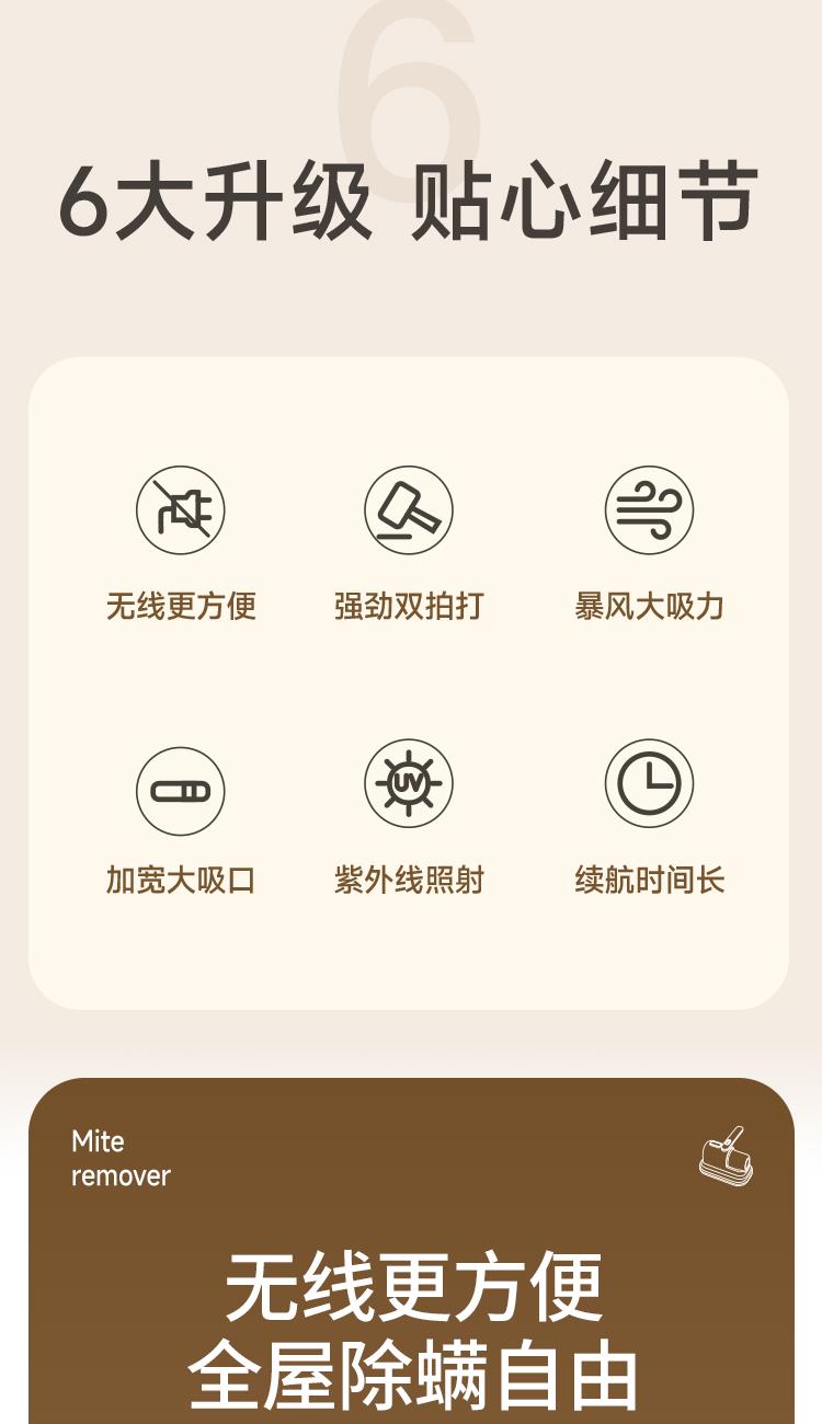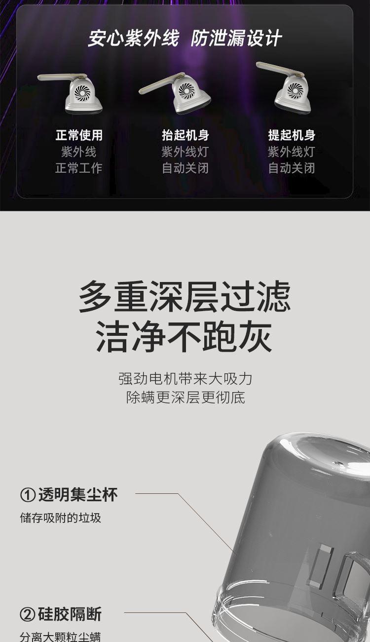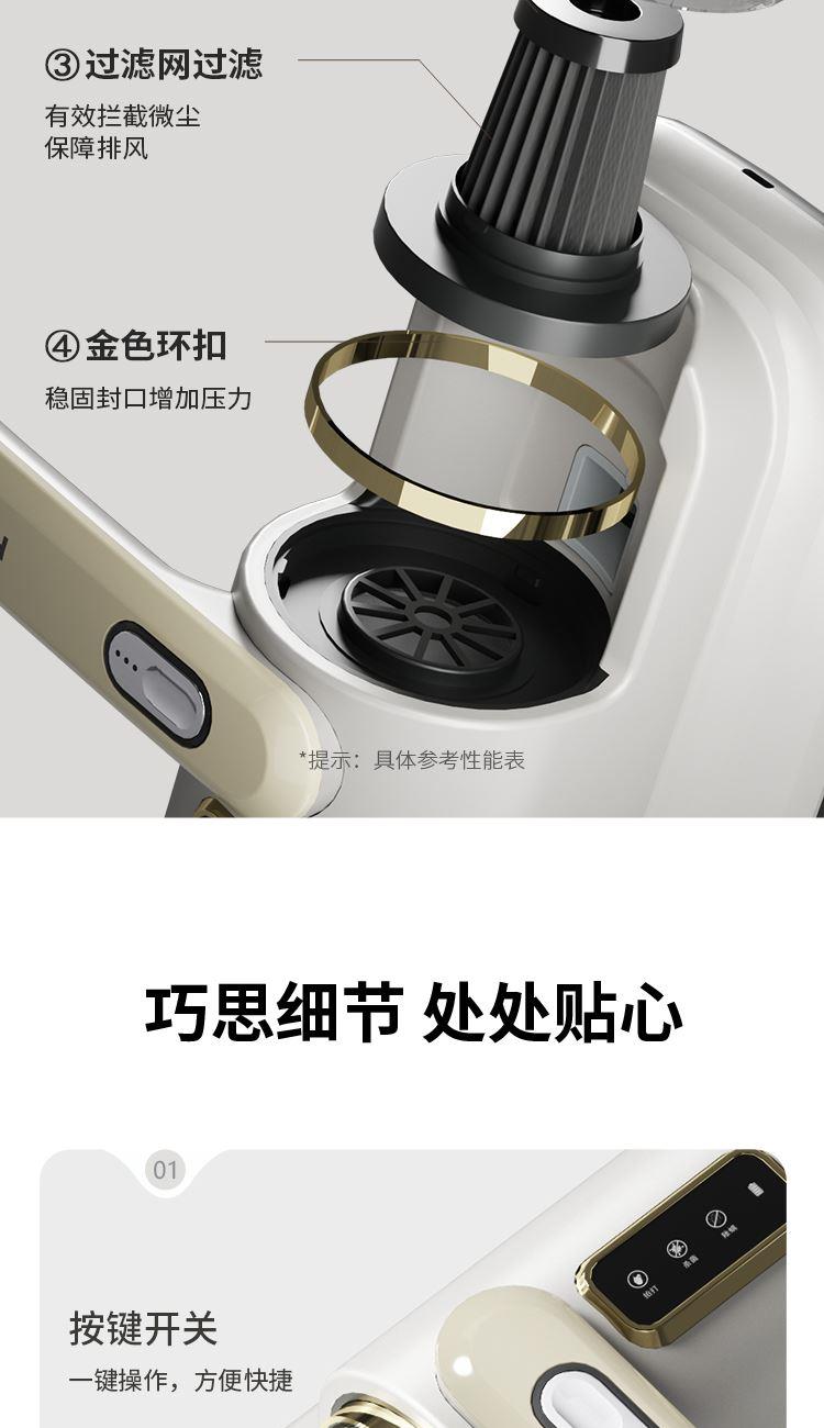 产品尺寸:246*243*124mm 彩盒尺寸:280*170*285mm 外箱尺寸:880*360*590mm 单台净重:0.736kg 单台毛重:1.074kg 电池容量:1500毫安 包装材料:彩盒 额定电压:7.4V= 充电电压:5V= 充电电流:2A 额定功率:70W、材质:ABS 高频双拍打,拍吸同步不跑灰 > UV紫外线,安全不伤肤 > 无线充电,随拿随用,可视尘杯,分离尘端