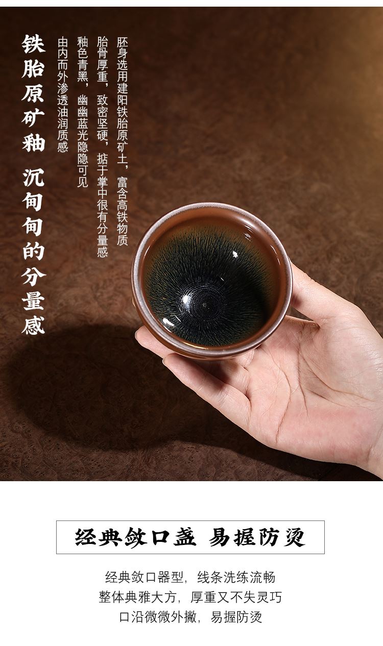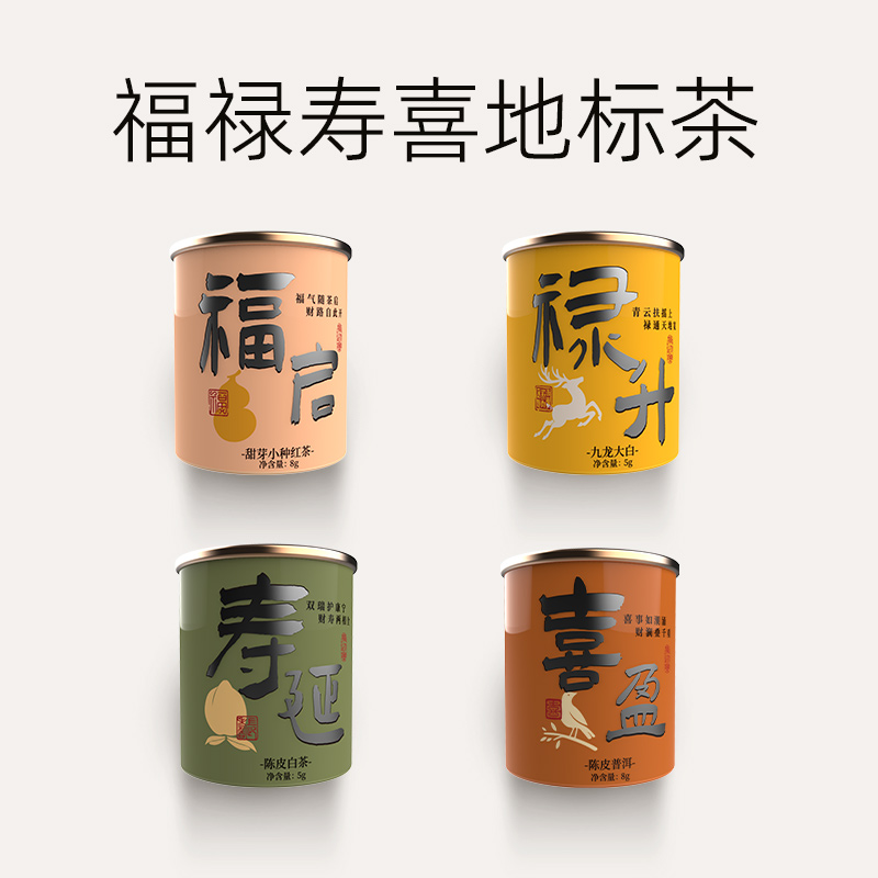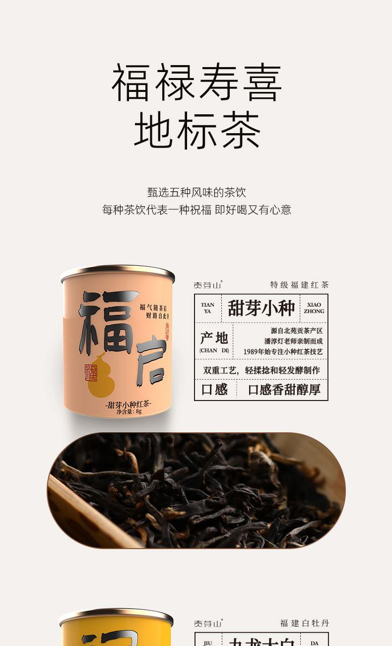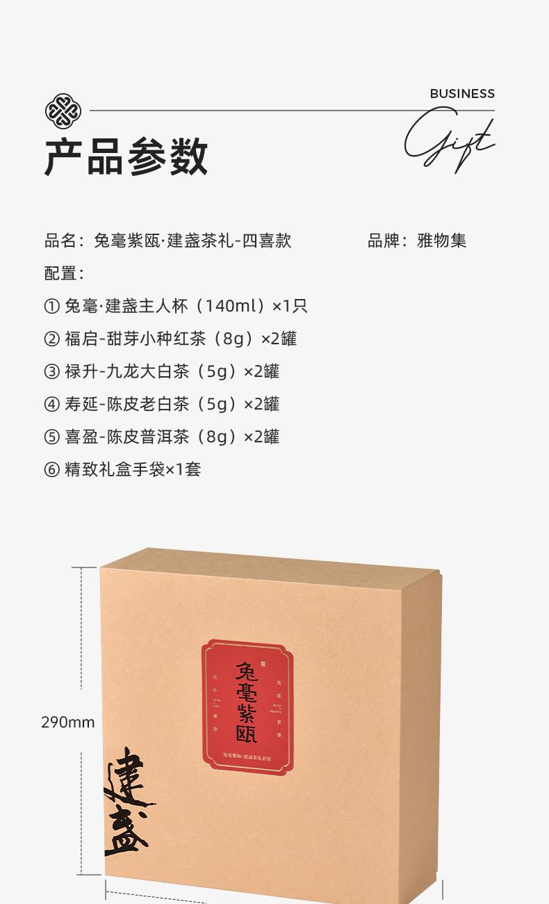 配置 · ① 兔毫·建盏主人杯(140ml)×1只 ② 福启-甜芽小种红茶(8g)×2罐 ③ 禄升-九龙大白茶(5g)×2罐 ④ 寿延-陈皮老白茶(5g)×2罐 ⑤ 喜盈-陈皮普洱茶(8g)×2罐 ⑥ 精致礼盒手袋×1套