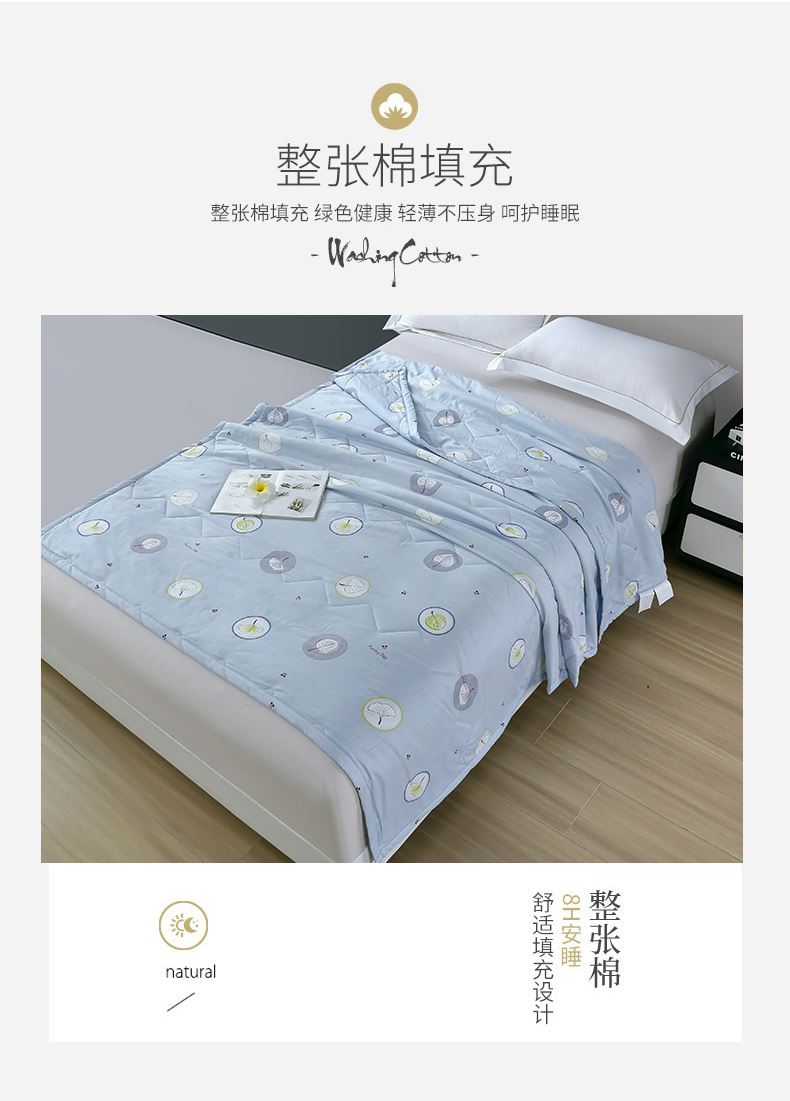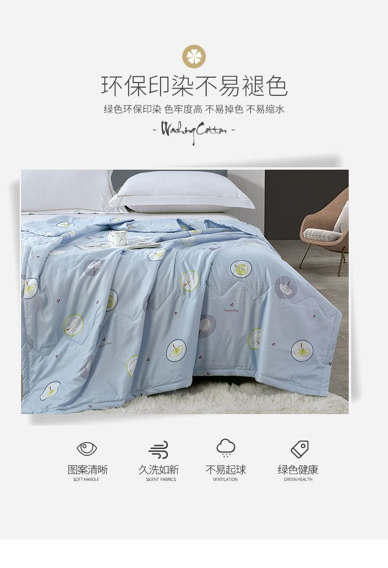 规格:150*200cm 面料:亲肤棉(聚酯纤维) 填充:羽丝棉 重量:700g 执行标准:GB/T22796-2021 安全类别:GB18401-2010 B类 1.甄选优质亲肤绒面料,亲肤磨毛织物是一种功能性织造方式,在保留面料原有性能的同时,通过再加工,使织物表面形成一层层细腻的短绒毛层的感觉,增加了贴身接触的柔软性和亲肤性。 2.采用羽丝棉填充,柔软蓬松,亲肤性佳,回弹性优,贴身覆盖且轻盈。