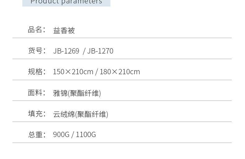 货 号:JB-1270 规 格:180*210cm 面 料:雅锦 填 充:云绒绵 总 重:1100G 1.一被清香一夜好眠!雅锦面料垂顺亲肤,云绒绵纤维蓬松锁温,天然植物清香舒缓身心,打造安神睡眠空间。 2.雅锦邂逅云绒绵,织就清香梦境!面料丝滑透气,填充蓬松不板结,久用如新~ 3.会呼吸的好被!雅锦面料透气不闷热,云绒绵轻盈贴合身形,清雅的图案,让情绪缓慢释放,助你整夜放松深睡。