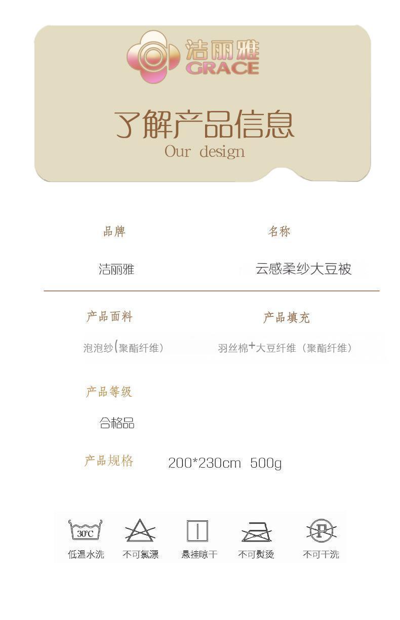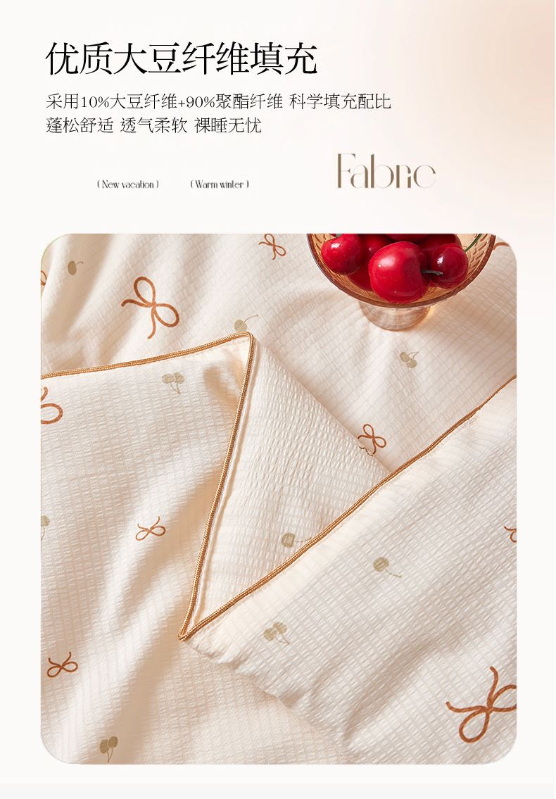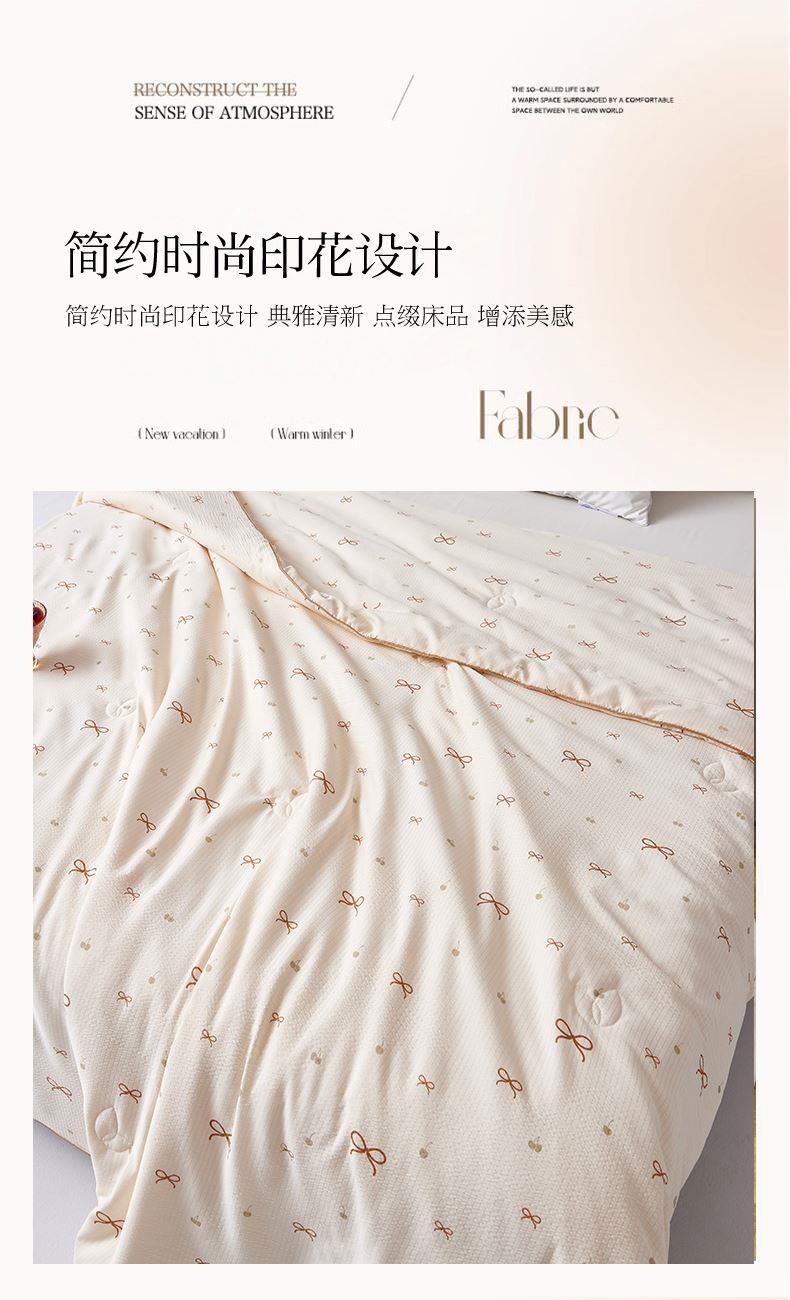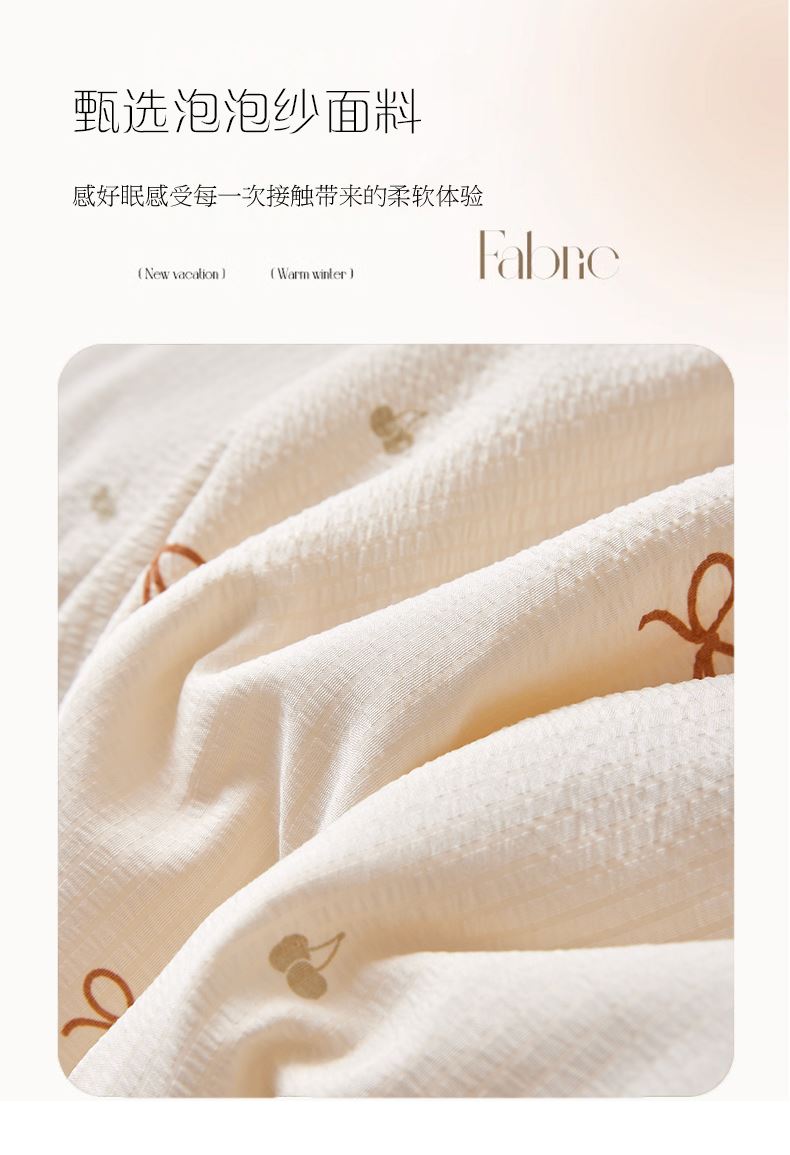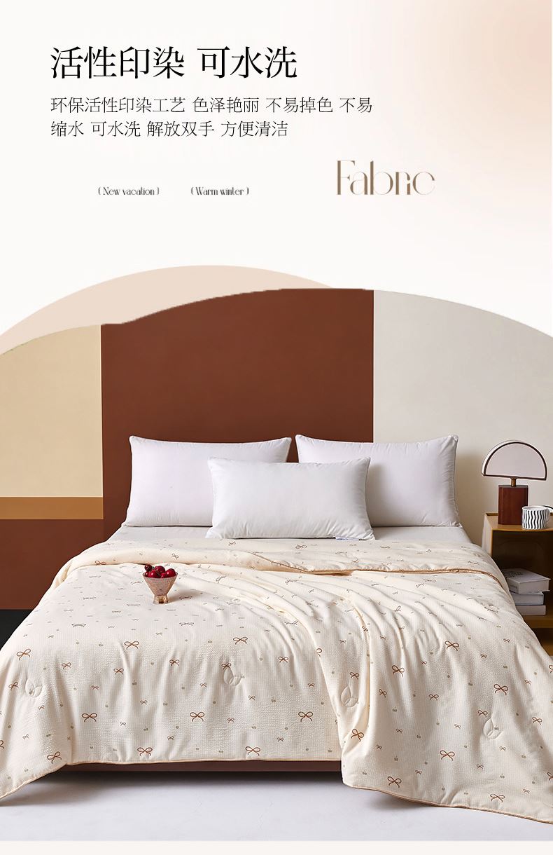 规格:200*230cm 面料:泡泡纱(聚酯纤维) 填充:羽丝棉+大豆纤维 填充克重:500g 执行标准:GB/T22796-2021 安全类别:GB18401-2010 B类 1.柔软泡泡纱面料,亲肤透气,千爽透气贴着身体,仿佛会呼吸,越睡越上瘾。软软糯糯很亲肤,织造紧密,手感柔软非湿排热内芯,不再闷湿燥热,我们的泡泡纱夏被,内部形成多孔的中空结构,加速排出湿气和热量。