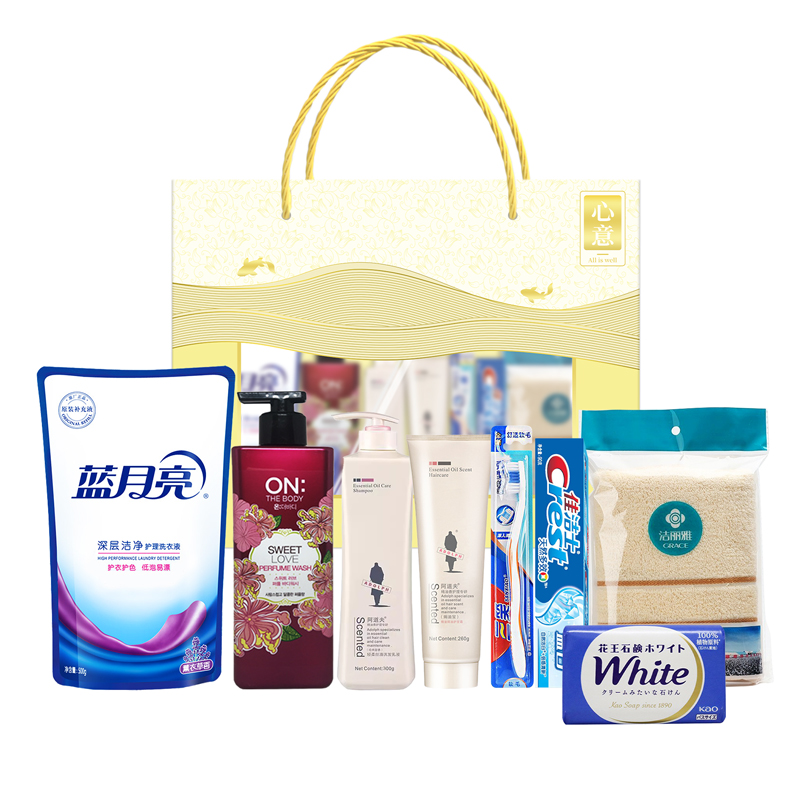 礼盒尺寸:40*13*28cm 包装尺寸:42*80*30cm 产品配置:(香型随机) 浅香洗发水500ml 浅香沐浴露500ml 浅香顺滑膏260g 花王洗洁精220ml 蓝月亮洗衣液1kg 洁丽雅毛巾69*33cm 花王防蛀美白牙膏165g 进口宽头软毛牙刷2重植毛