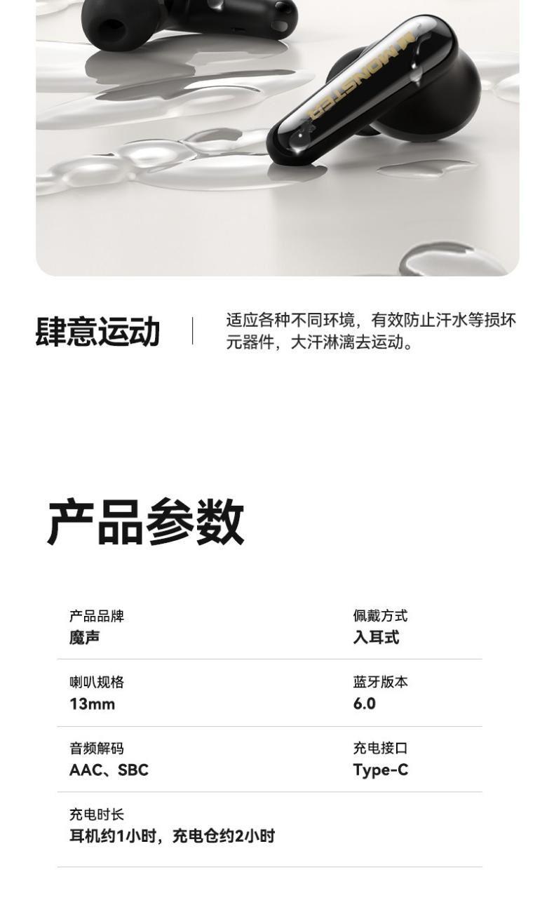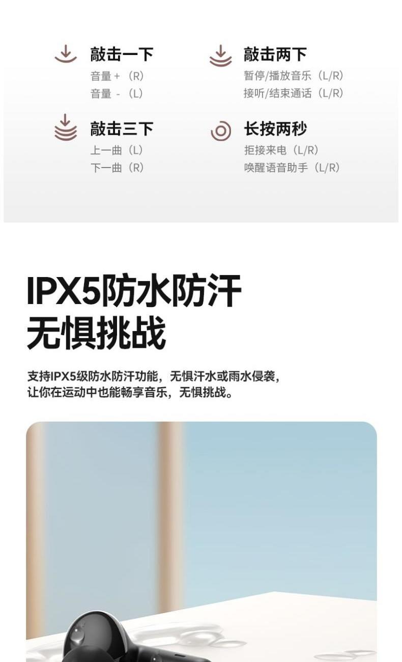 • IPX5防水防汗,运动中也能畅享音乐,无惧挑战