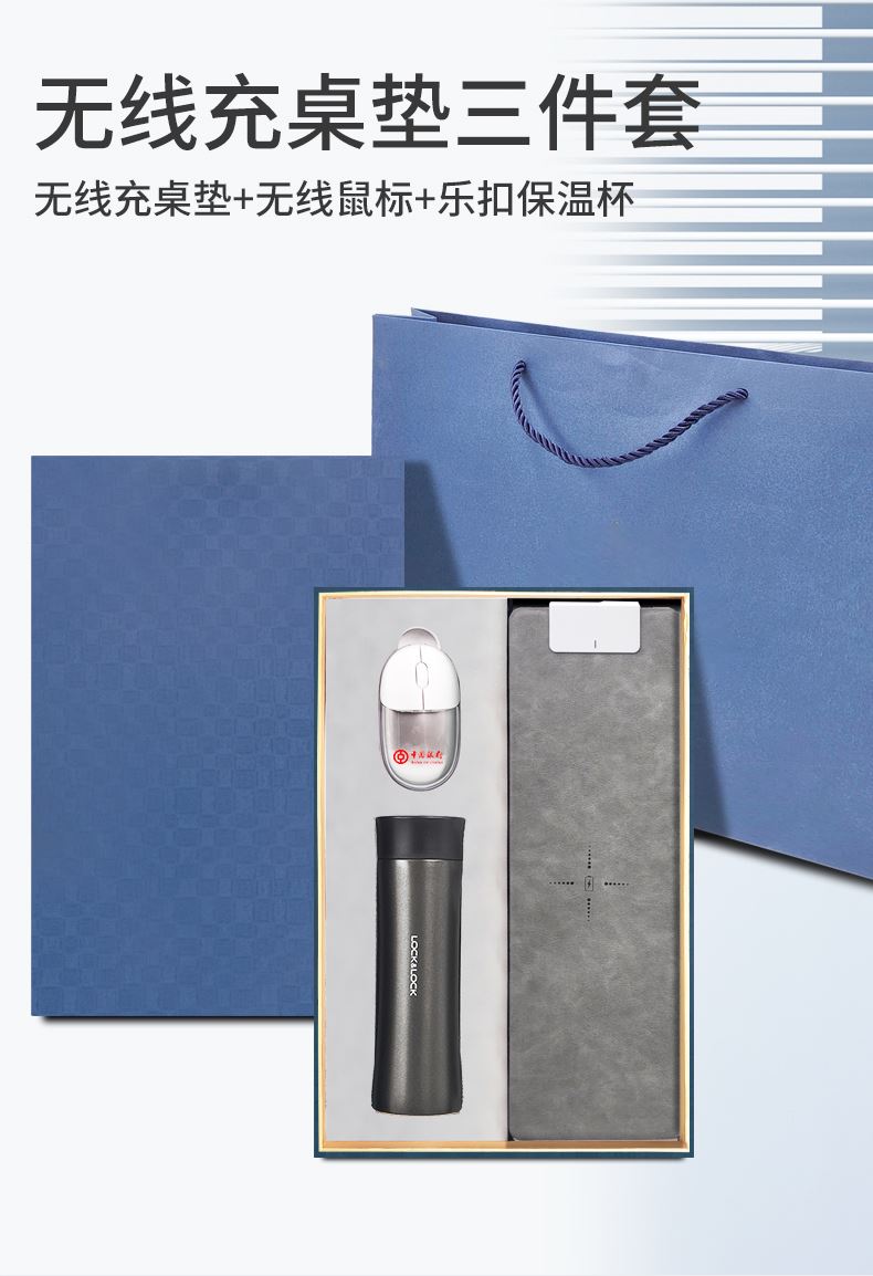礼盒配置: 1、无线充桌垫(15W快充) 2、双模无线蓝牙鼠标(透光LOGO) 3、型号:LHC4028 400ML LOCK&LOCK 保温杯 4、蓝色包装盒尺寸:400x265x75mm 5、蓝色手提袋尺寸:410x292x85mm 6、重量:25kg/箱