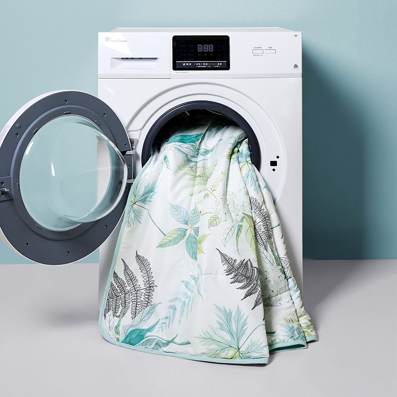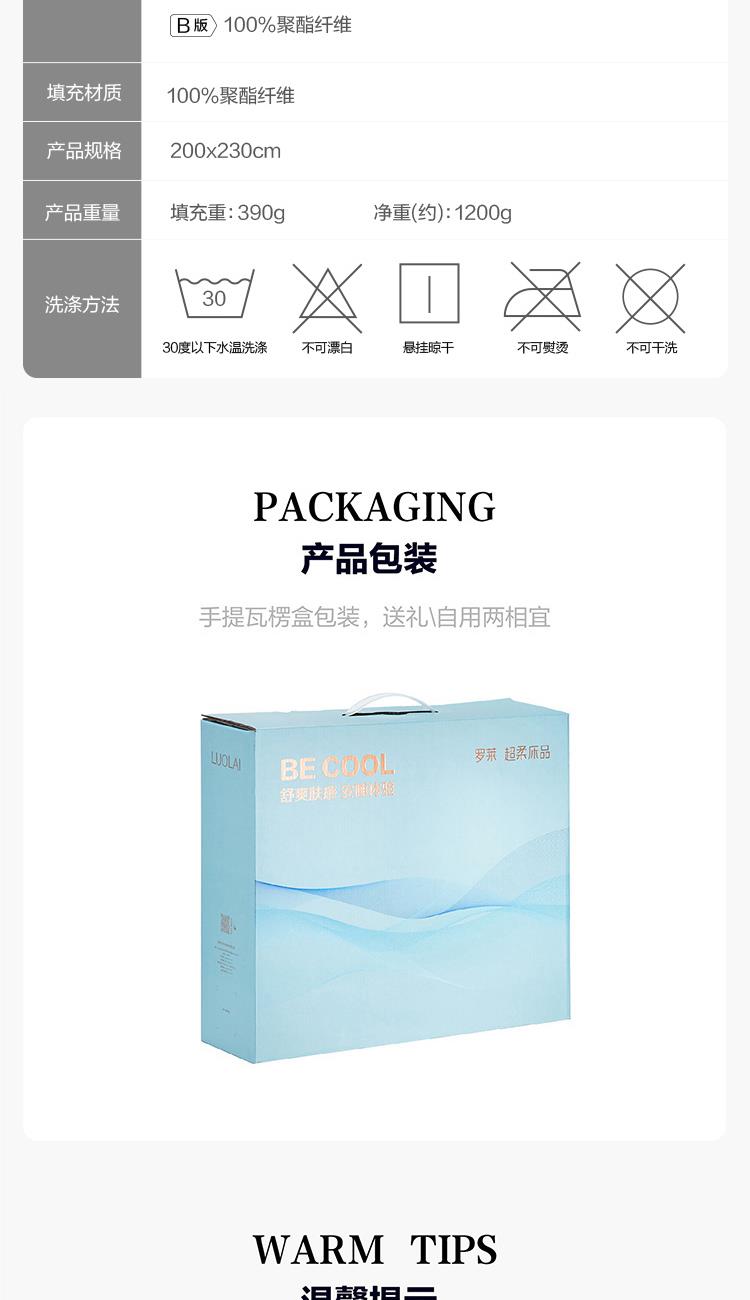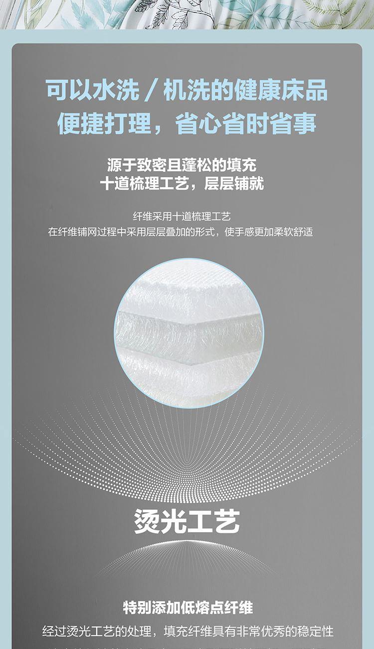 面料材质: A版:纬向:82%聚酯纤维+18%聚酰胺纤维 经向:聚酯纤维 B版:聚酯纤维 填充材质:聚酯纤维 规格尺寸:200*230cm 填充重量:390g 外箱尺寸: 54*44*76cm 采用涤锦面料,表面附有细密的绒毛,手感绵密,亲肤舒适;耐磨性提高,经久耐用。锦纶自带凉感。 填充中空纤维,经过精细配棉、开松、铺棉等多道工序加工而成,采用层层叠加的形式手感更加的柔软舒适,后道烫光工艺使得被芯更加不容易跑毛,更加经久耐用;