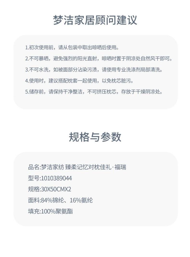 面 料:84%锦纶、16%氨纶 尺 寸:(30×50)cm×2个 填充:聚氨酯 包装:梦洁团购 红色三层瓦楞纸盒 30×15×30 「慢回弹科技,一枕即眠」 记忆棉枕芯温柔包裹头颈,压力均匀分散,仿佛被云朵轻轻托住。躺下瞬间,紧绷的肌肉逐渐放松,不知不觉坠入深睡。无论仰睡、侧睡,记忆棉都能智能贴合你的曲线,填补颈部悬空。早晨醒来,肩颈不再僵硬,连翻身次数都变少。
