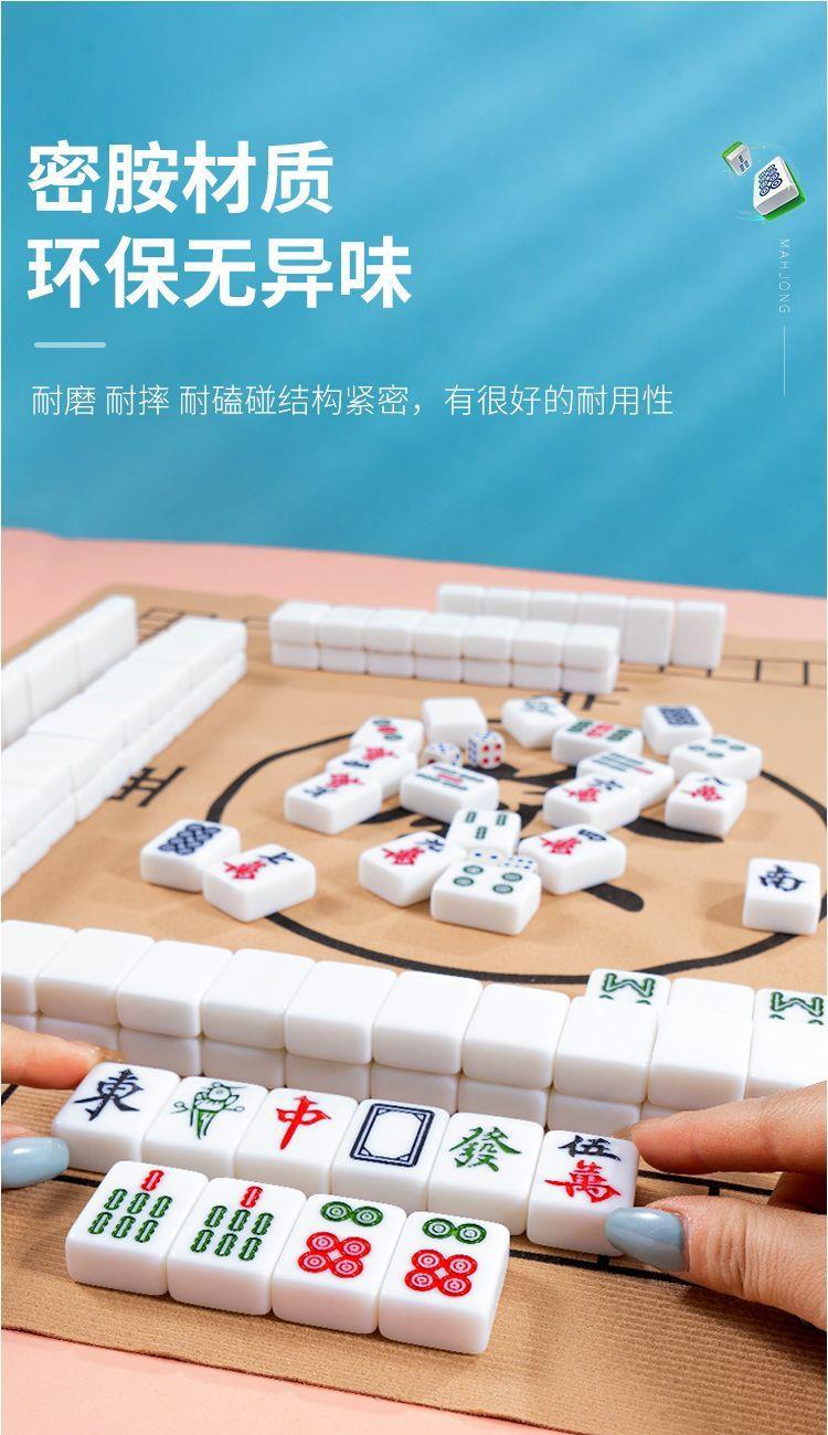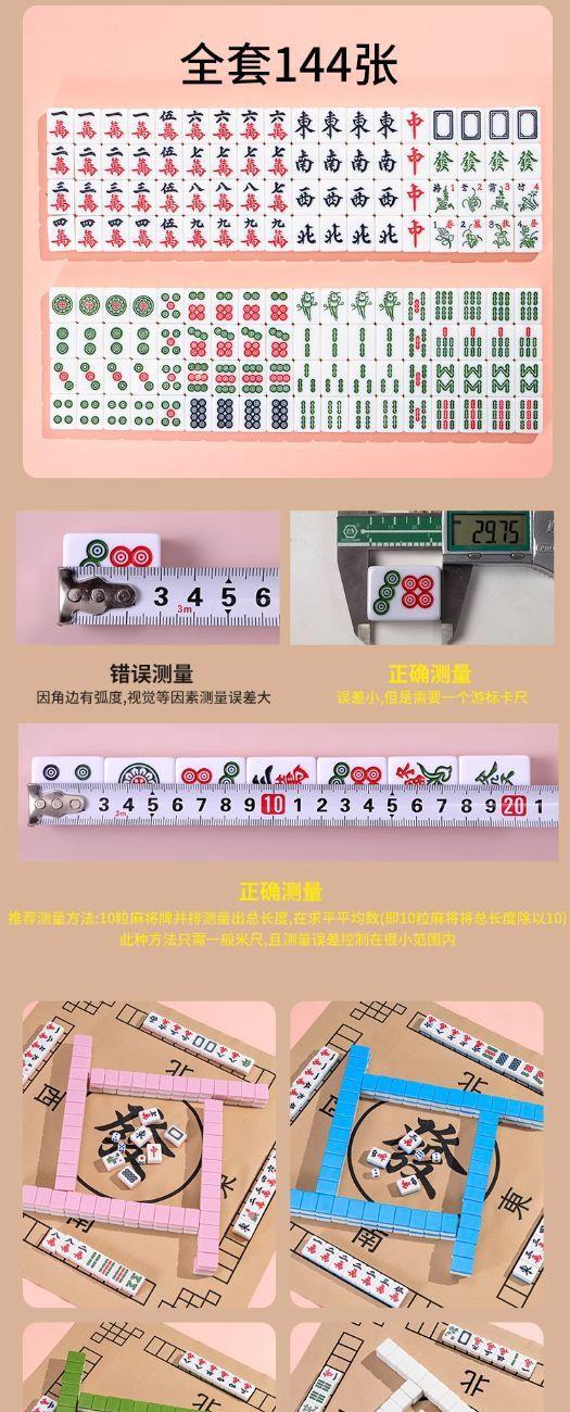 麻将:材质密胺全套144张,麻将尺寸26*18*11.5mm,毛毡包尺寸30*25*8.5,颜色白粉蓝绿,高温模具压制,雕刻清晰,手感圆润,定制桌布,加厚防滑