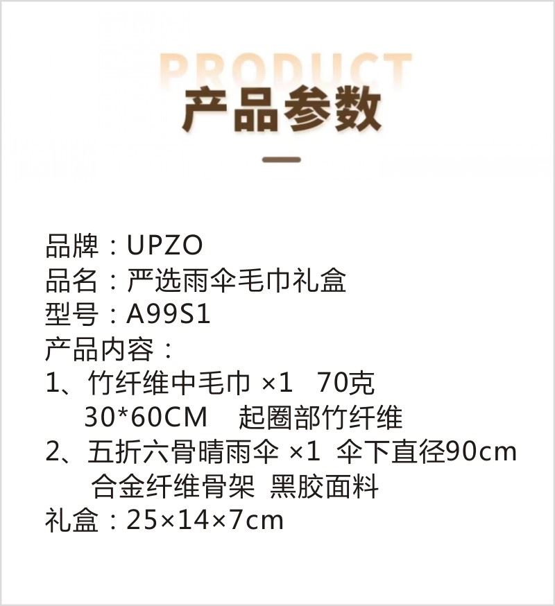 型号:A99S1 产品内容: 1、竹纤维中毛巾*1 70克 规格:30*60CM 起圈部竹纤维 2、五折六骨晴雨伞(胶囊伞)×1 伞下直径90CM 合金纤维骨架 黑胶面料 礼盒规格:25*14*7CM 五折六骨晴雨伞 胶囊伞尺寸设计 黑胶隔热 迪穆系列竹纤维毛巾起圈部竹纤维 吸湿透气