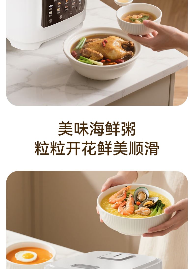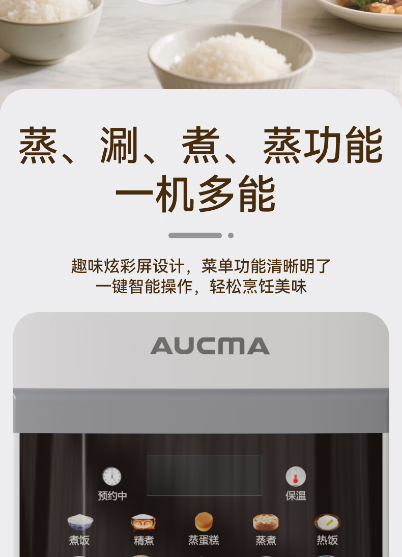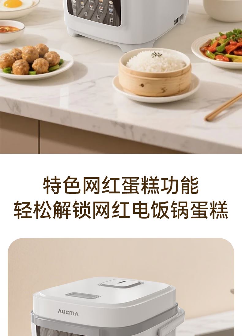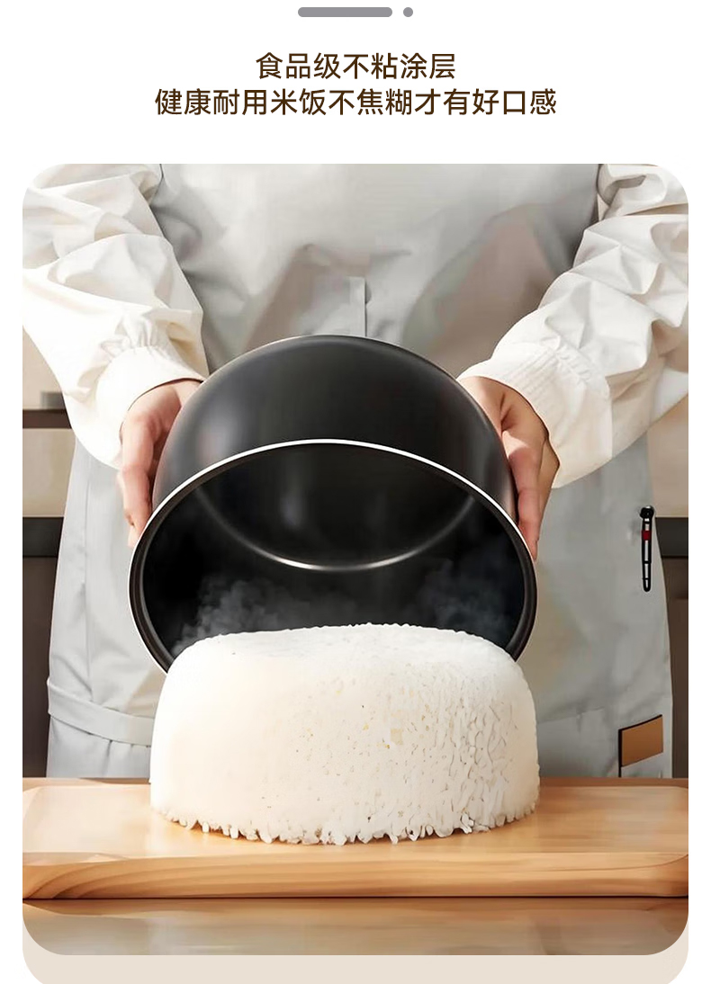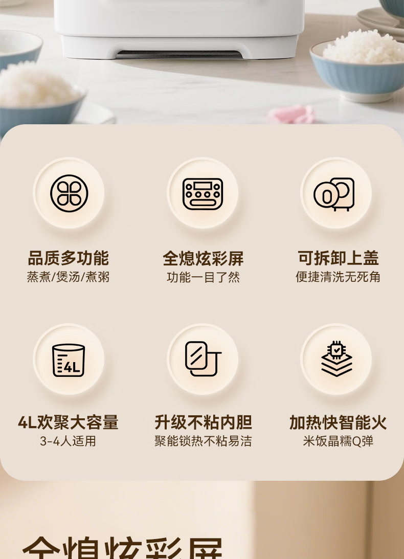 适用人数:3-4人 水性纳米不沾涂层 内胆材质:铝合金 容量:4L 电源线长:0.85m 额定功率:700W 全息炫彩屏,一键触控轻松操作 蒸,涮,煮一机多能 十大功能,双模式随心切换 特色网红蛋糕功能 智能控温系统,还原古法柴火饭