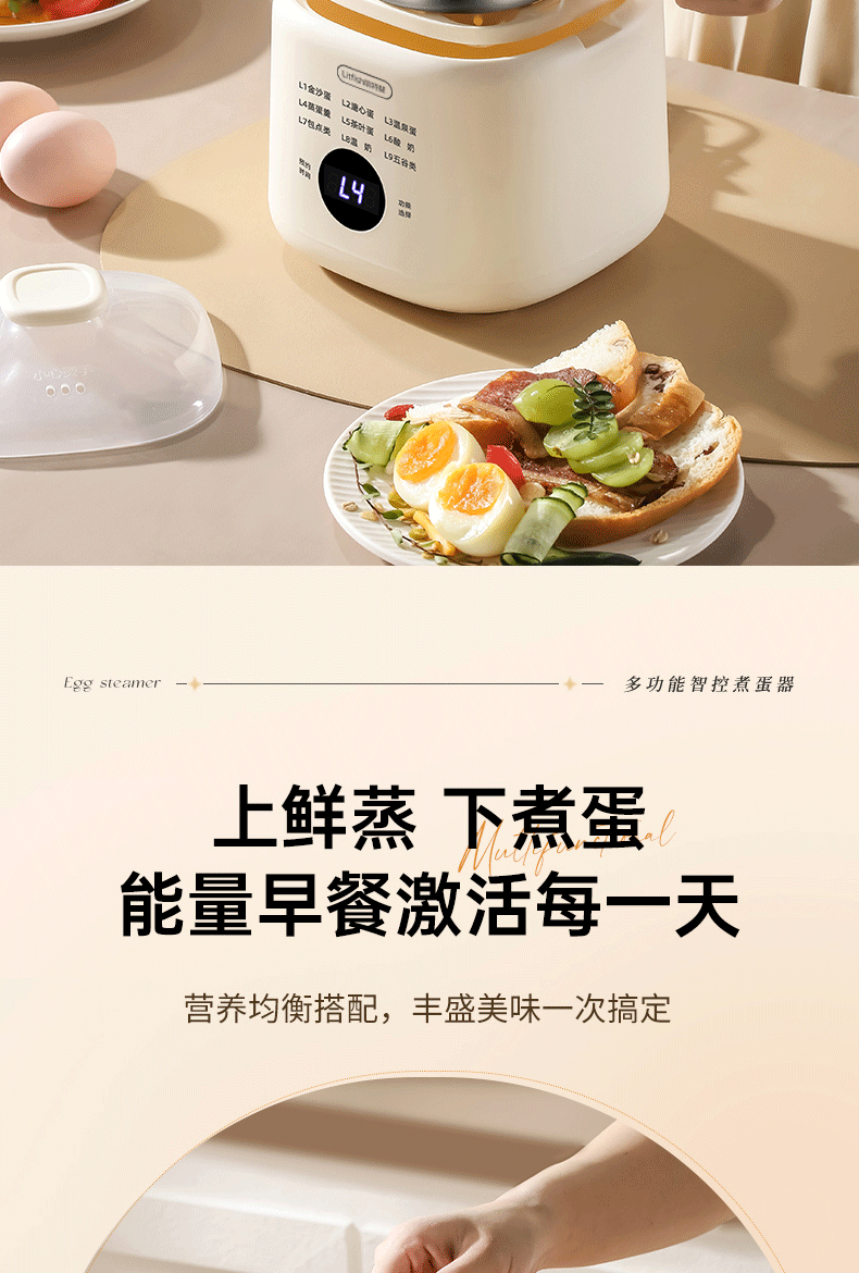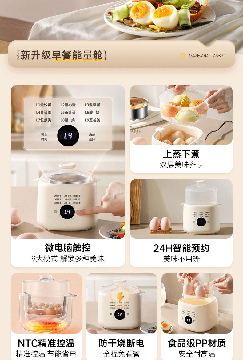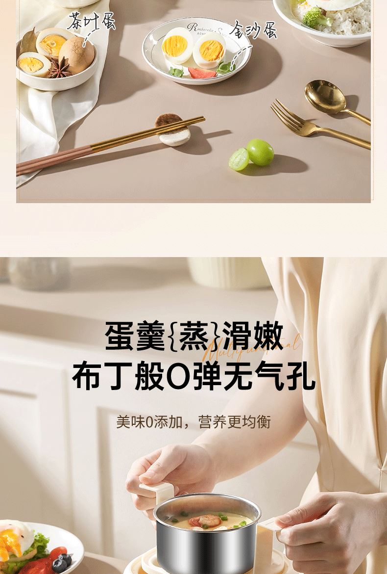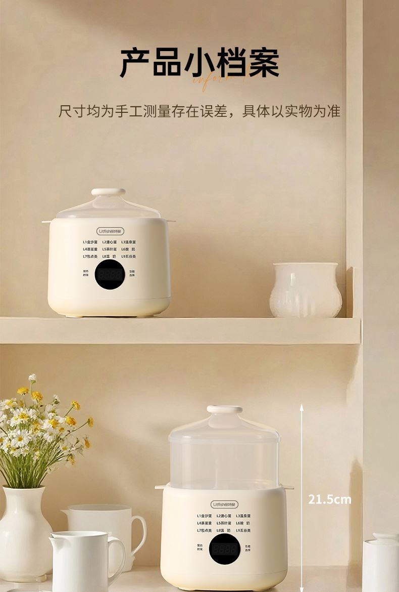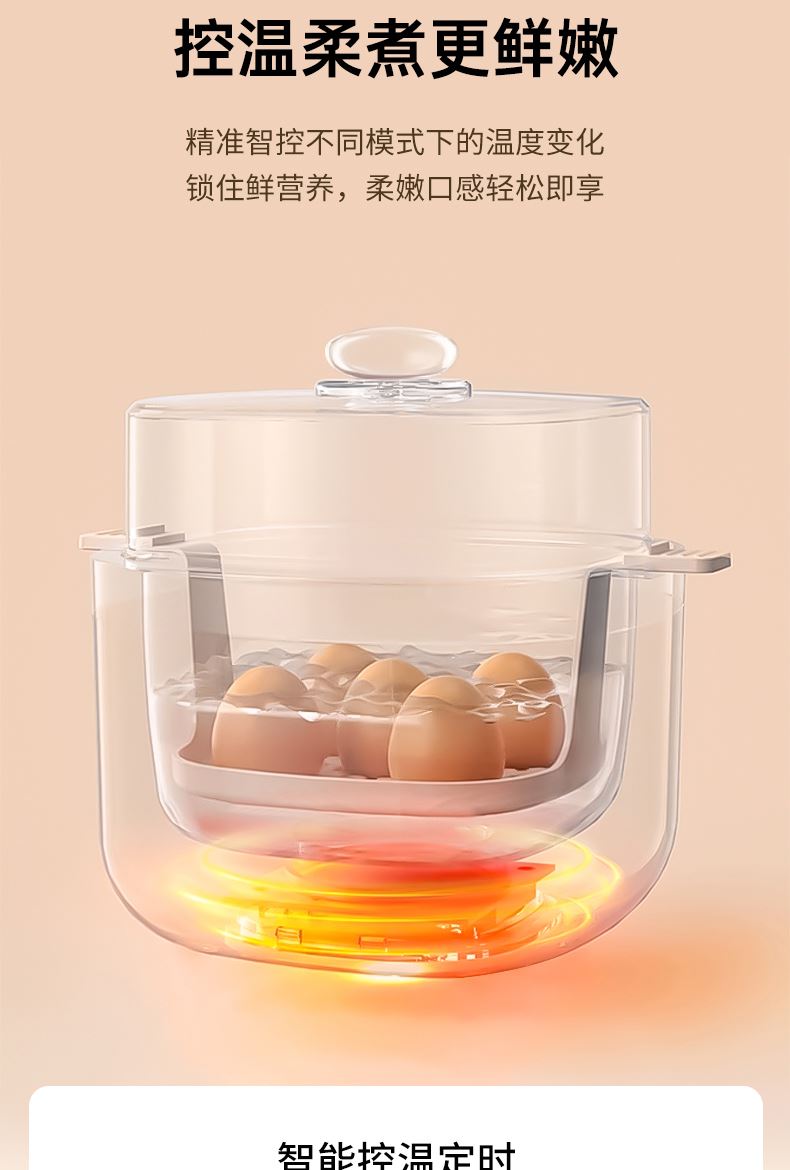 产品颜色:陶白色 规格:煮蛋5枚 额定功率:200W 产品净重:0.83KG 产品尺寸:150*150*215mm 清单:主机、蒸蛋篮、304不锈钢蛋羹碗 NTC控温,鲜嫩口感与营养共存. 配送蒸笼,上蒸下煮。 24小时智能预约。 智能触控9大模式一键操作。 透明可视窗口,配送蒸蛋篮、不烫手 烹煮过后自动断电防止干烧。 配送304不锈钢蛋羹碗,水垢易清洗。