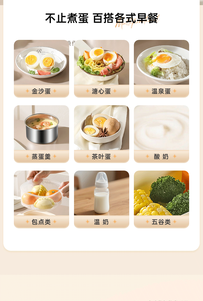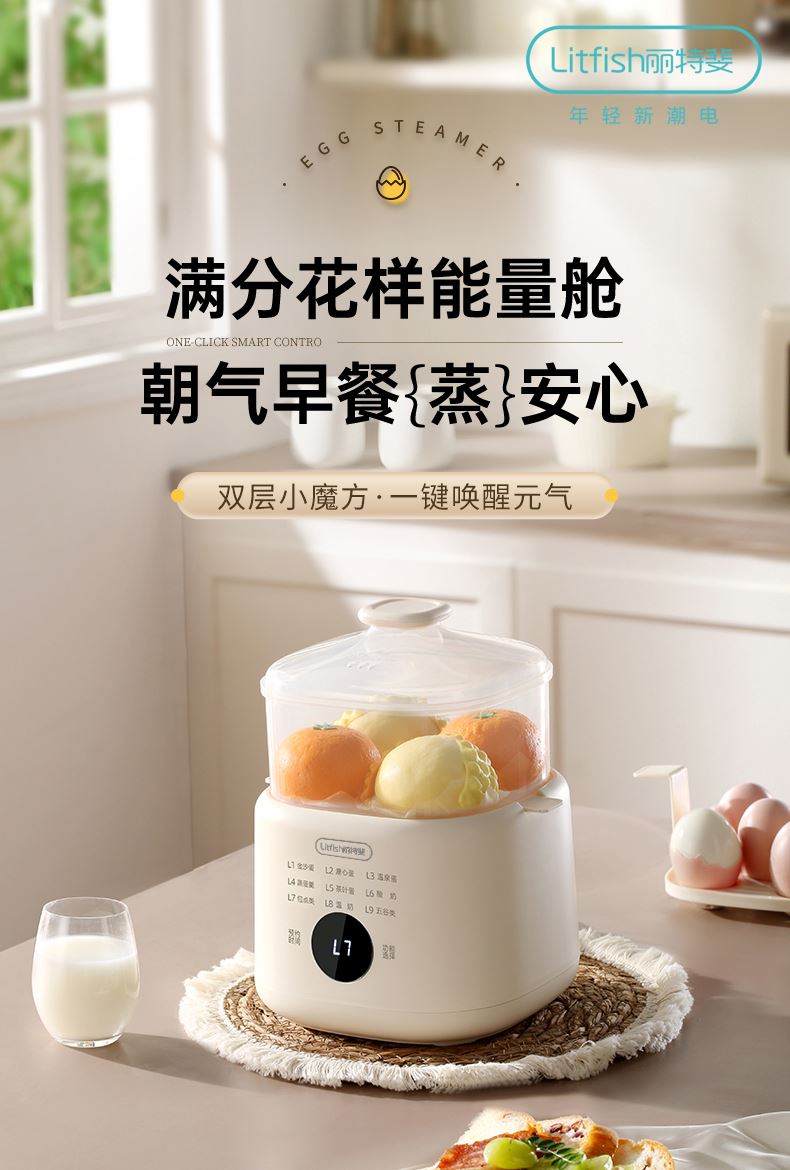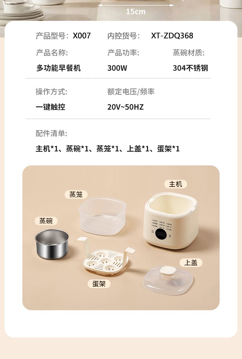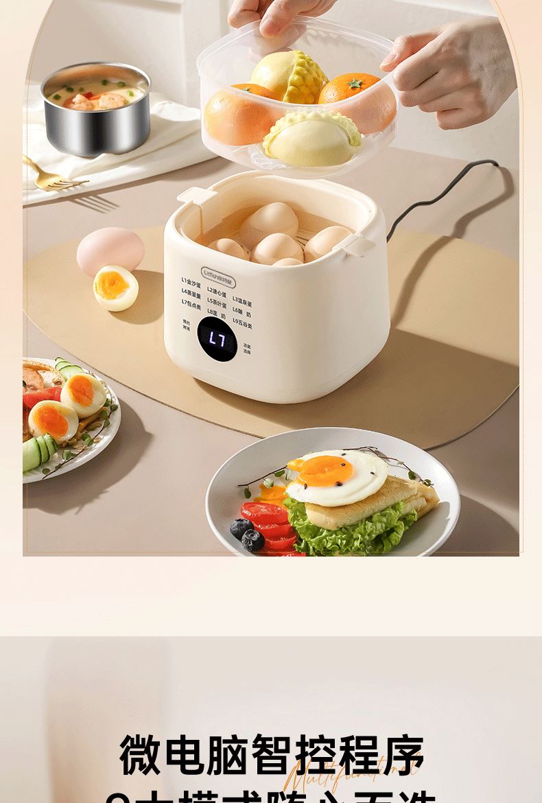 产品颜色:陶白色 规格:煮蛋5枚 额定功率:200W 产品净重:0.83KG 产品尺寸:150*150*215mm 清单:主机、蒸蛋篮、304不锈钢蛋羹碗 NTC控温,鲜嫩口感与营养共存. 配送蒸笼,上蒸下煮。 24小时智能预约。 智能触控9大模式一键操作。 透明可视窗口,配送蒸蛋篮、不烫手 烹煮过后自动断电防止干烧。 配送304不锈钢蛋羹碗,水垢易清洗。
