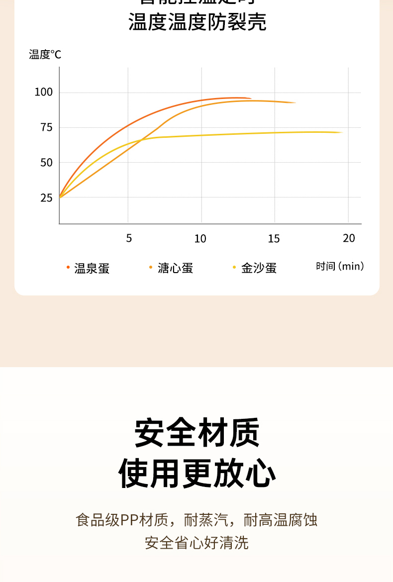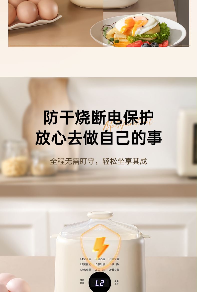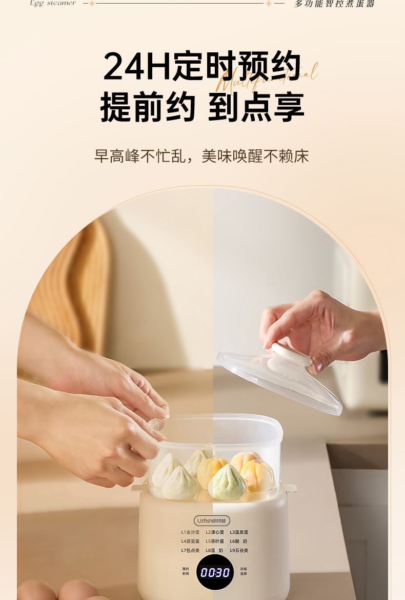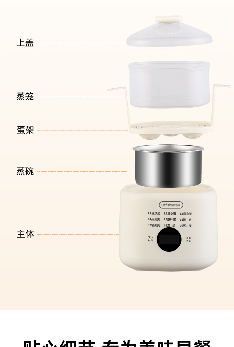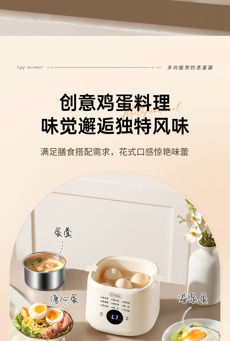 产品颜色:陶白色 规格:煮蛋5枚 额定功率:200W 产品净重:0.83KG 产品尺寸:150*150*215mm 清单:主机、蒸蛋篮、304不锈钢蛋羹碗 NTC控温,鲜嫩口感与营养共存. 配送蒸笼,上蒸下煮。 24小时智能预约。 智能触控9大模式一键操作。 透明可视窗口,配送蒸蛋篮、不烫手 烹煮过后自动断电防止干烧。 配送304不锈钢蛋羹碗,水垢易清洗。