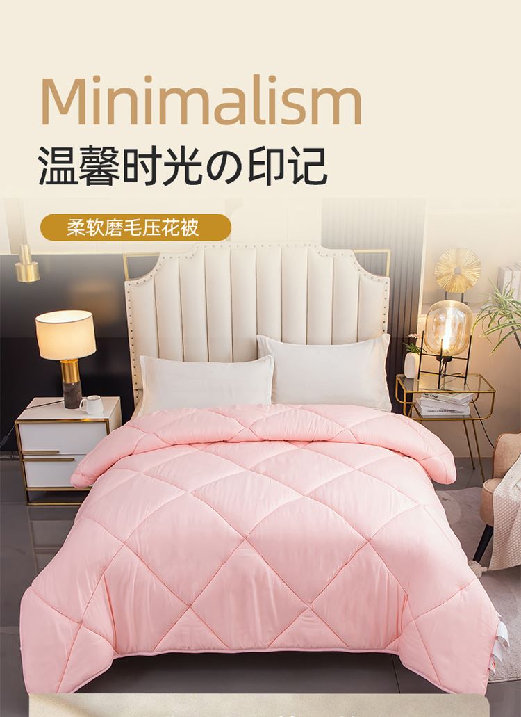 产品面料:亲肤磨毛 产品填充:超细纤维 产品尺寸: 200*230cm 产品重量:约2000g 包装:彩盒