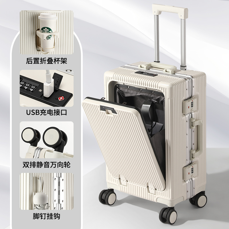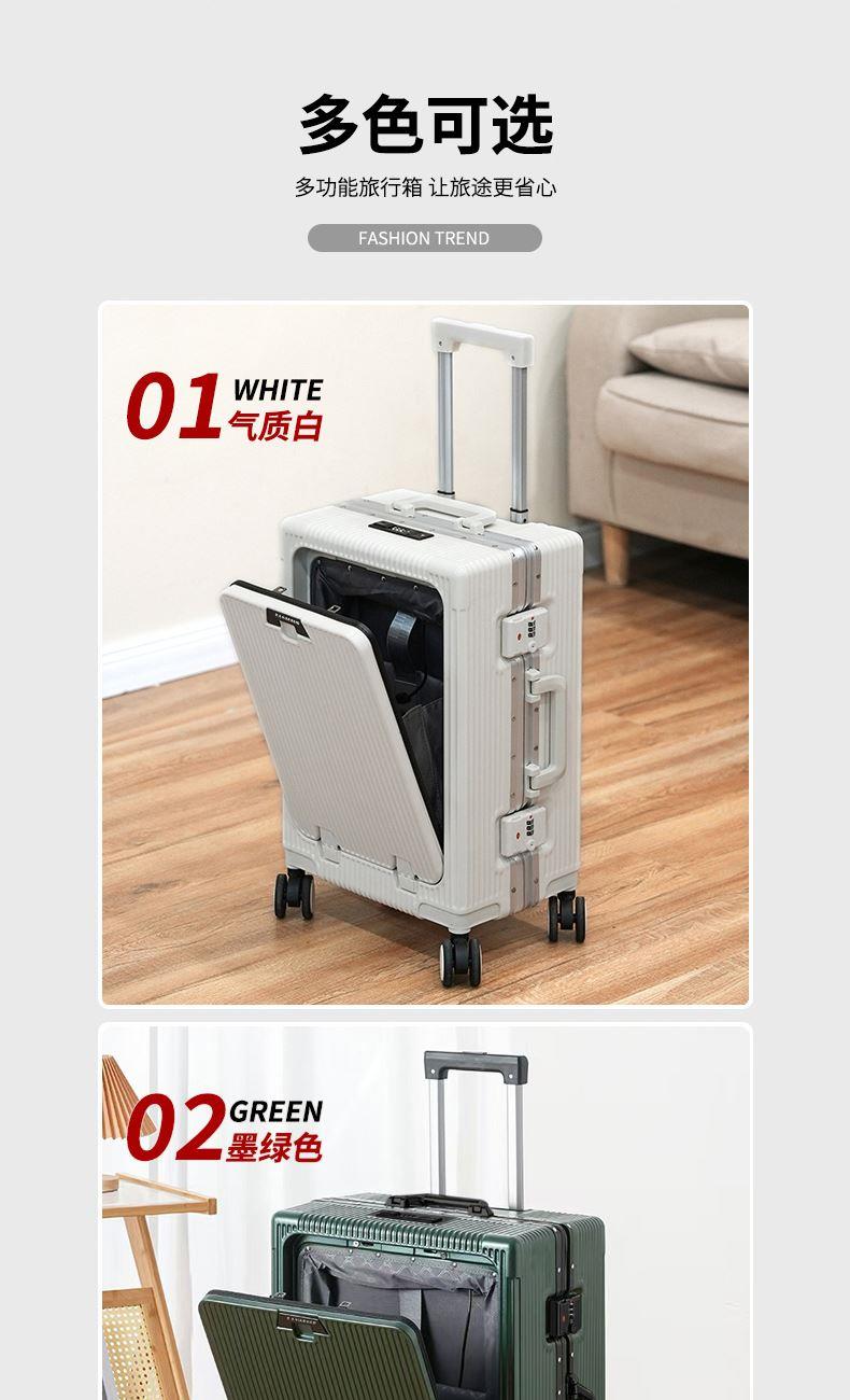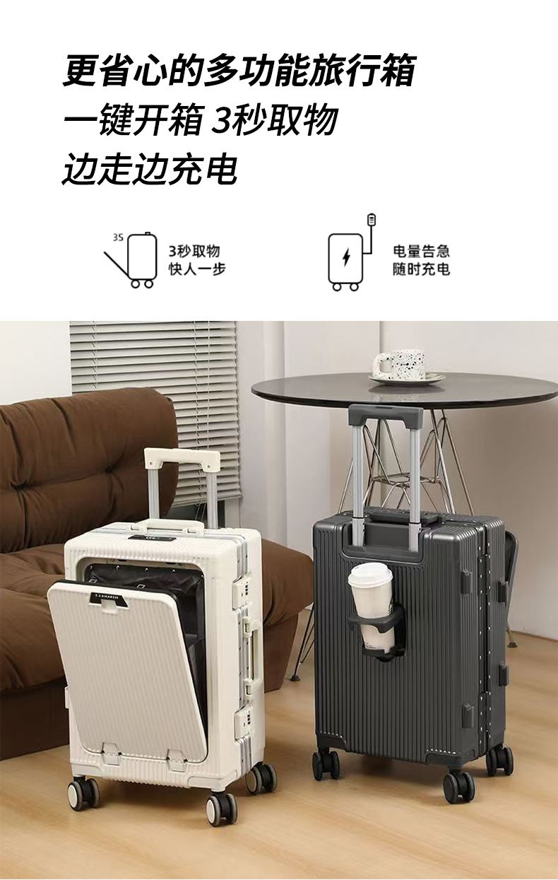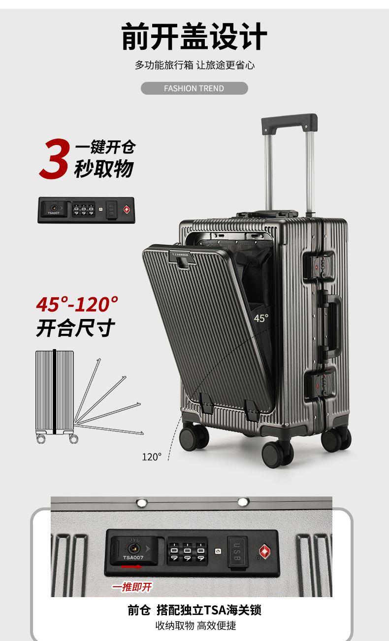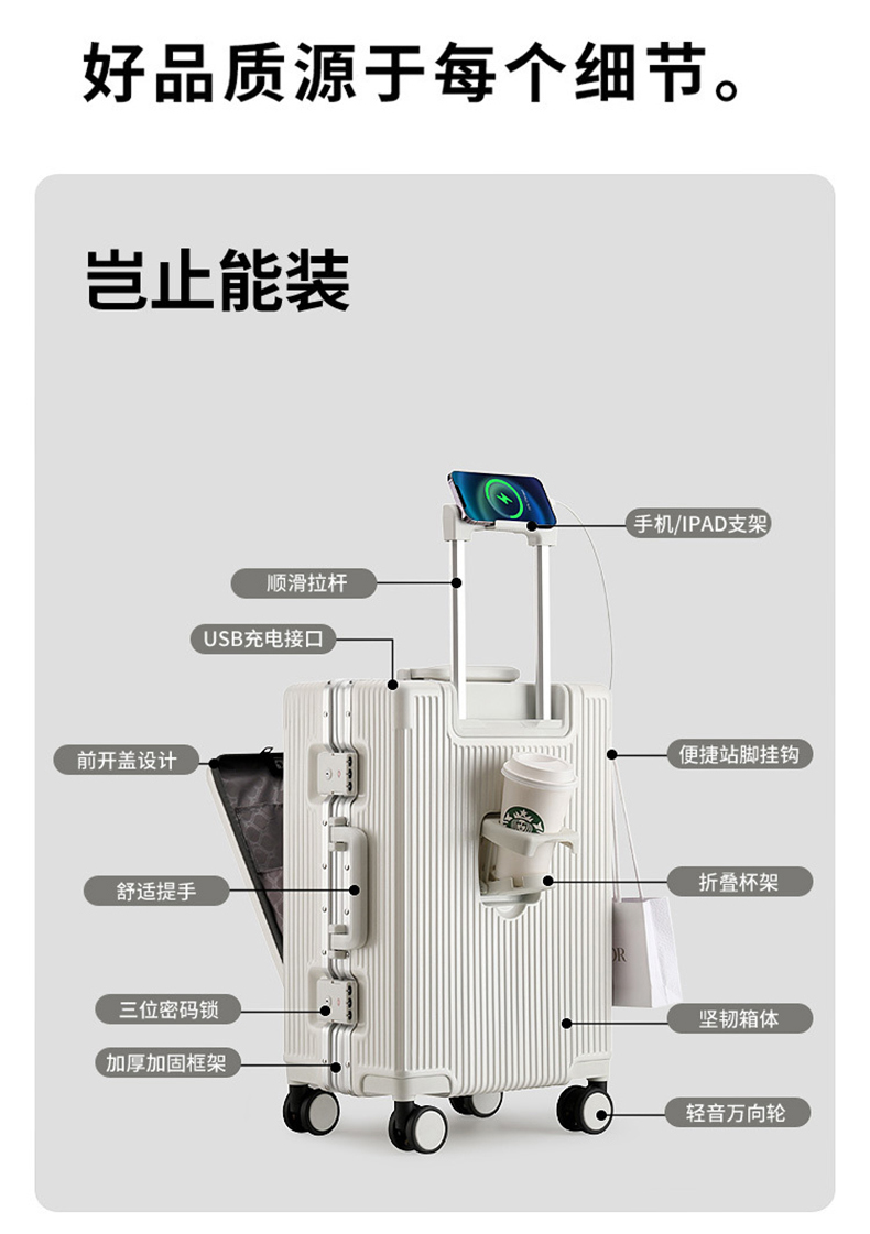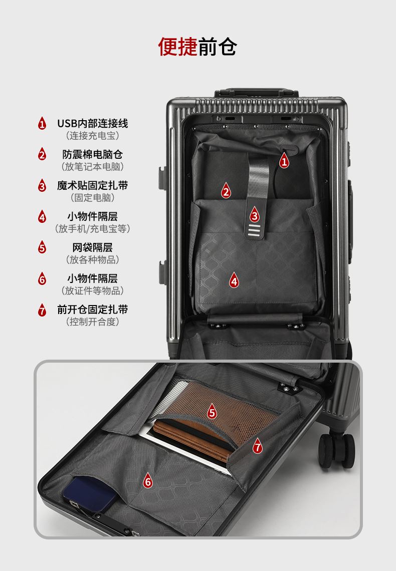 1、前开盖设计,可放笔记本电脑,前开盖拥有多隔层储物空间;2、加厚ABS+PC箱体外壳及铝框和合页,防刮坚固,耐磨防爆;3、加厚合金伸缩拉杆,稳固顺畅,握手处带手机支架功能,方便实用;4、带慢回弹顶部和侧部提手,竖提横提都方便;5、侧部顶脚及前部带方便行李挂架功能;6、带USB充电口,隐藏式可折叠多功能杯架,出行更方便;7、干湿分离,分区合理;8、前开盖带海关密码锁,可独立使用,取放方便,箱体带双嵌入式三码密码锁,安全性高,放心旅行;9、TPE万向静音飞机轮,高承重,肆意而行。