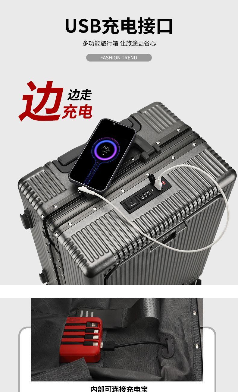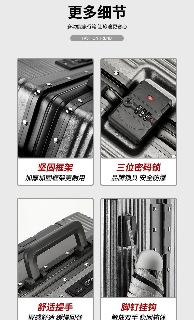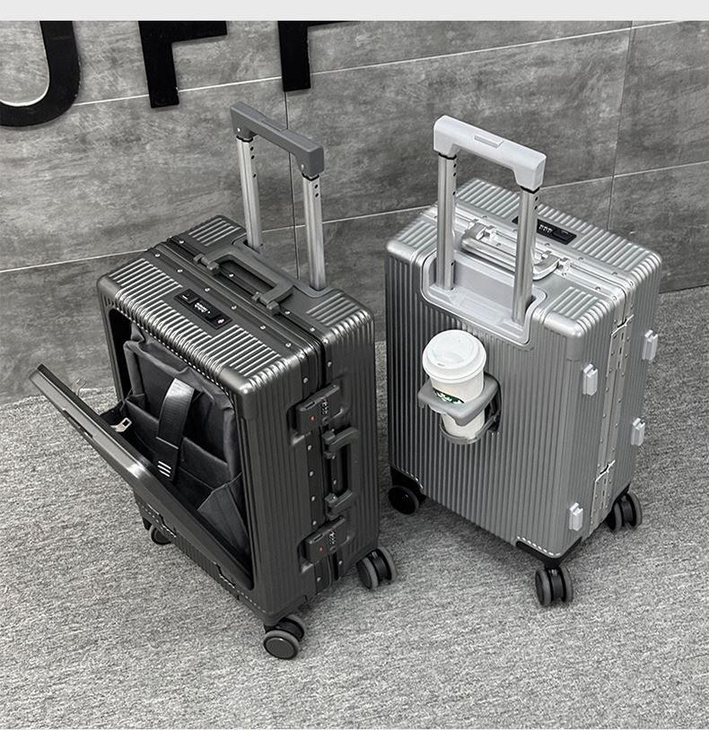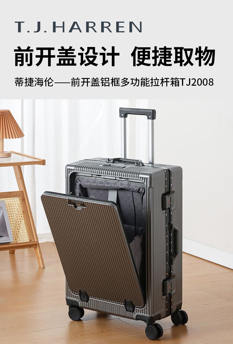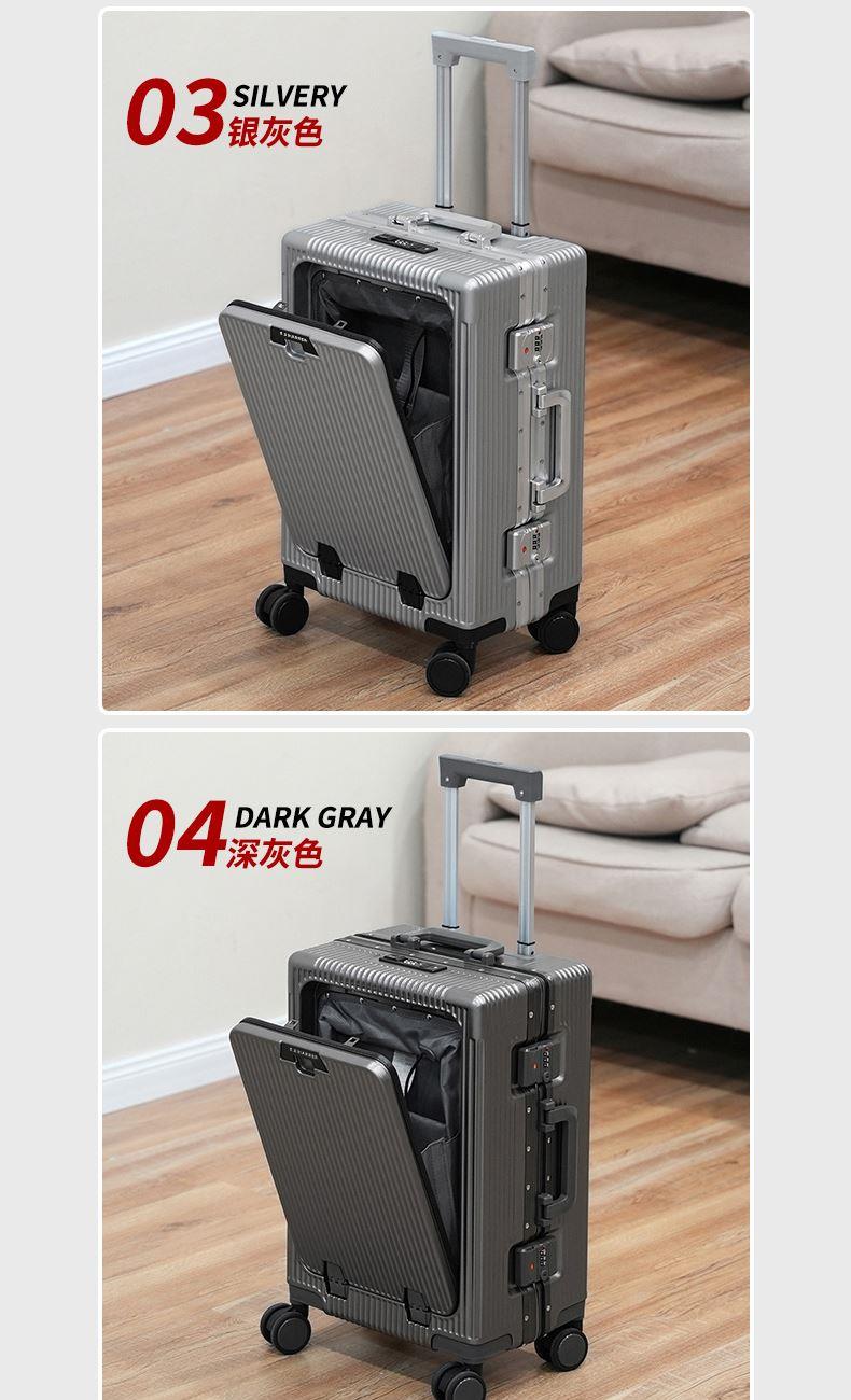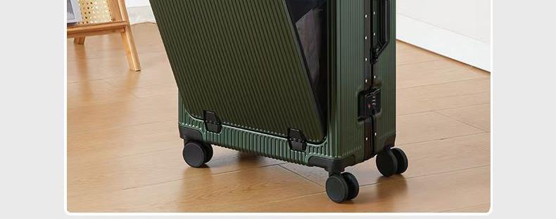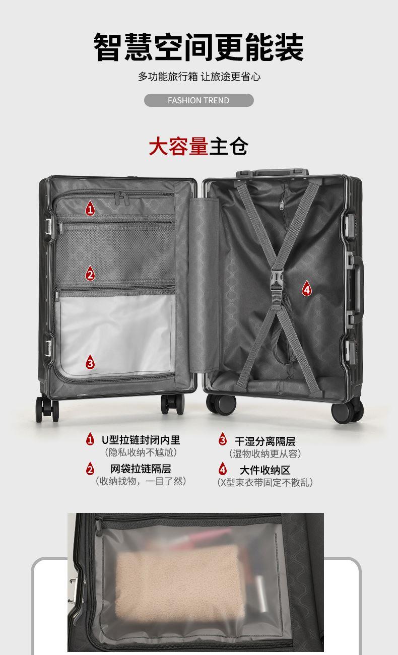 1、前开盖设计,可放笔记本电脑,前开盖拥有多隔层储物空间;2、加厚ABS+PC箱体外壳及铝框和合页,防刮坚固,耐磨防爆;3、加厚合金伸缩拉杆,稳固顺畅,握手处带手机支架功能,方便实用;4、带慢回弹顶部和侧部提手,竖提横提都方便;5、侧部顶脚及前部带方便行李挂架功能;6、带USB充电口,隐藏式可折叠多功能杯架,出行更方便;7、干湿分离,分区合理;8、前开盖带海关密码锁,可独立使用,取放方便,箱体带双嵌入式三码密码锁,安全性高,放心旅行;9、TPE万向静音飞机轮,高承重,肆意而行。