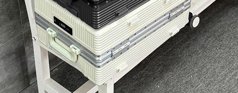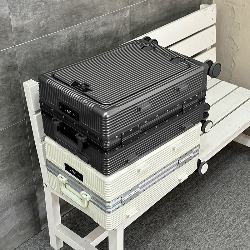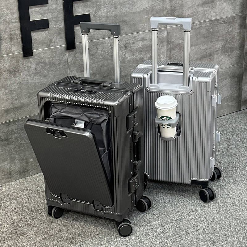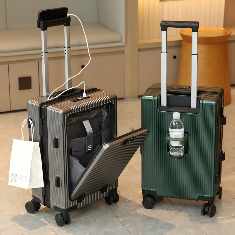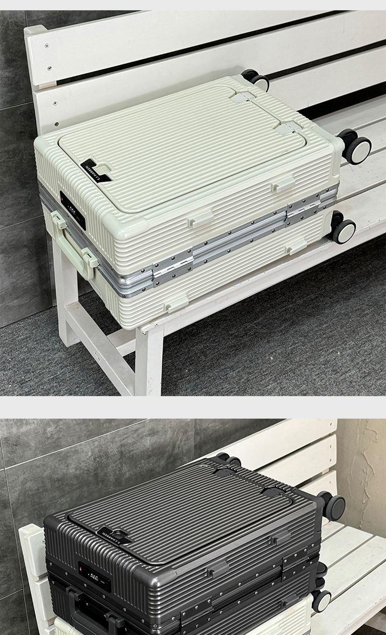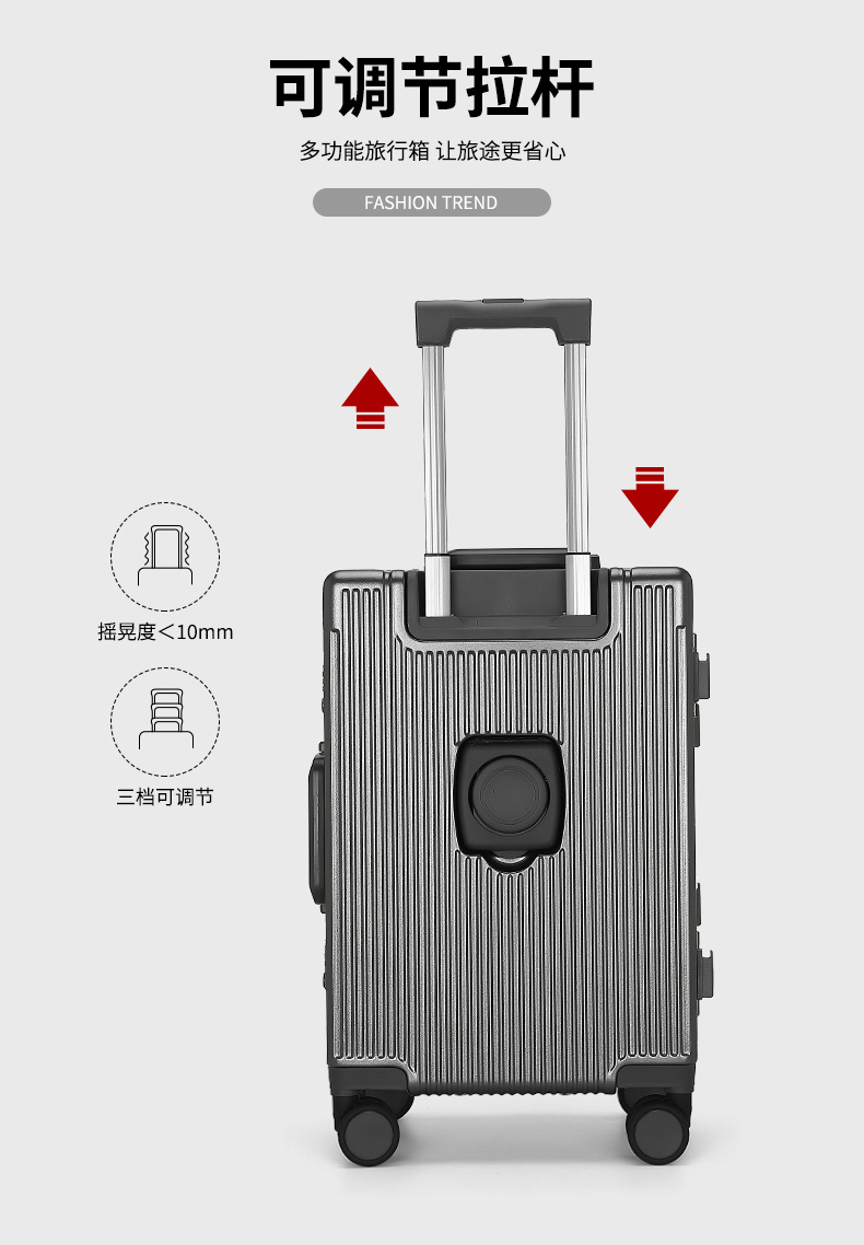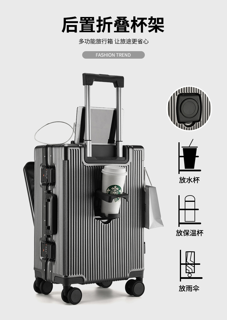 1、前开盖设计,可放笔记本电脑,前开盖拥有多隔层储物空间;2、加厚ABS+PC箱体外壳及铝框和合页,防刮坚固,耐磨防爆;3、加厚合金伸缩拉杆,稳固顺畅,握手处带手机支架功能,方便实用;4、带慢回弹顶部和侧部提手,竖提横提都方便;5、侧部顶脚及前部带方便行李挂架功能;6、带USB充电口,隐藏式可折叠多功能杯架,出行更方便;7、干湿分离,分区合理;8、前开盖带海关密码锁,可独立使用,取放方便,箱体带双嵌入式三码密码锁,安全性高,放心旅行;9、TPE万向静音飞机轮,高承重,肆意而行。