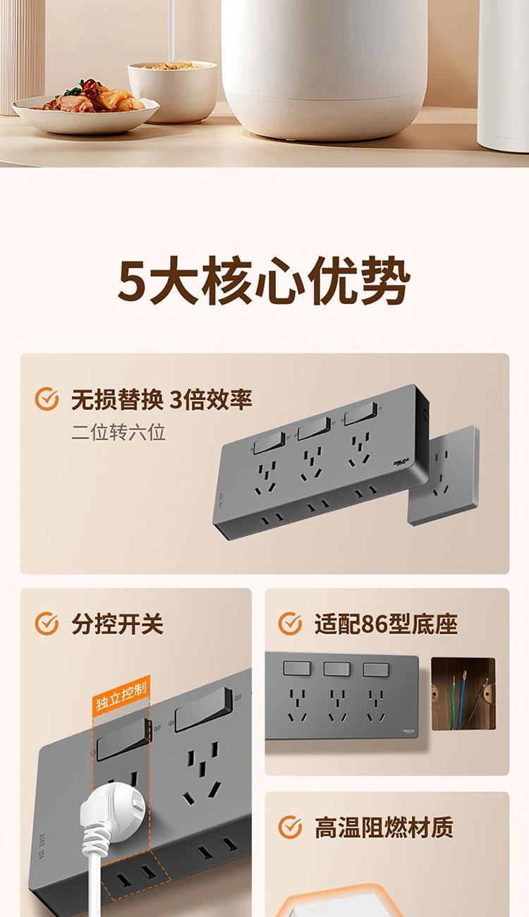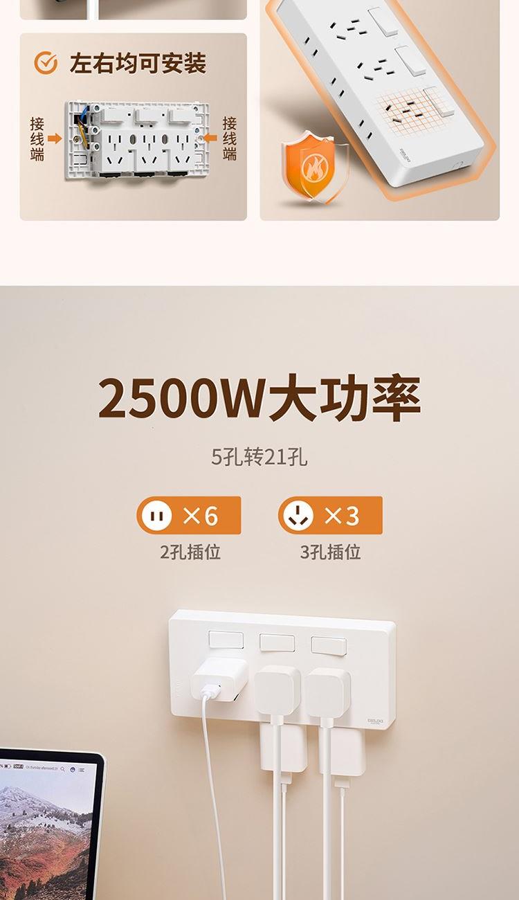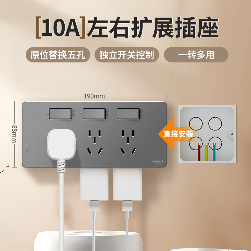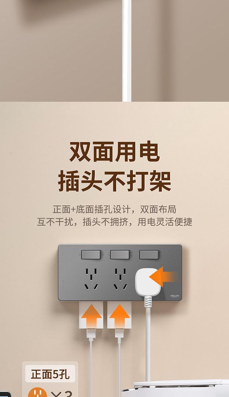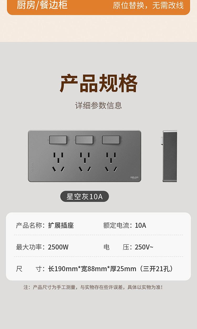产品:德力西电气 DETC系列二十一孔插座10A 品 牌:德力西电气 产品型号:DETC-X21(H) 产品颜色:星空灰 额定电流:10A 额定电压:250V 插座尺寸:190*88*25mm 产品位数:三位三孔、三位两孔、无线(需要自行接线)