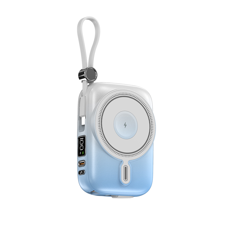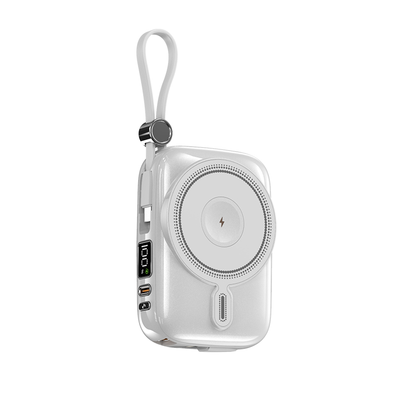 奥苏米3C认证商务磁吸无线充快充移动电源 型 号: 106S 电池 :21700*2pcs 电池类型 :动力电芯 容量:10000mAh 材质 :ABS+PC 尺寸 :82*62*28.5mm 颜色 :珍珠白 功能特点 简约设计风格,时尚大气; 磁吸15WK快充 22.5W超级快充,迅速充电; 10000mAh锂电池,澎湃动力; 自带线可插拔, 自带苹果和Type-C充电线都的快充 可双项快充,支持苹果15手机 智能数显查看电量