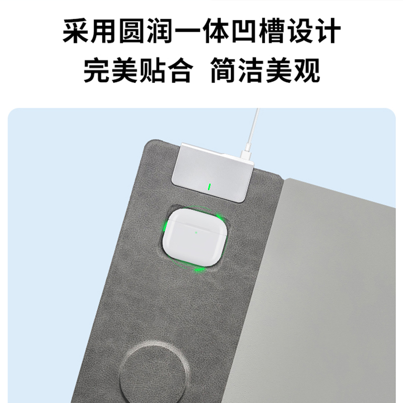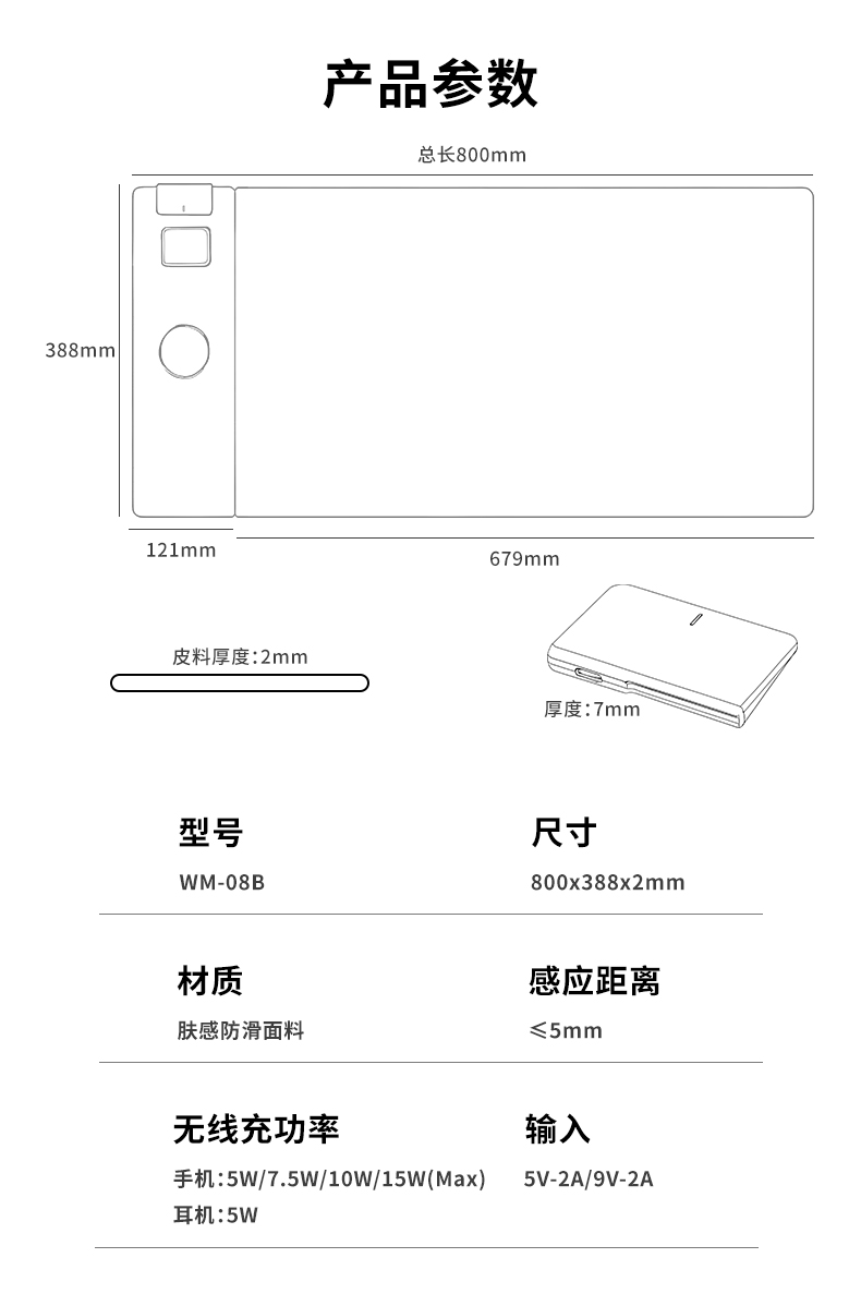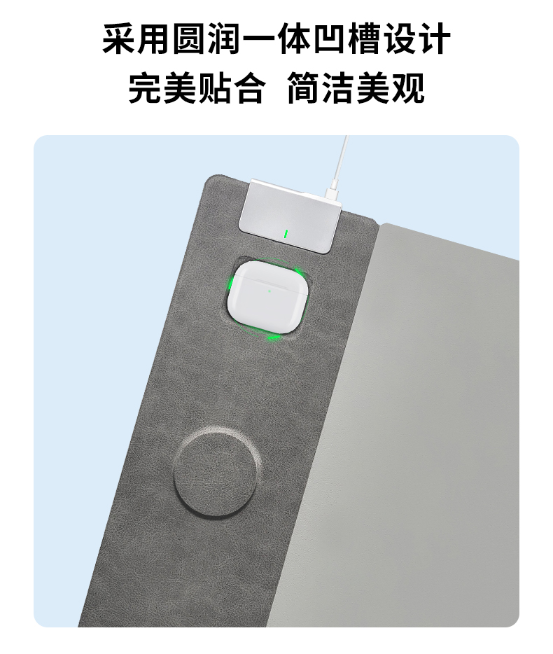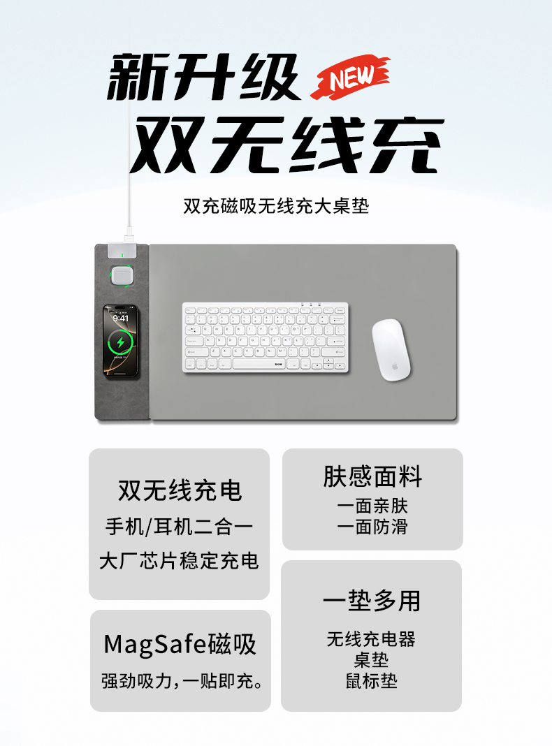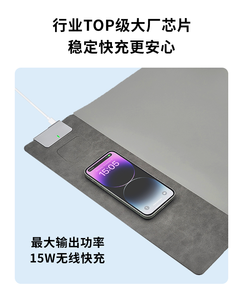 型号:WM-08 材质工艺:肤感防滑PU 手机功率:15W/10W/7.5W/5W 耳机功率:5W 传输距离:≤5mm 产品尺寸:800x388x2mm 产品颜色:灰色 手机/耳机二合一无线充 MagSafe磁吸无线充电,一触即充,让充电变得如此简单 15W(Max)无线快充:智能匹配手机,自动调节电流,避免杂乱无章的线,让充电更便捷整洁。 超大尺寸:388*800mm 的大规格,满足鼠标自由移动,摆脱束缚。 优质皮纹面料:触感细腻,亲肤顺滑,带来舒适体验。 多场景适用:适用于办公桌、书桌、电脑桌、茶桌等各类场景。 ​多功能用途:鼠标垫,​桌垫、印章垫、练字垫(增强纸张与笔的摩擦力,减少滑笔,提升控笔稳定性,让书写更美观)等功能于一体,简化桌面布置 桌垫下方可收纳草稿纸,充分利用空间。