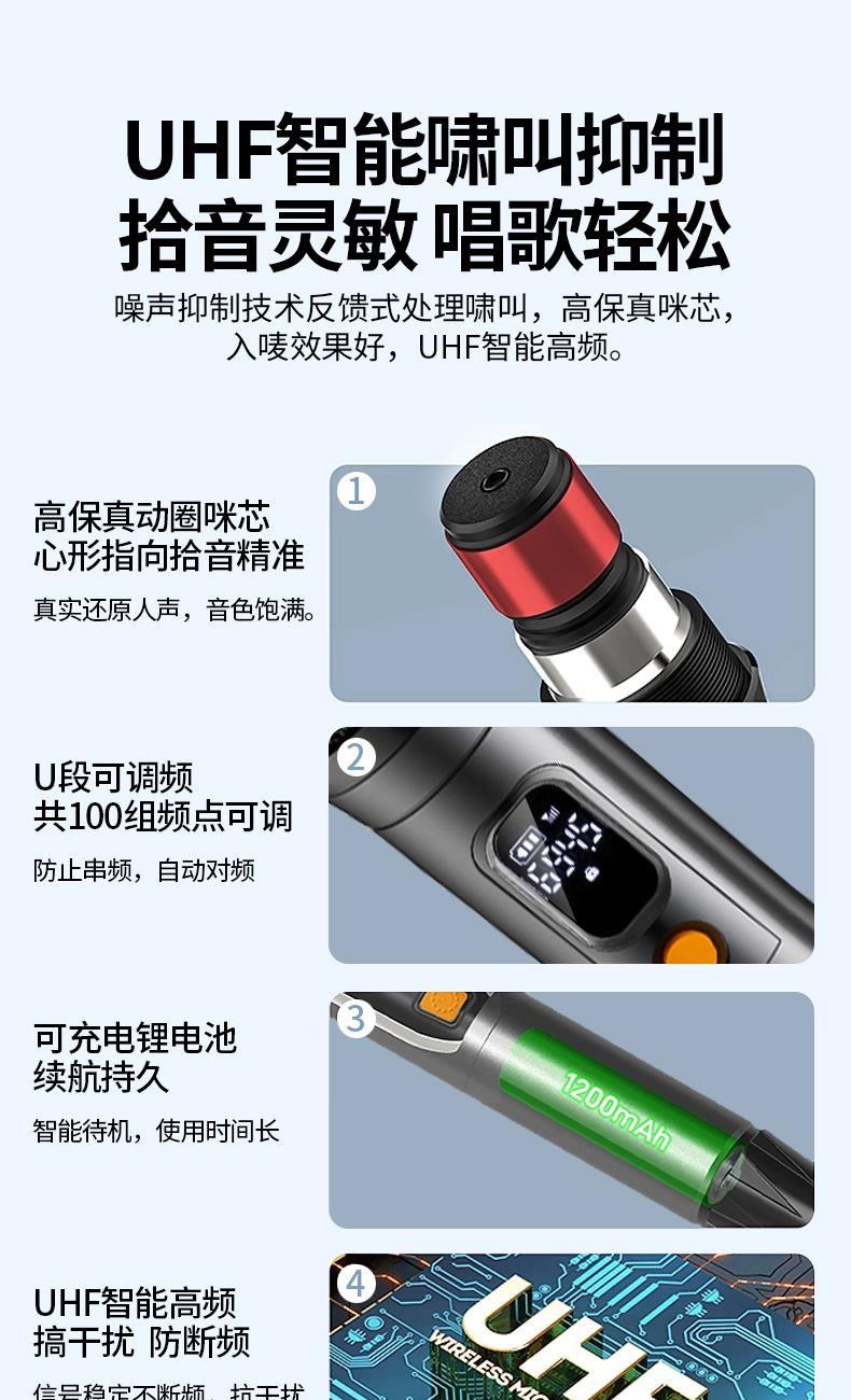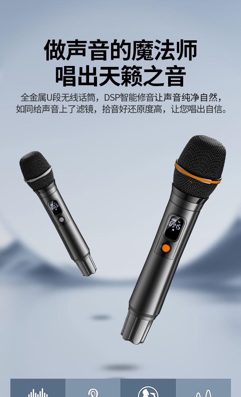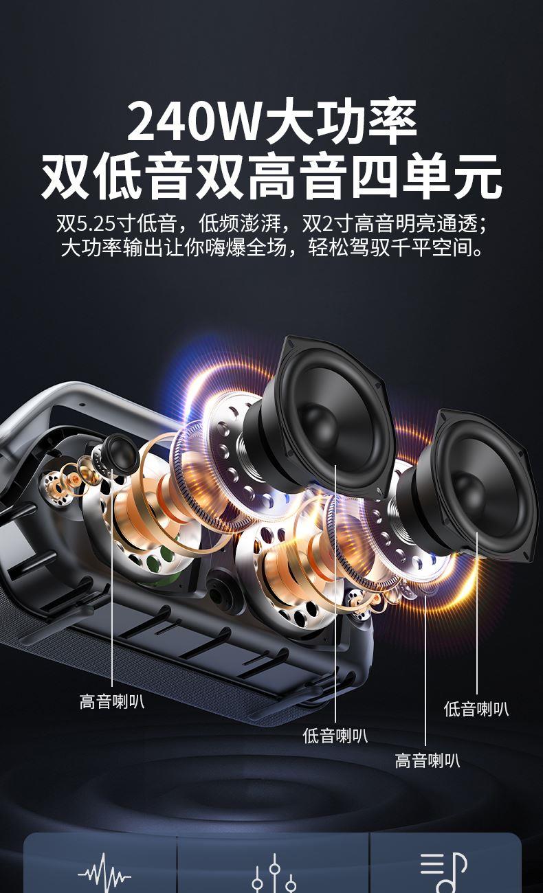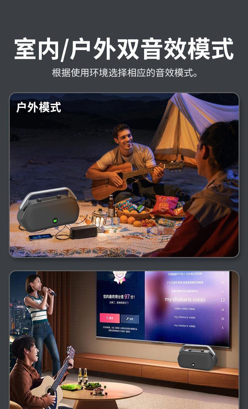蓝牙版本:蓝牙5.3 传输距离:10-20米 喇叭尺寸:5.25”×2+1.25”×2 电池容量:11.1V/6000mAh 输出功率:120W 充电电压:15V/2A 充电时间:约3小时(快充) 播放时间:约4小时 产品重量:约5.4kg 产品颜色:黑灰色 产品尺寸:L430×W150×H238mm 支持功能:蓝牙/TF卡/AUXIN/U盘/卡拉OK 支持读U盘TF卡音乐格式:MP3/WMA/WAV DSP动态音效,在小音量情况下,也能享受澎湃低音 双音效模式,是室内/户外使用皆宜 一键开机,开机更迅速.IPX7防水,无惧水浸 Bluetooth5.3连接更快,更稳定 TYPE-C接口充电(支持快充功能) 5种音源输入给你更多选择 60W超大功率输出让你嗨爆全场 配2支无线麦克风,娱乐K歌尽情享受音乐的魅力 纯正美国魔声音效