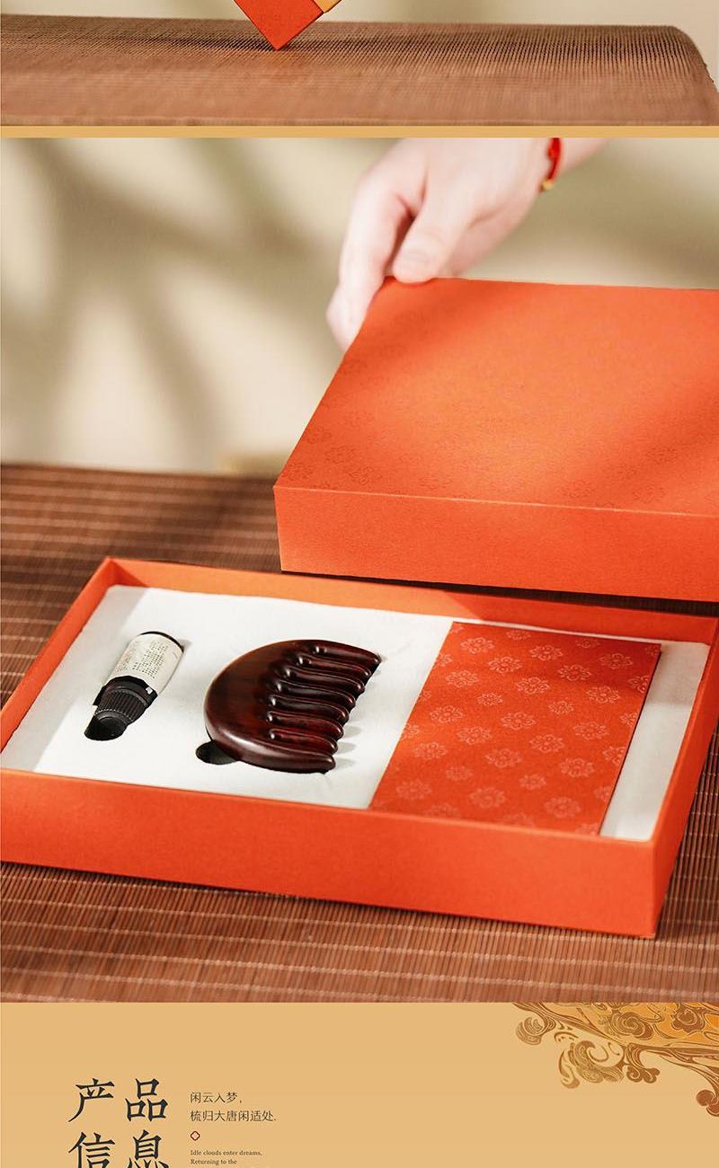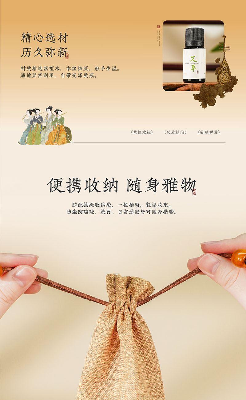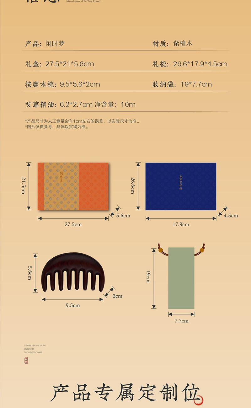 产品清单 按摩木梳*1 艾草精油*1 礼盒*1 礼袋*1 产品 / Product Mini 闲时梦 材质 / Material 紫檀木 规格 / Size 礼盒:27.5*21*5.6cm 礼袋:26.6*17.9*4.5cm 按摩木梳:9.5*5.6*2cm 收纳袋:19*7.7cm 艾草精油:6.2*2.7cm 净含量:10ml *产品尺寸为人工测量会有1cm左右的误差,以实际尺寸为准