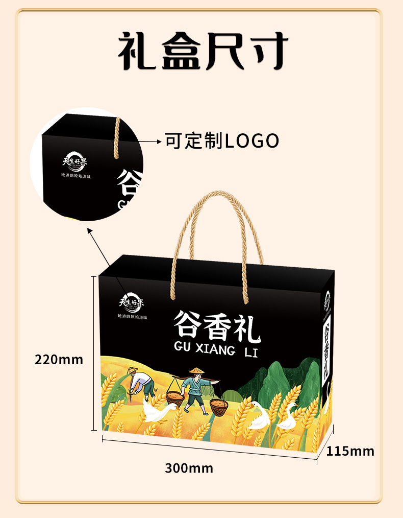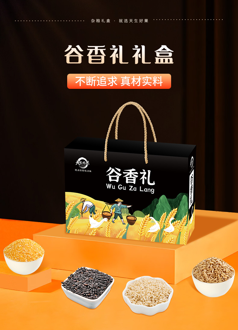 天生好果杂粮组合! 礼盒尺寸:300*115*220mm 天生好果玉米糁400克 天生好果黑米400克 天生好果糙米400克 天生好果燕麦米400克