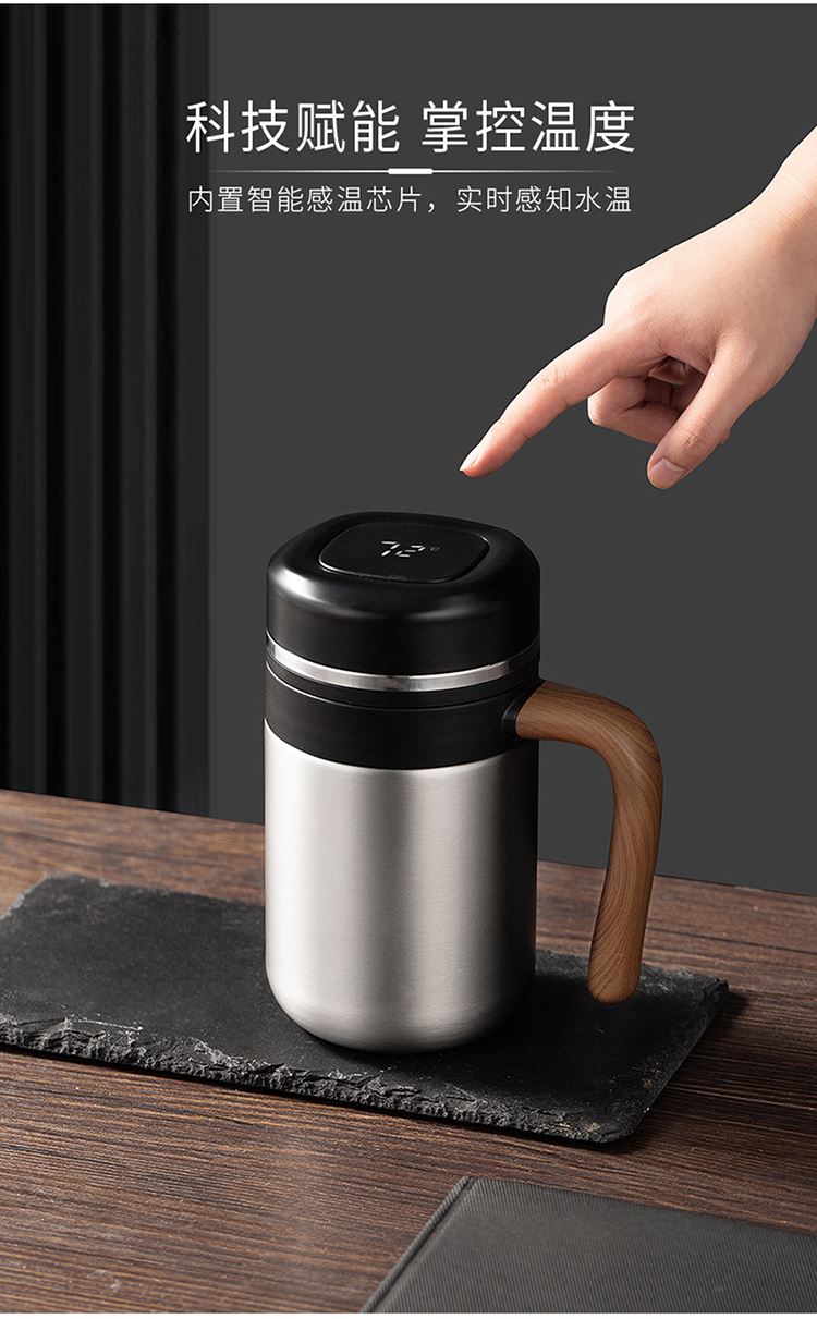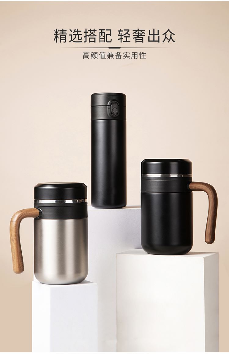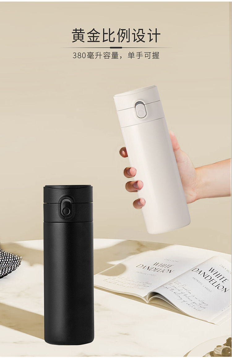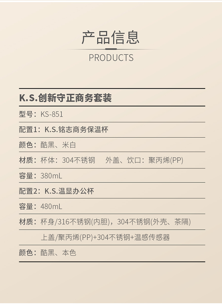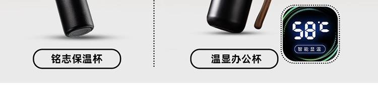 •材质:1.保温杯:杯体/304不锈钢。外盖、饮口/聚丙烯(PP) 2.温显办公杯 :杯身/316不锈钢(内胆) 304不锈钢(外壳、茶隔)上盖/聚丙烯(PP)+304不锈钢+温感传感器 •规格: 保温杯:380ML 温显办公杯 :480ML •包装:礼盒(配礼袋) 商务经典礼盒套装,以金色和黑色为配色主调,凸显其轻奢高雅、商务端庄的产品属性。是作为商务往来伴手礼、周年庆典、会议、节日慰问、活动营销礼的佳选礼品。 套盒配有316不锈钢温显把手杯一个、304不锈钢商务保温杯一只。做工精致、品质上乘,时尚简约。 礼盒、礼袋、内容物件上均可实现中小批量成品订制,全套订制方案输出,为企业宣传添砖助力。