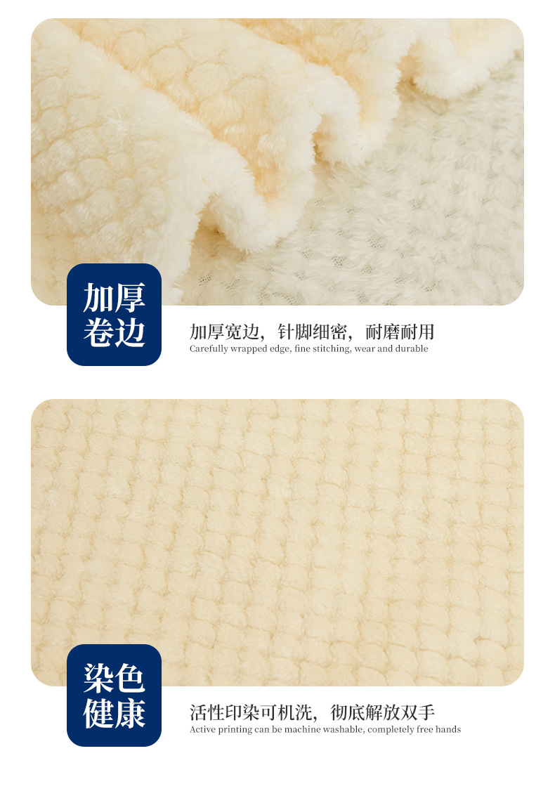 法兰绒菠萝格午睡毯:220克D丝法兰绒,100*150cm重420g,表面覆盖了超柔软的法兰绒绒毛,编织紧密,手感柔顺机洗不掉毛,采用活性印染工艺,更亲肤贴身,卷边工艺,有效固定毛毯边缘,细节满满